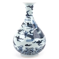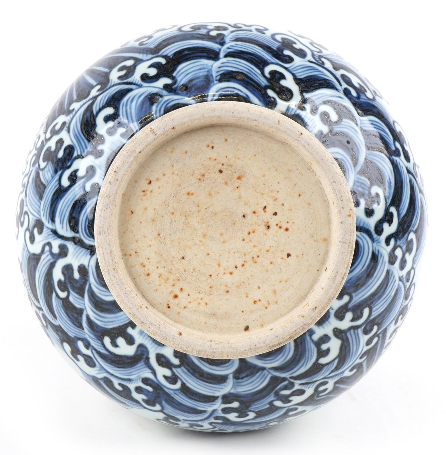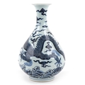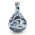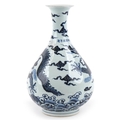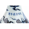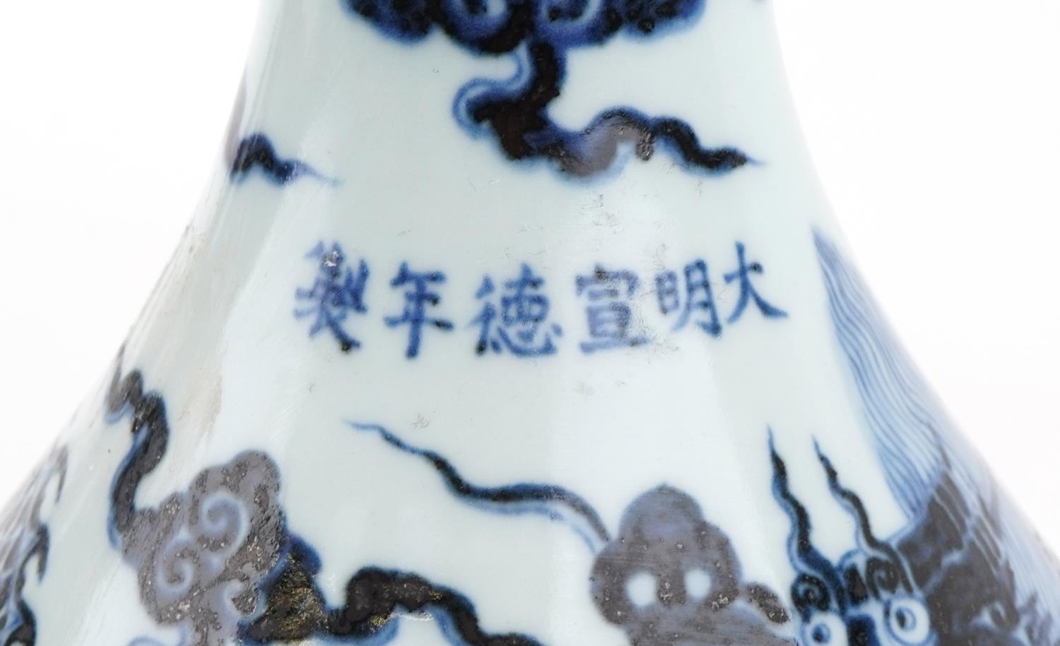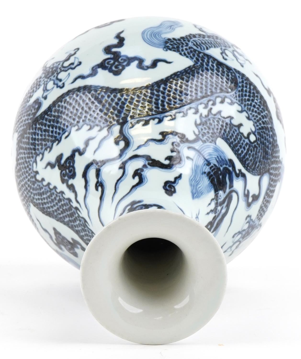 A Chinese blue and white porcelain baluster vase, hand painted with a dragon, clouds and sea, six figure character marks to the side, 34cm high.