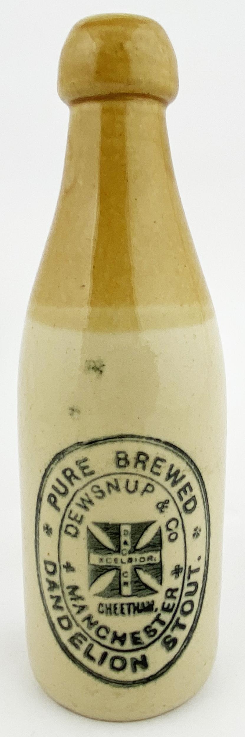 MANCHESTER GINGER BEER BOTTLE. 8.2ins tall, ch., t.t., cork lip, Price Bristol p.m. DEWSNUP & CO/ DANDELION STOUT with cross like central t.m. A very rarely seen Lancashire ginger for an unusual product.