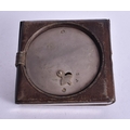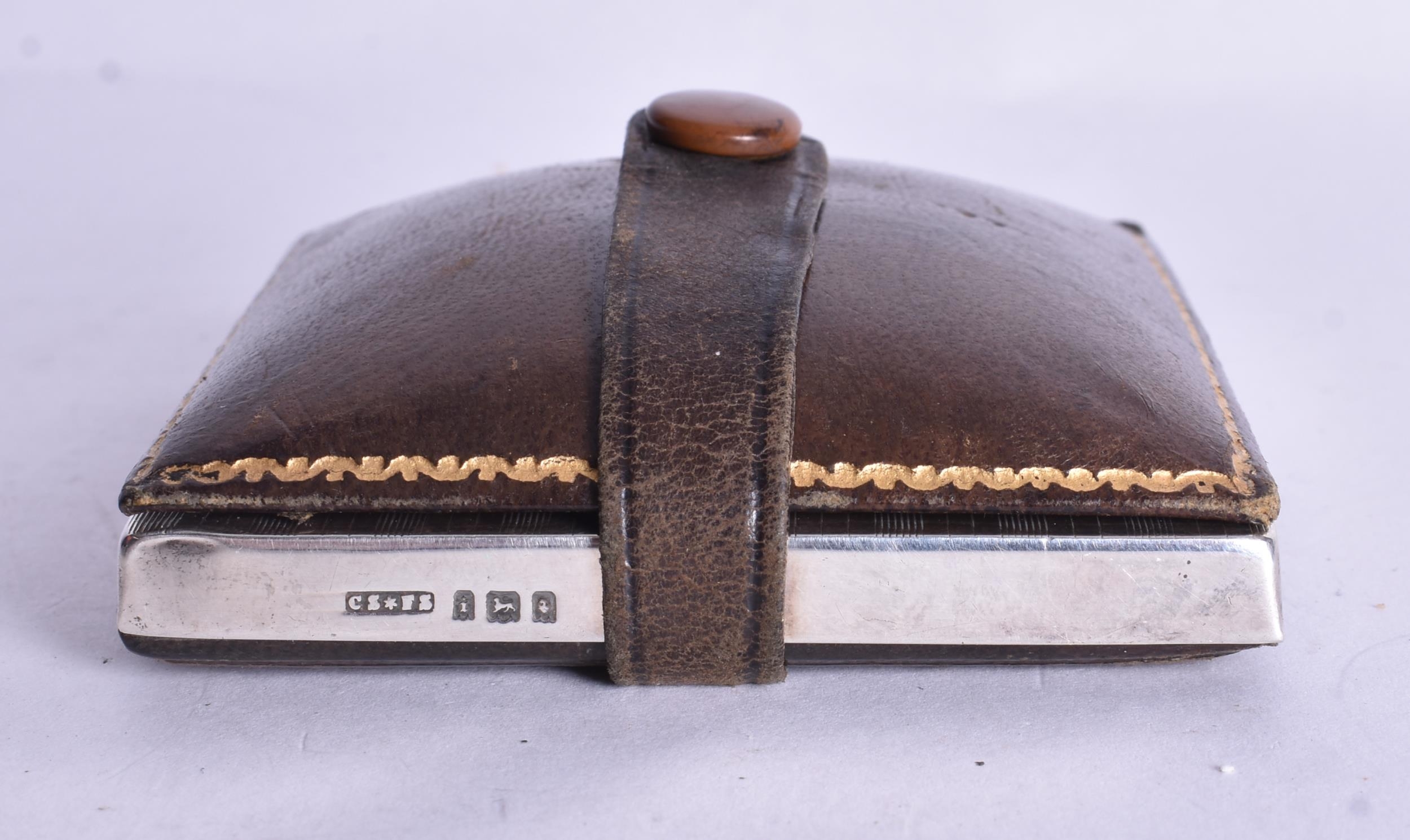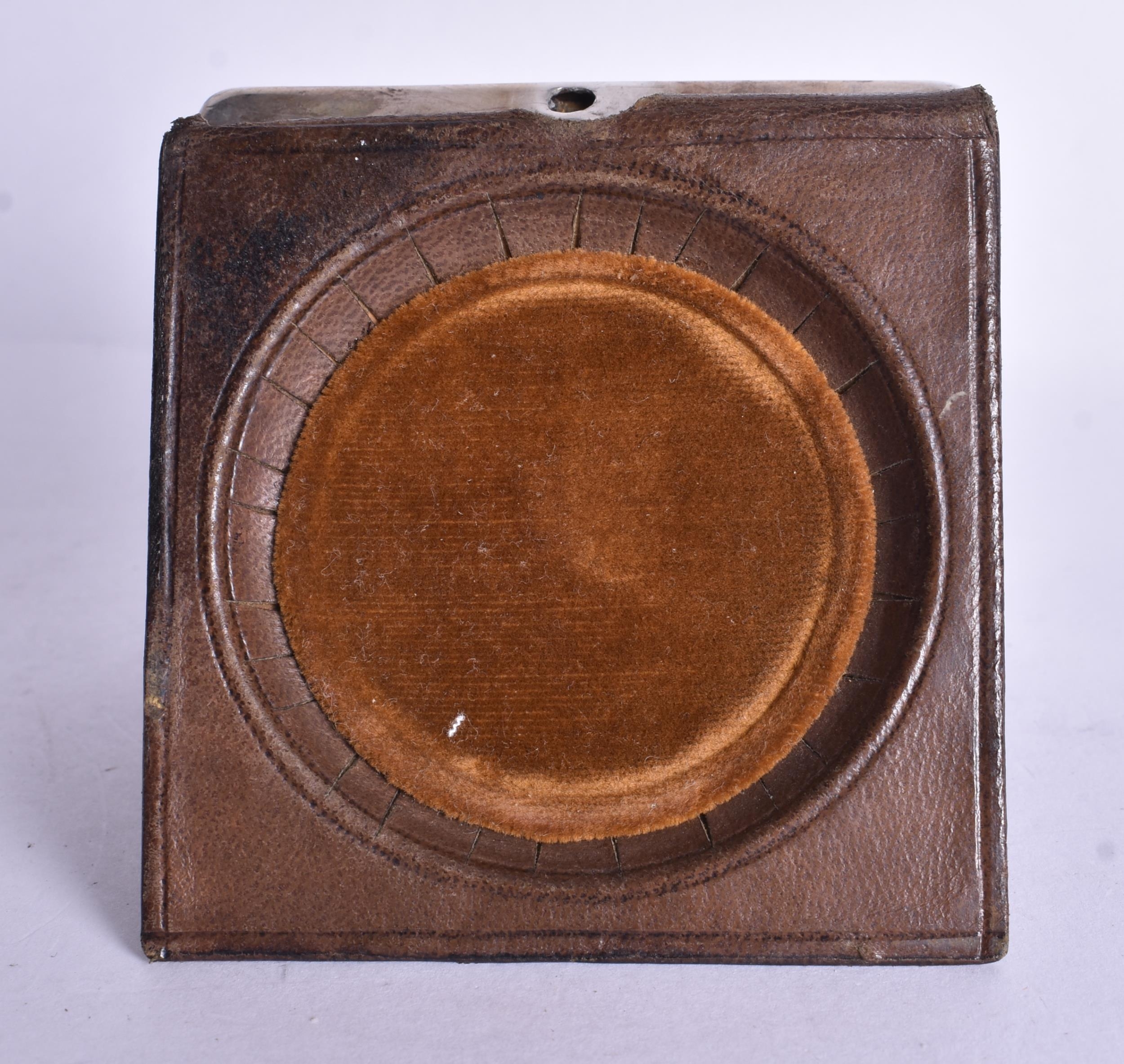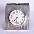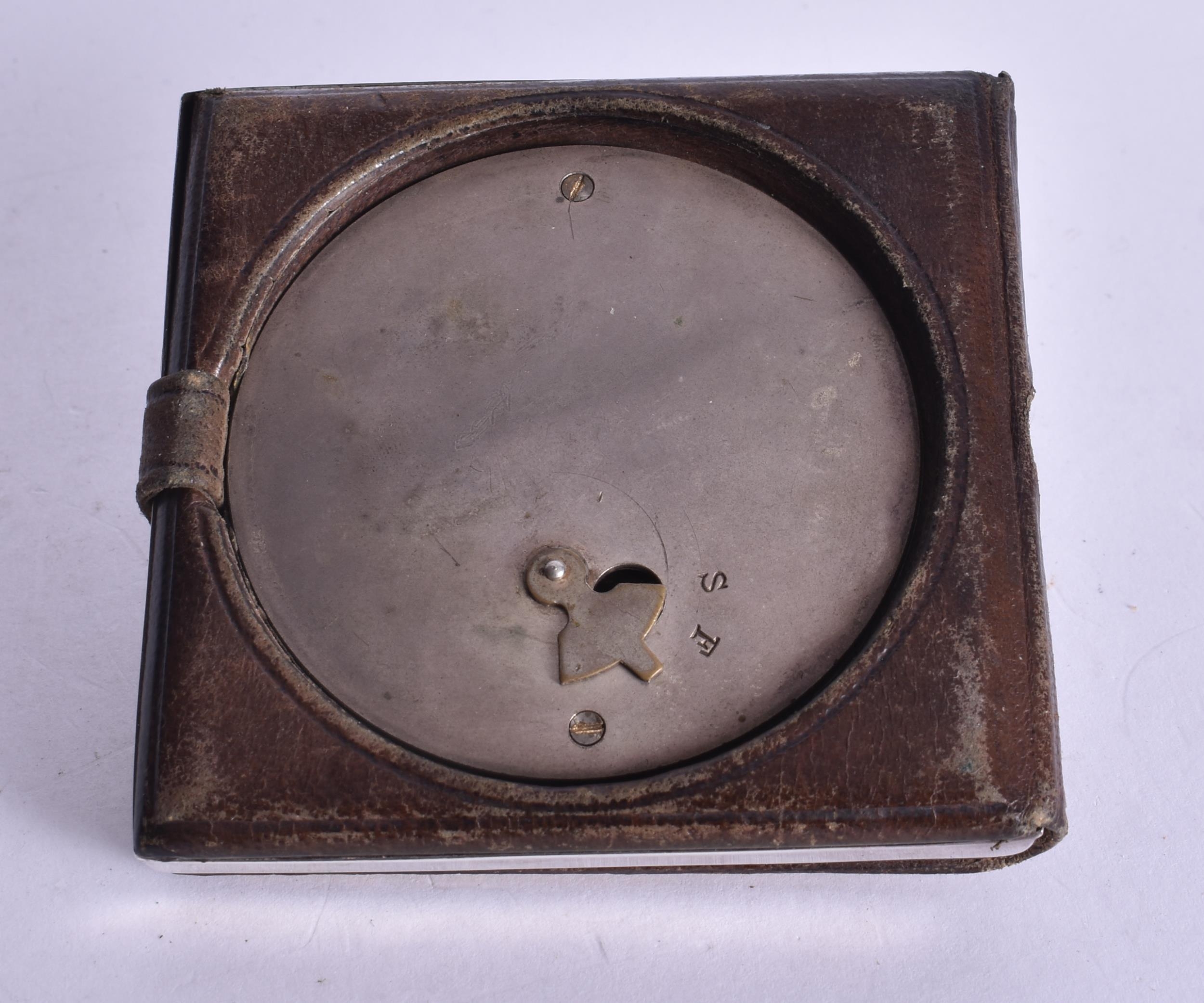 A Silver Cased Travel Clock with a fitted Leather Cover. Not working. Hallmarked London 1924. 7.6cm x 7.4cm x 2.2cm