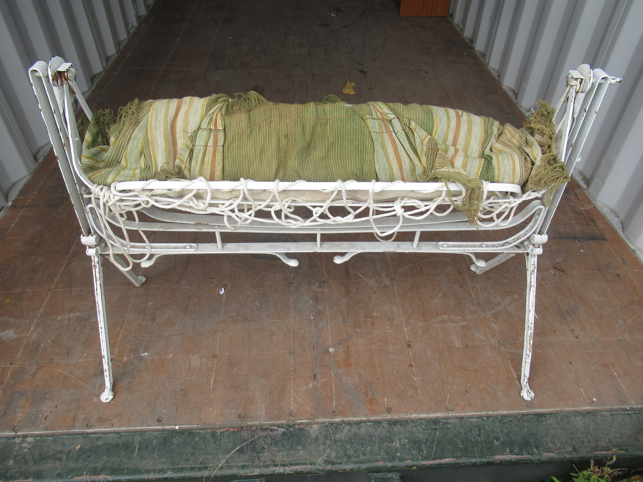 Early C20th wrought metal childs folding rocking crib, with rope tied canvas sling and a hammock W114 H80cm (2)