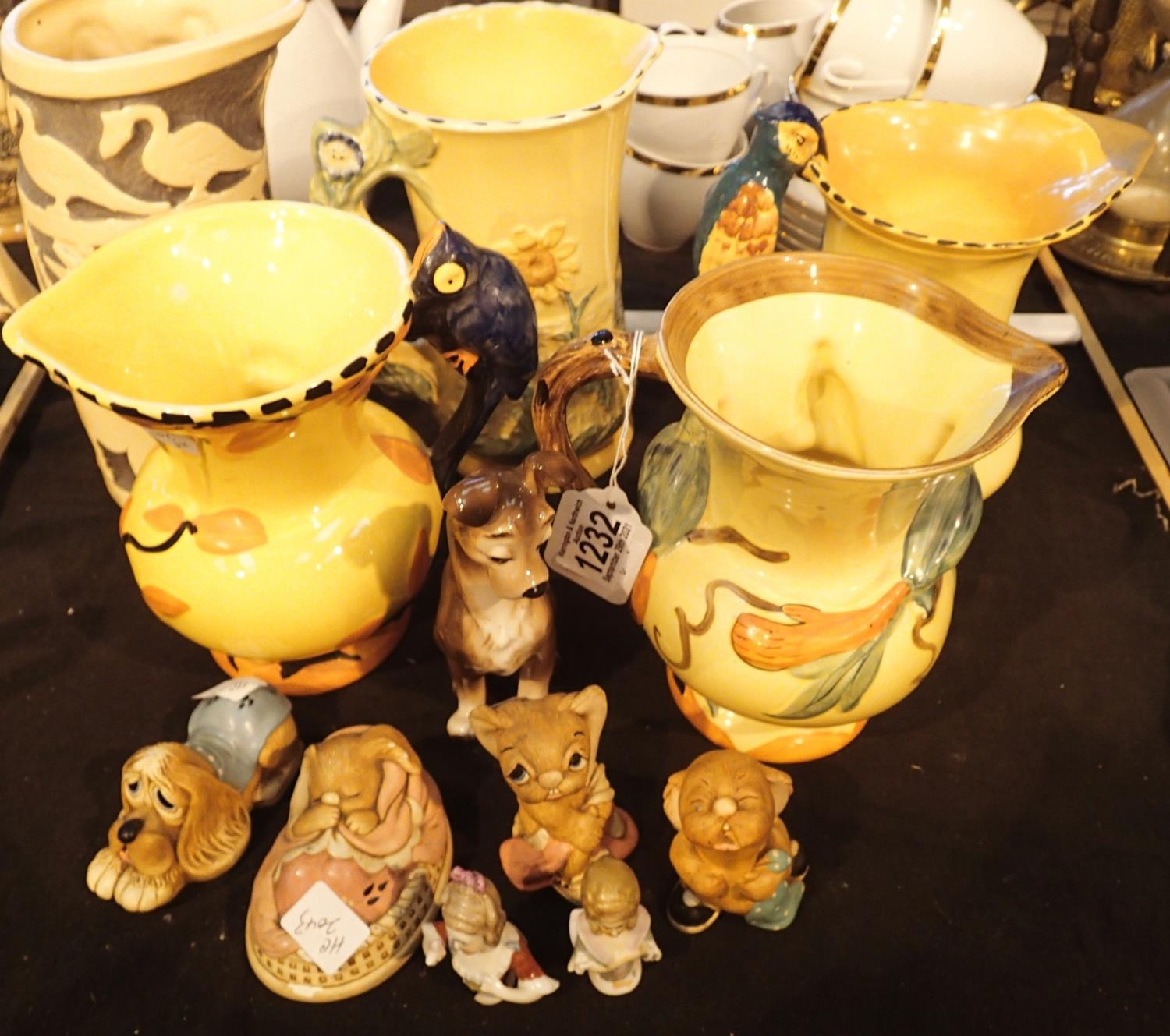 Five vintage jugs including Burleighware four Pendelfin figurines a Disney dog two pin cushion porcelain. Not available for in-house P&P, contact Paul O'Hea at Mailboxes on 01925 659133