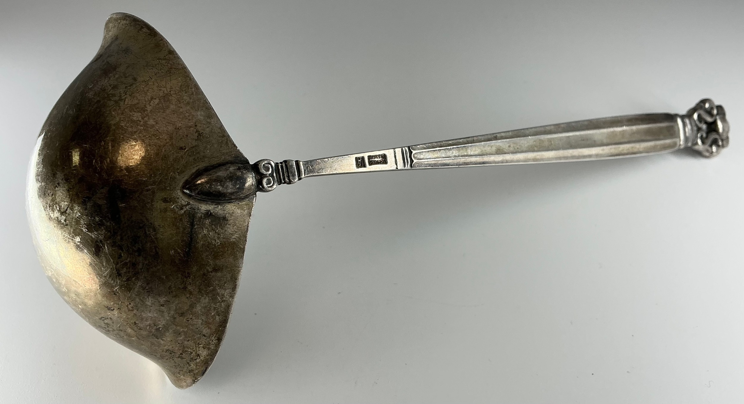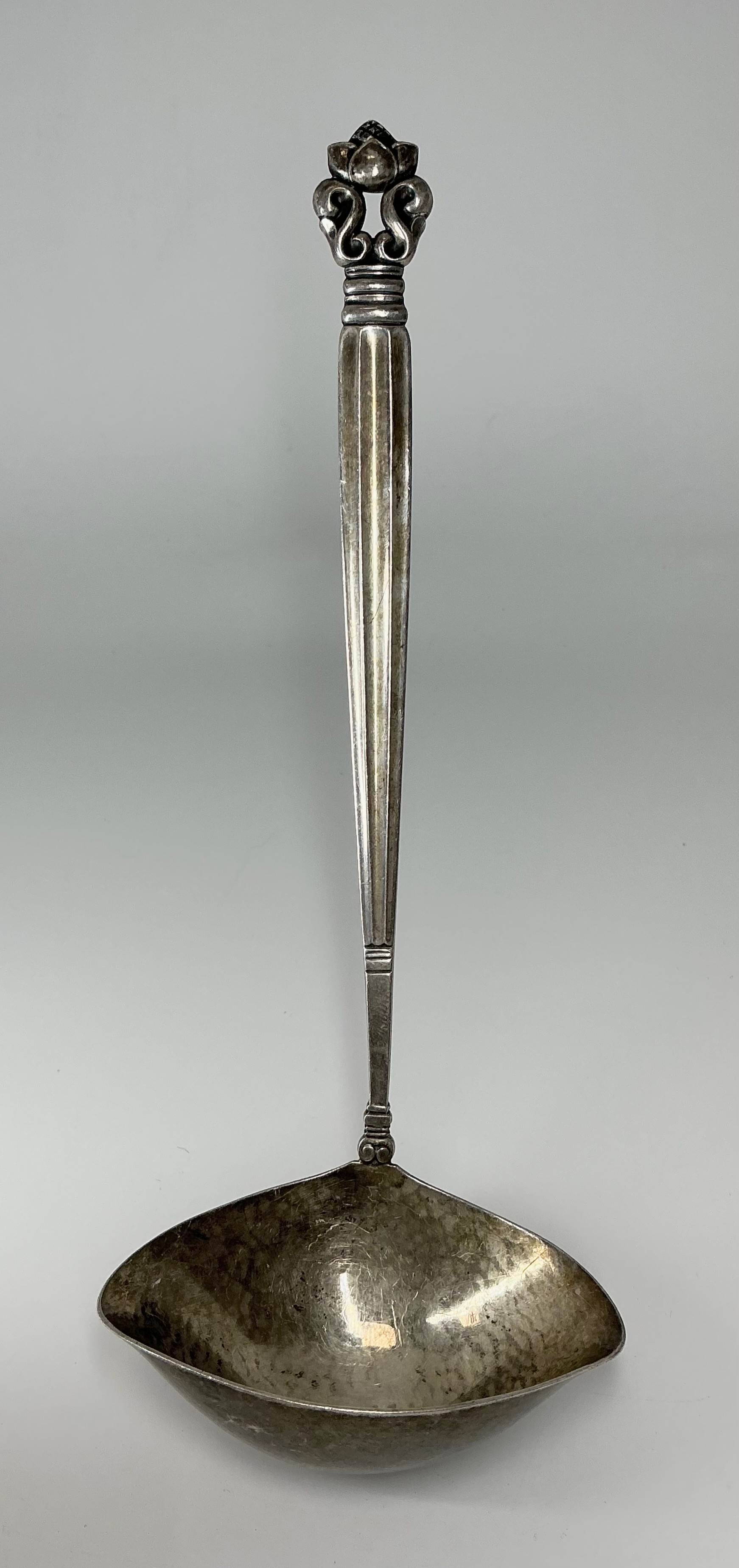 Georg Jensen - a Danish silver Acorn pattern sauce ladle, planished bowl, 20cm long, 86g
