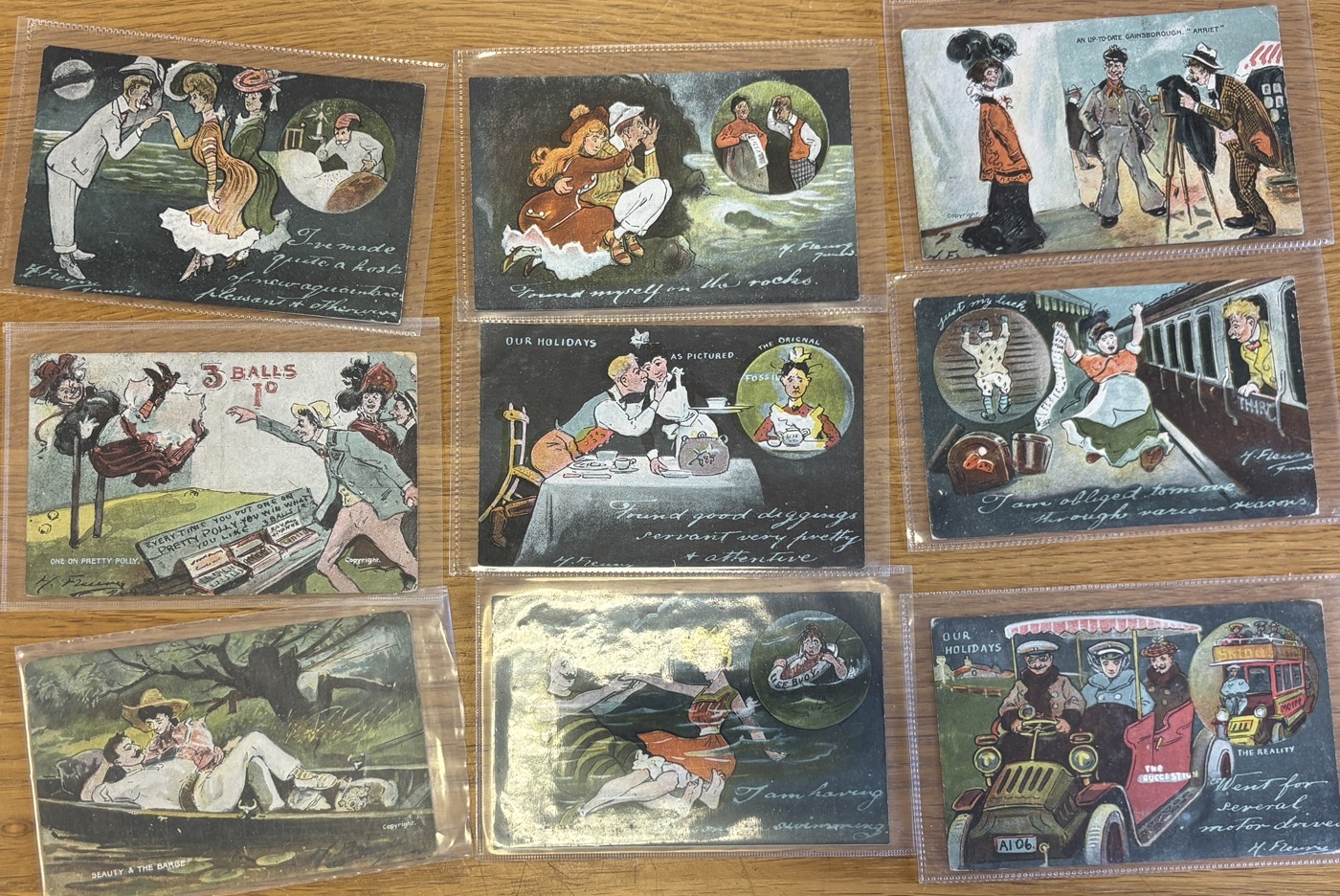 Misc. coln. of mostly loose vintage and modern cards, with comic, artist drawn, ptd. and R.P's, incl. Military badges, London with shop fronts, zoo's, artists H. Fleury, Charles E. Flower, Raphael Kirchner, Harry Payne, etc. Qty. approx. 300+. (B)