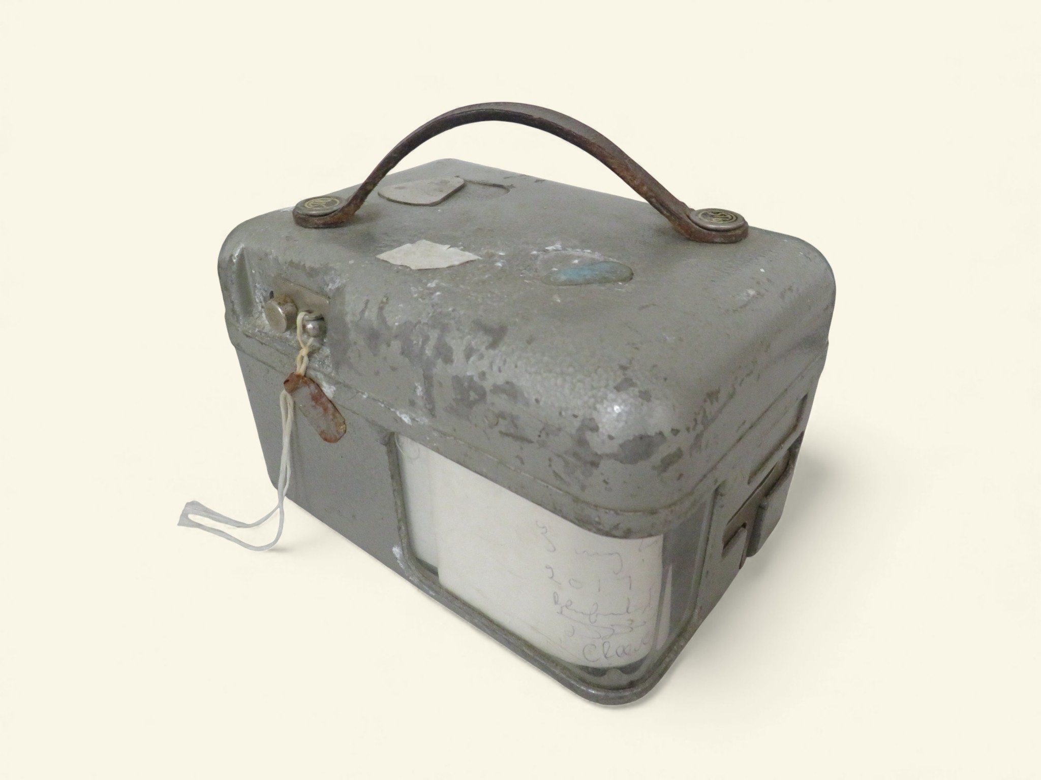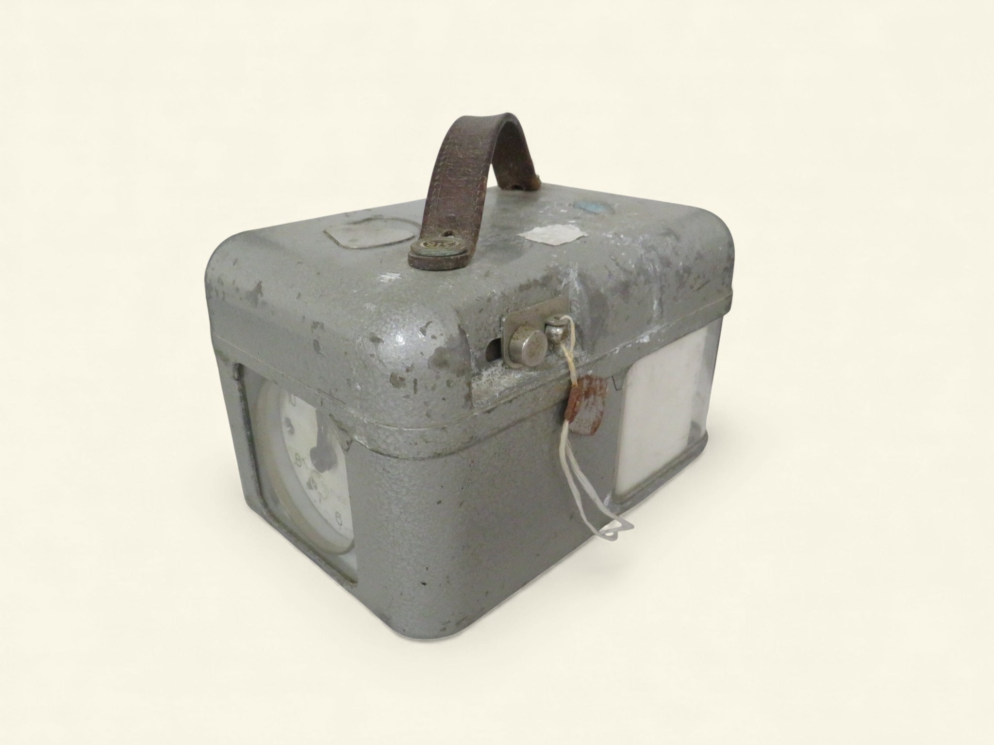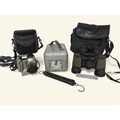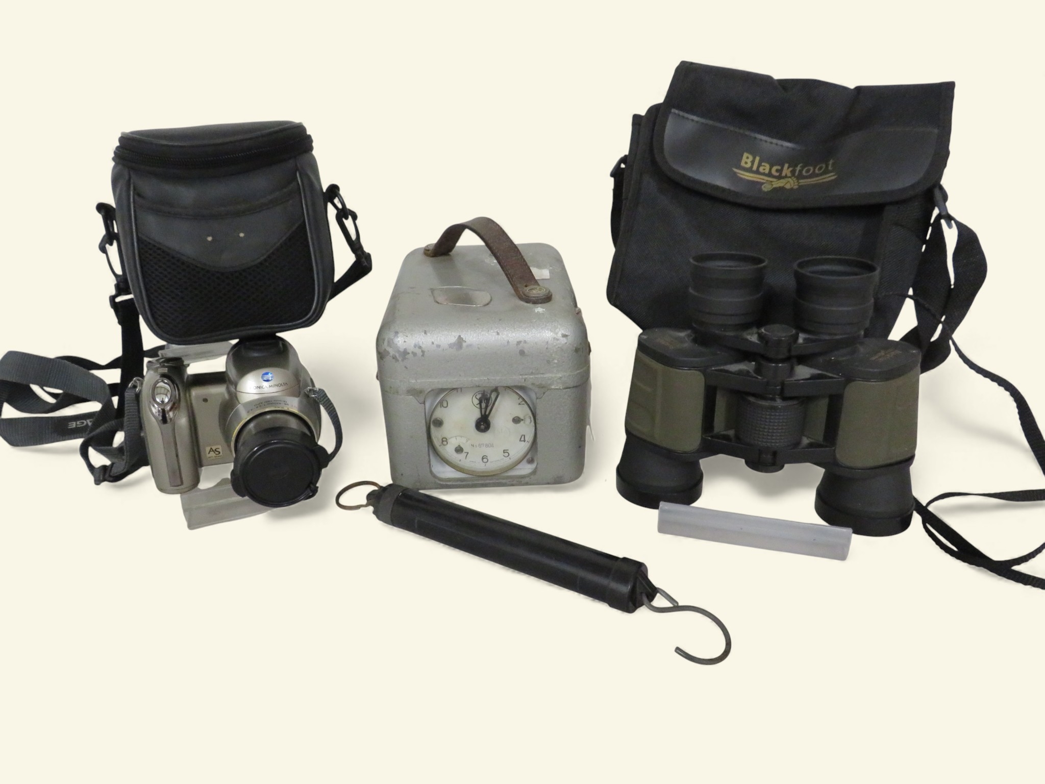 Vintage STB pigeon racing clock with binoculars and telescope. Specialist lot comprising metal-cased STB pigeon racing timing clock with leather carrying strap showing dial and recording mechanism (used by pigeon fanciers to record race times), pair of Blackfoot binoculars in padded carrying case with neck strap, compact monocular or small telescope in soft case, extendable pointer or presentation stick with wrist loop, small camera in leather case. Sporting and optical equipment from mid-20th century. Interesting lot particularly appealing to pigeon racing enthusiasts and collectors of vintage optics.