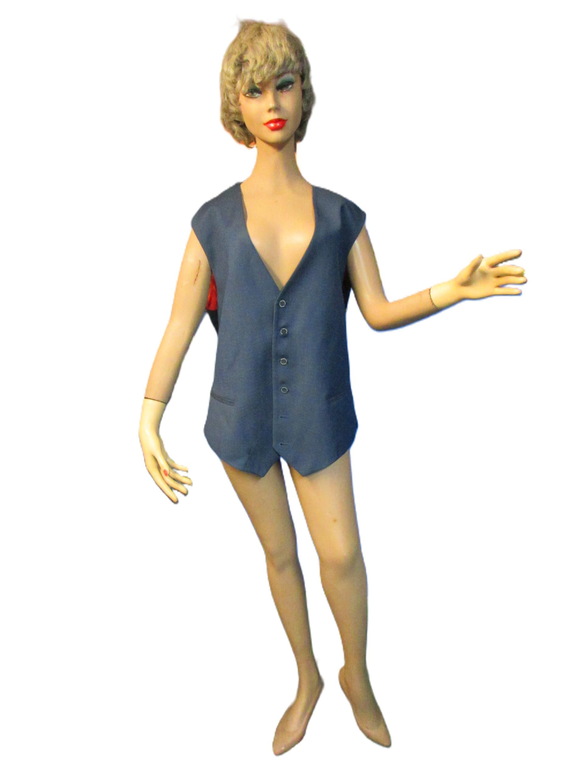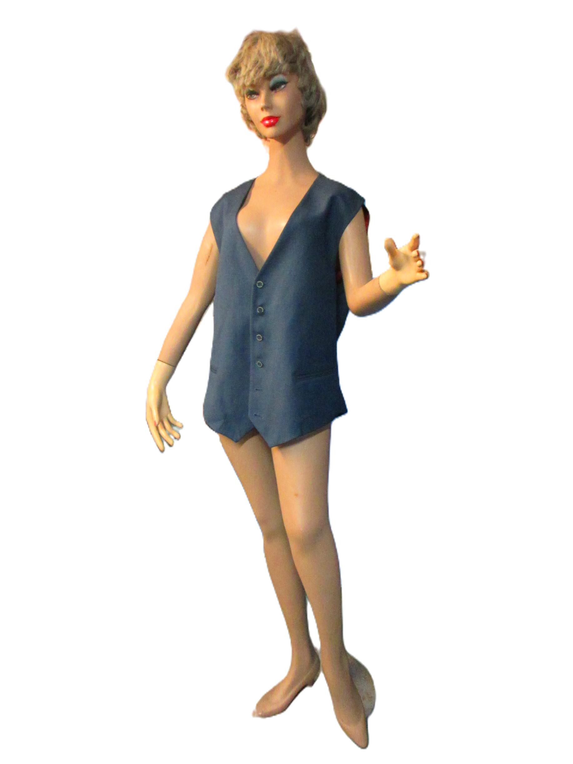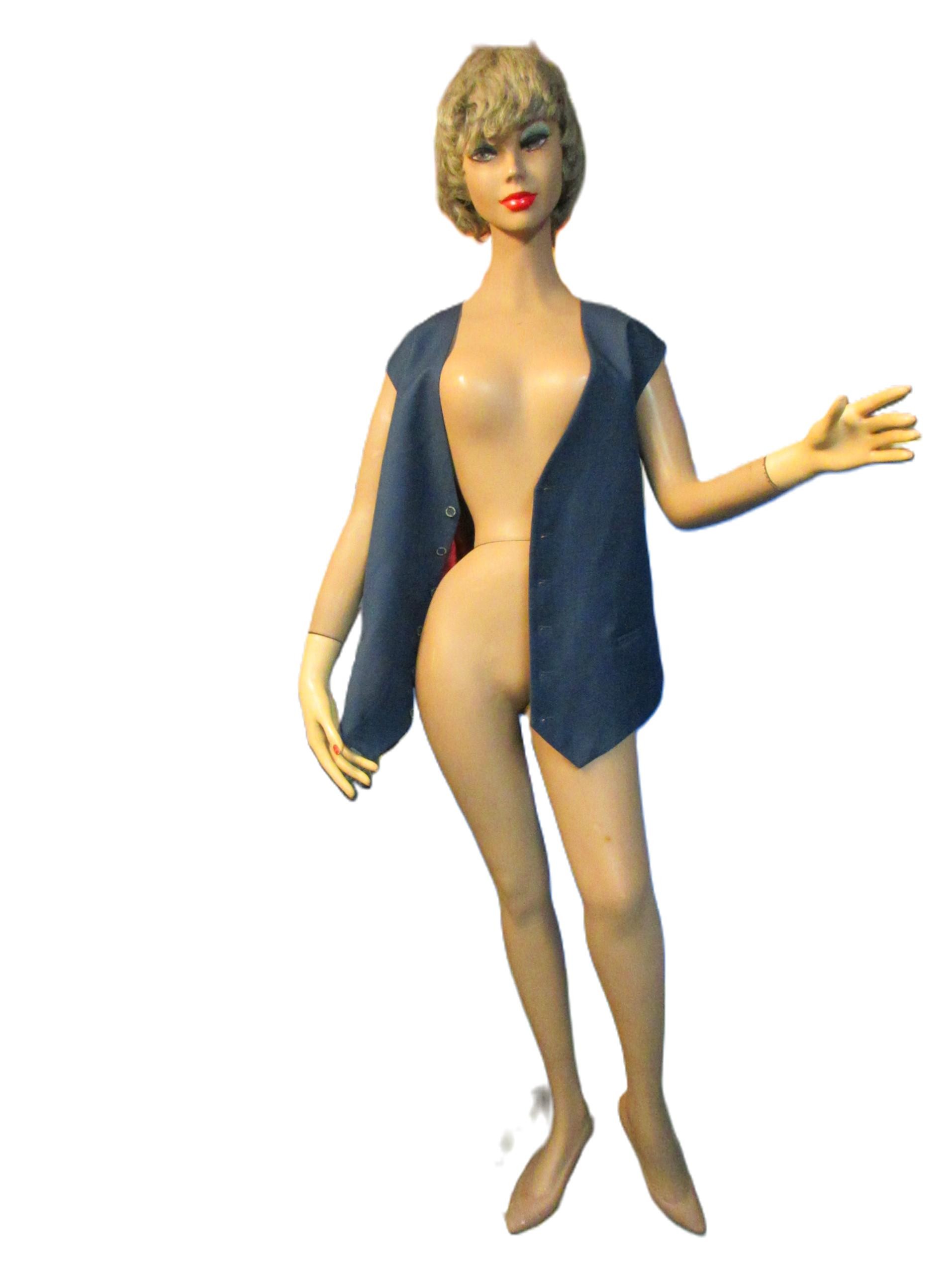 Full-sized shop/retail display female hard-shell mannequin featuring realistic head, hands, heel-wearing feet; plus a full torso, legs, arms, all supported by central metal stand; model displays painted eyes, eyebrows, lips & nails as well as applied hair piece and eyelashes; mannequin is joined at the shoulders, wrists, waist and upper thigh on the forward facing leg; approx. H 5ft9" 68.5", 32" bust x 19" waist x 30" hips; pictured clothing not inc. selling separately, Qty. 1