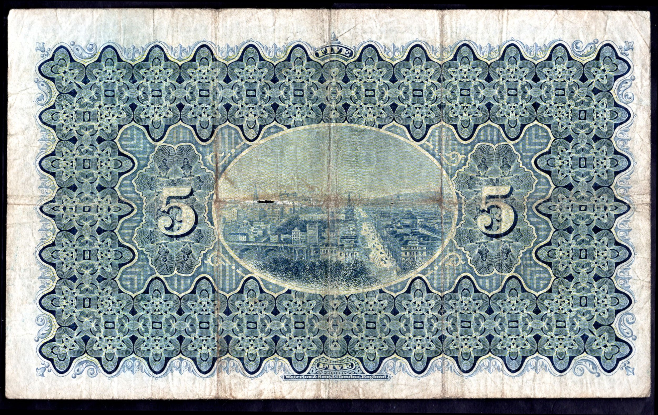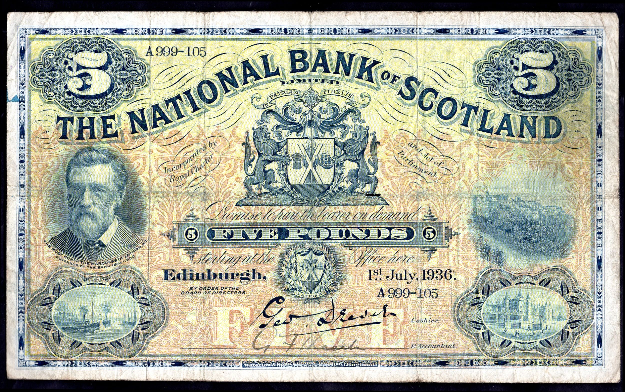 National Bank of Scotland, 5 pounds, 1st July 1936, #A999-105. Worn on folds, Fine.