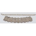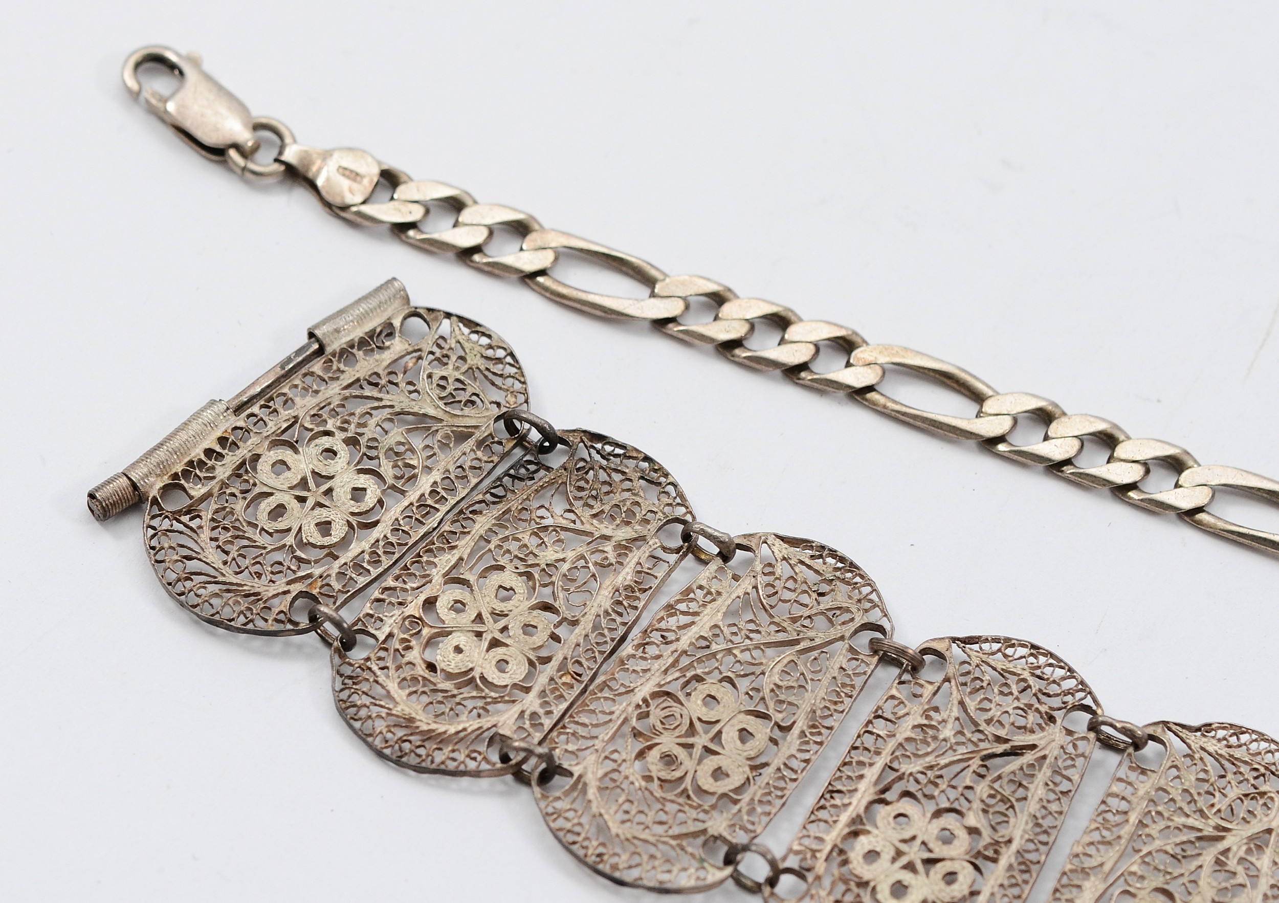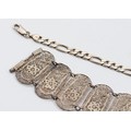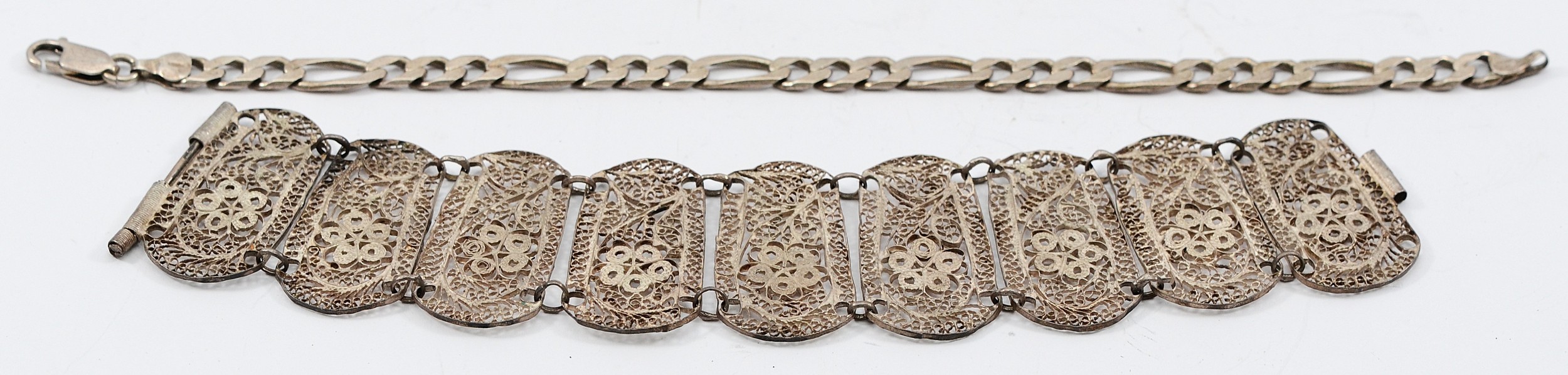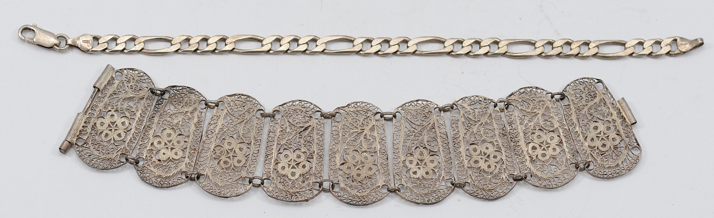 A 925 silver bracelet, 21cm, 11.4g with an unmarked silver filigree panel bracelet, 21g