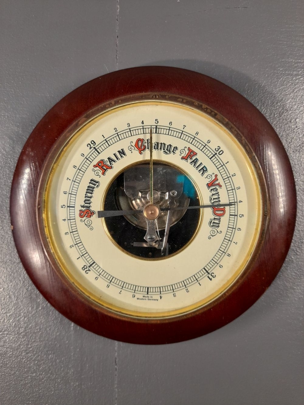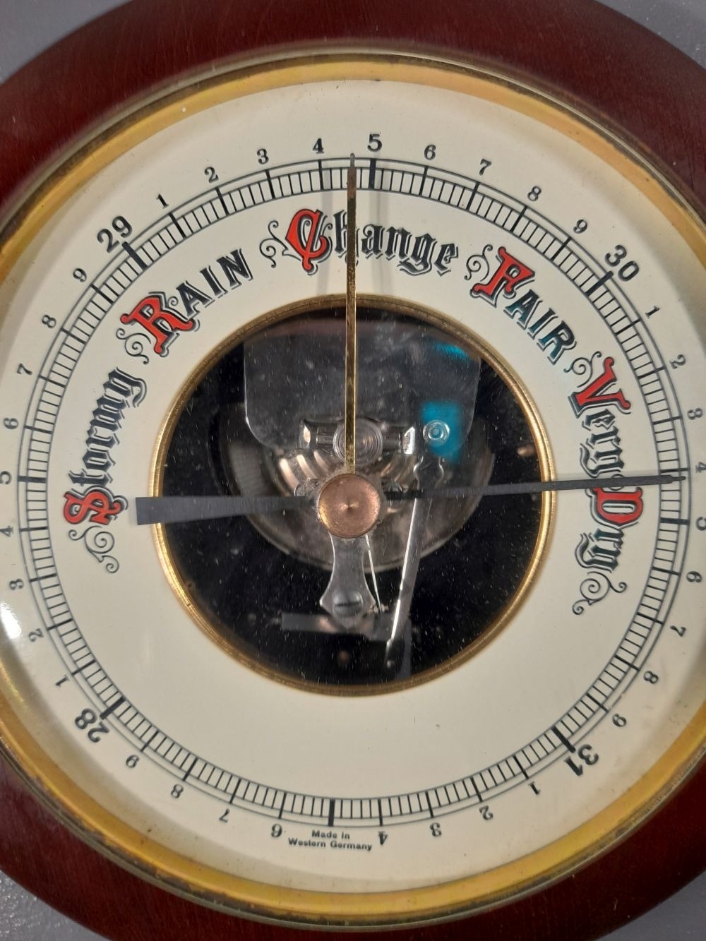 A VINTAGE ANEROID BAROMETER, made in West Germany. Dimensions: 19cm diameter approx.