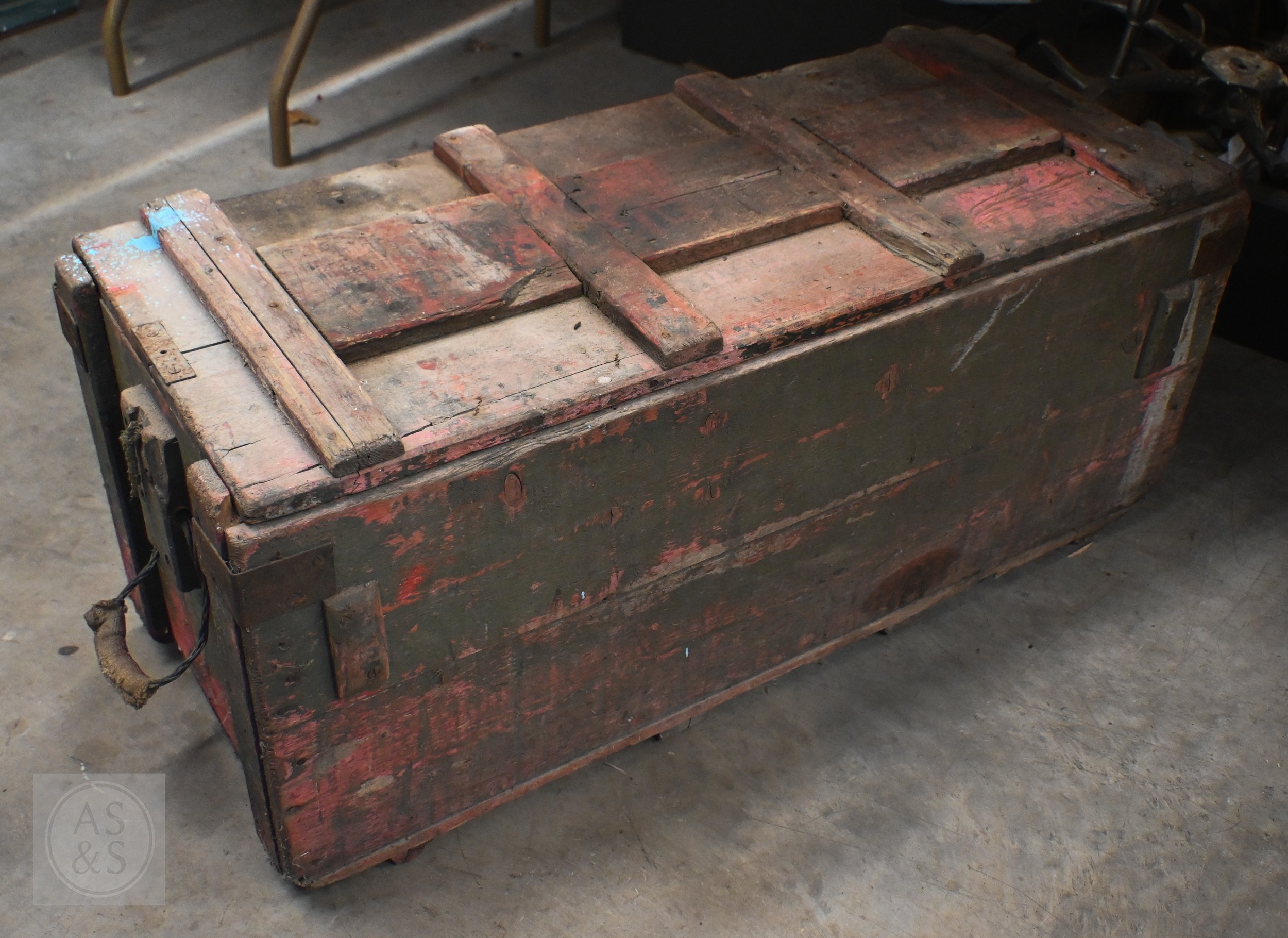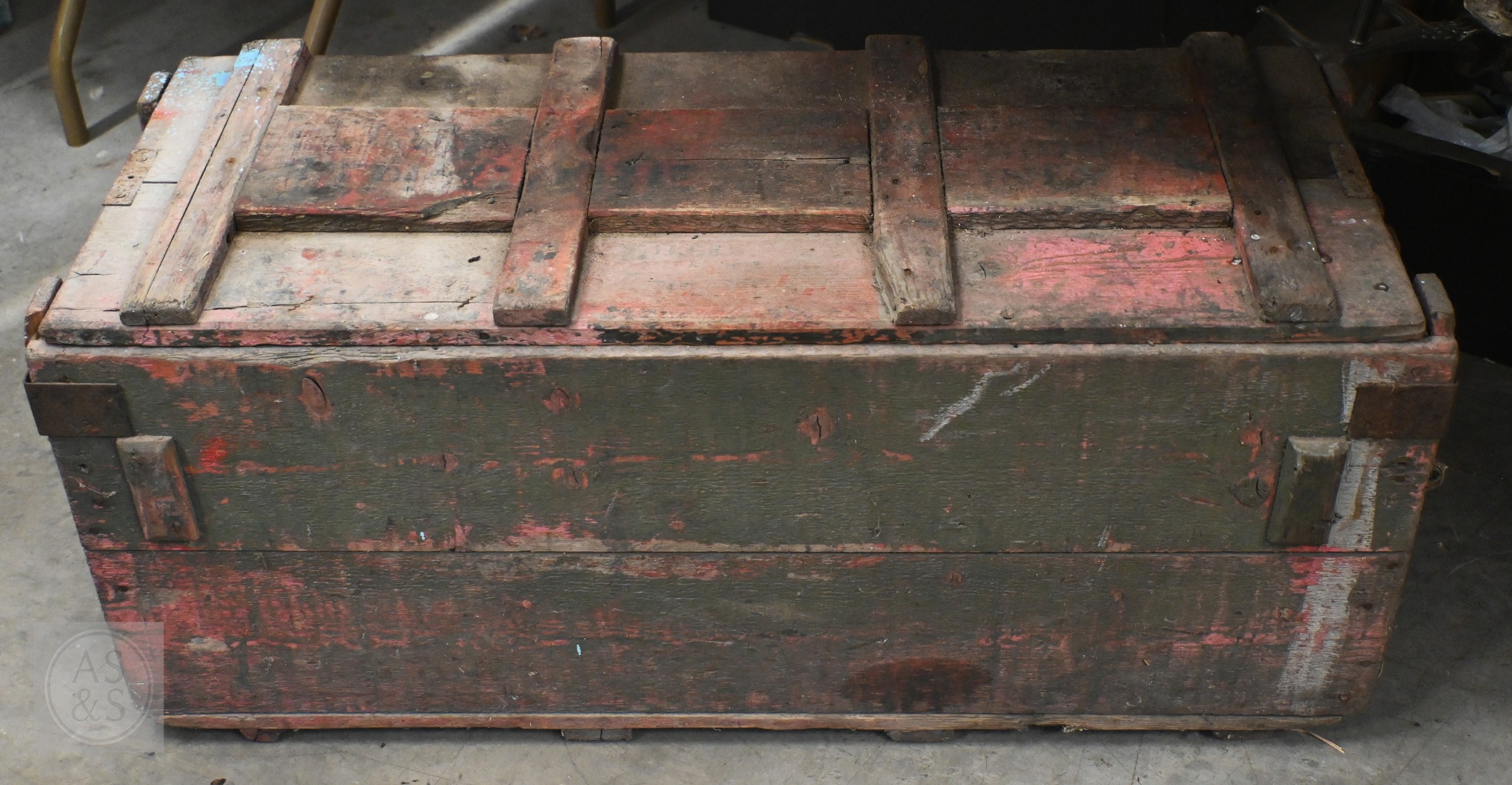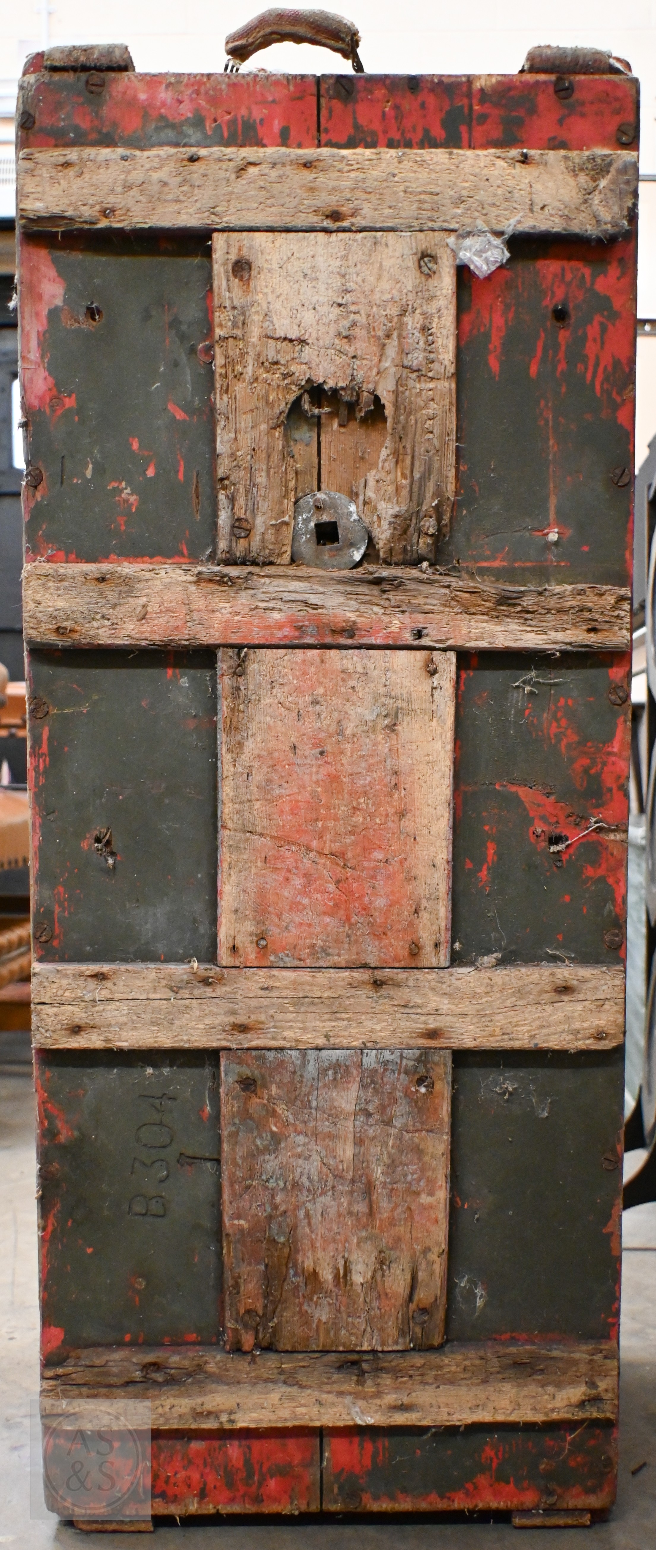 An old green painted wooden WW1 era ammunition box, numbered on base 'B304' 96 cm x 40 cm x 40 cm high