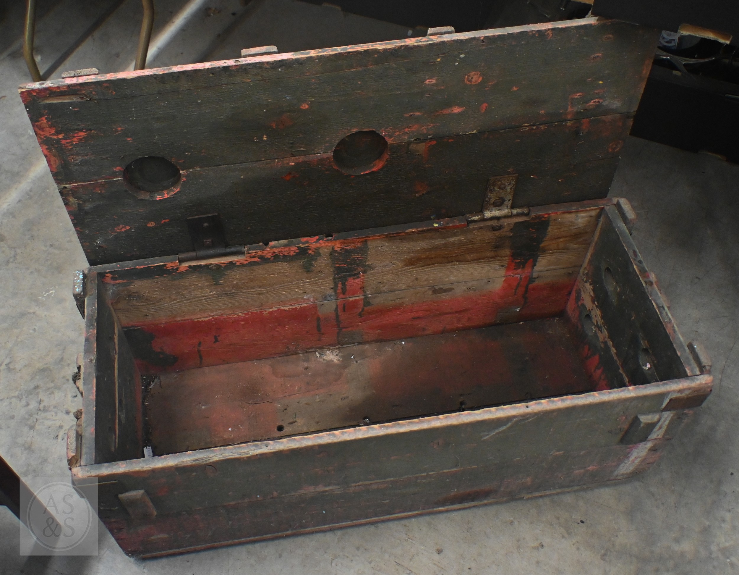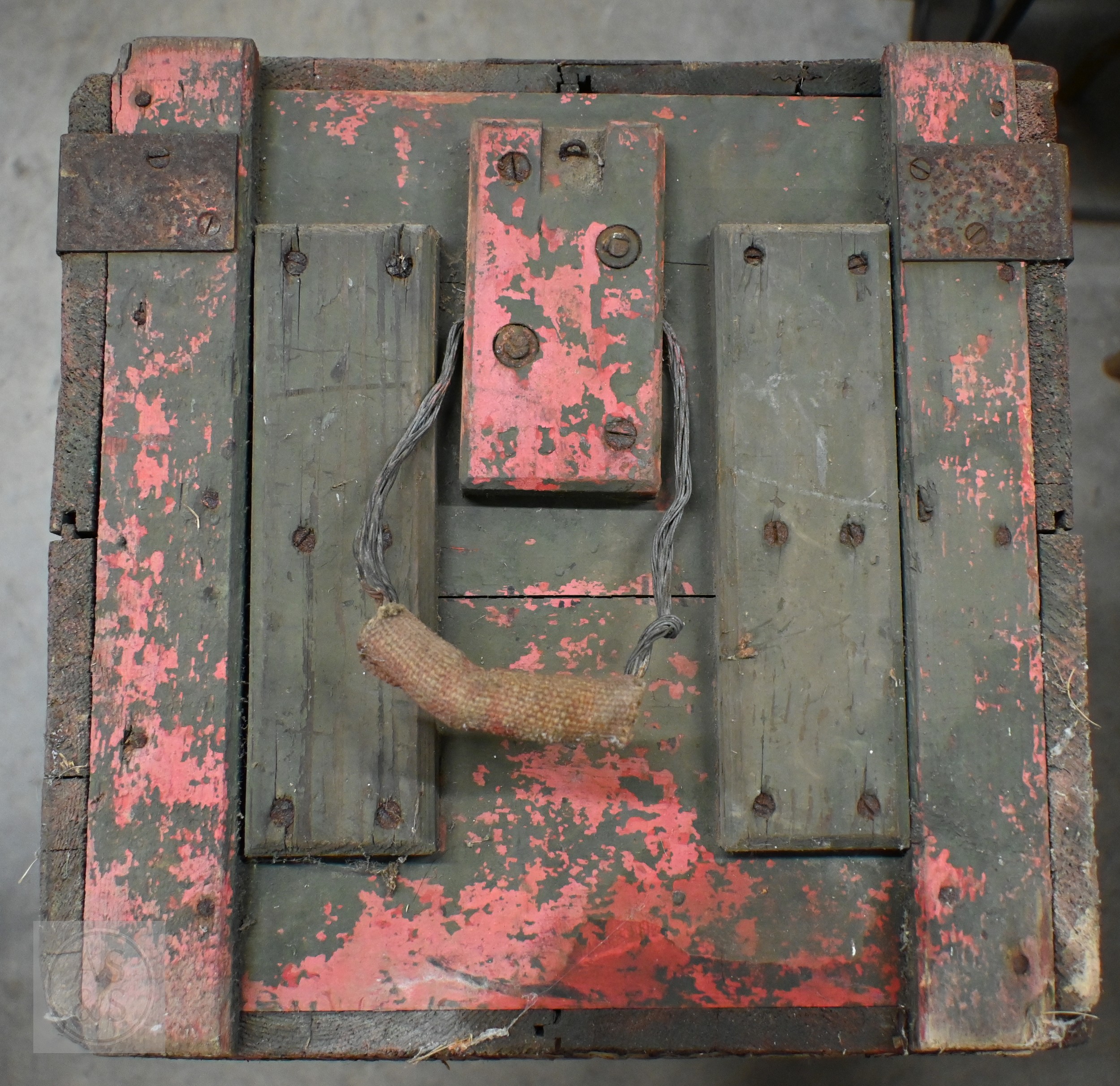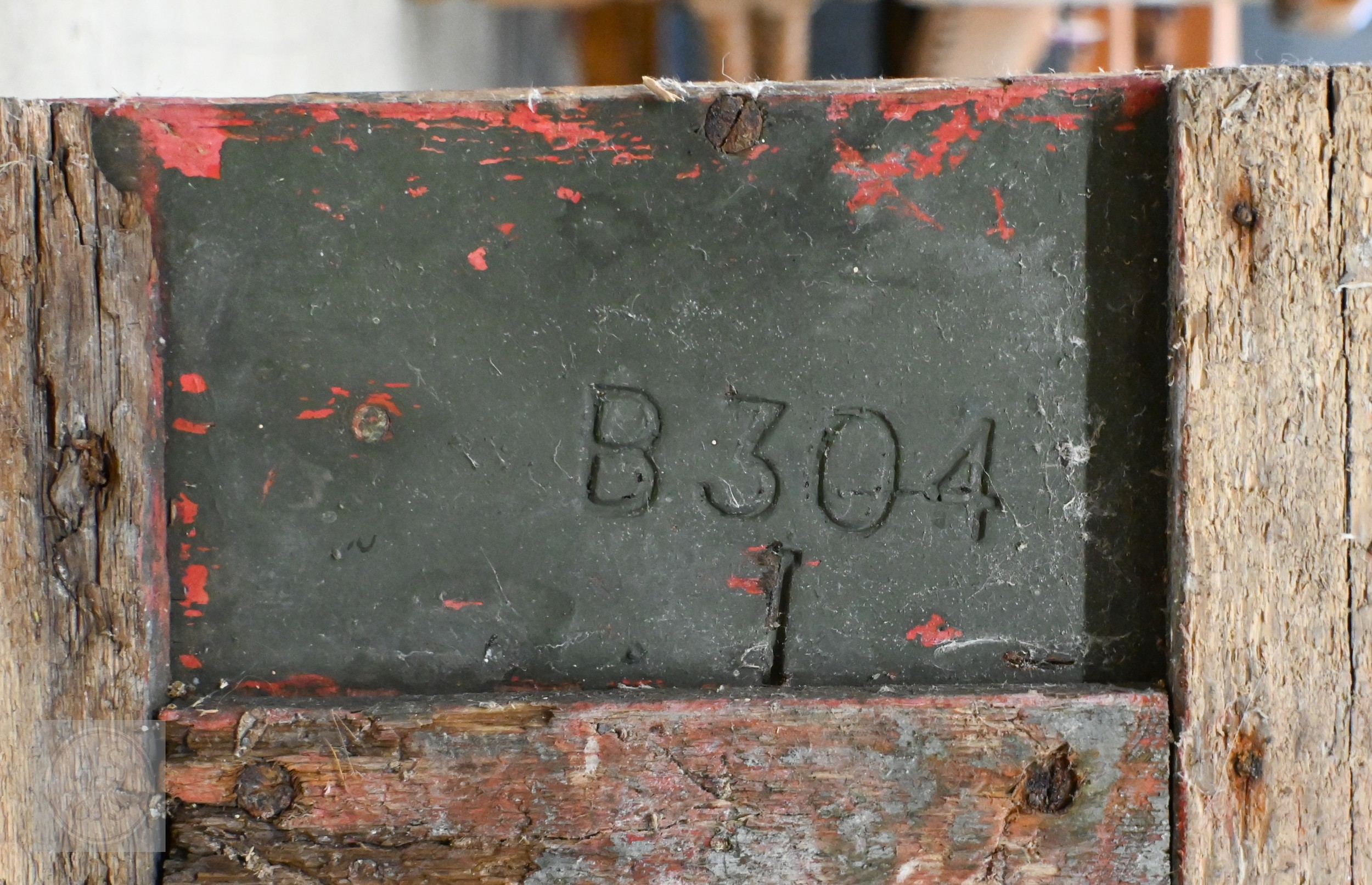 An old green painted wooden WW1 era ammunition box, numbered on base 'B304' 96 cm x 40 cm x 40 cm high