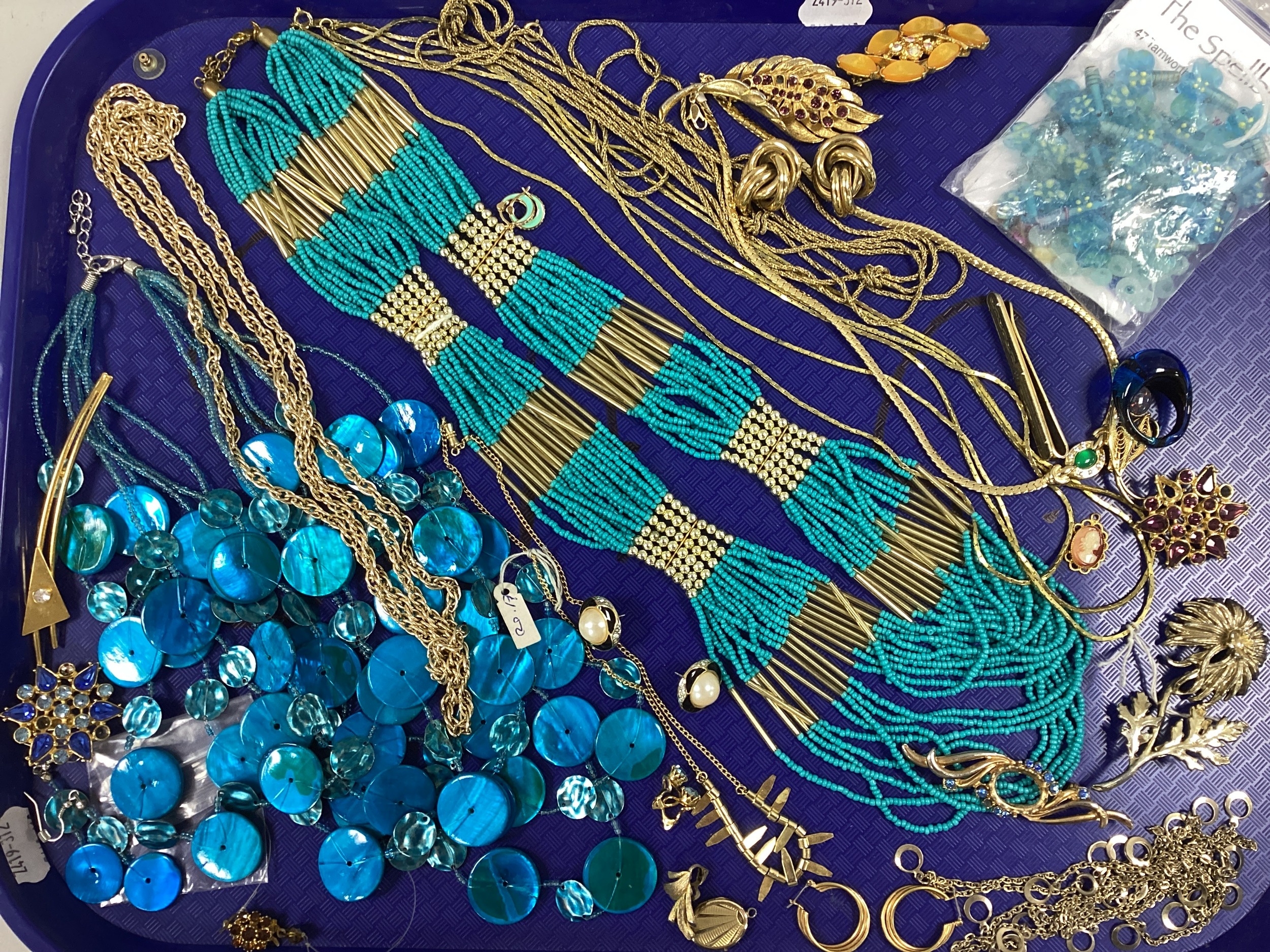 A Variety of Costume Jewellery, to include gilt coloured multi-row necklace, cameo pendant, oversized knot earrings, locket pendant, stone set modernist brooch, traditional style statement necklace etc :- One Tray
