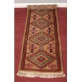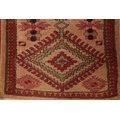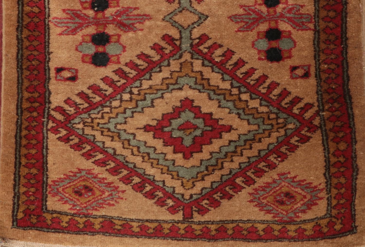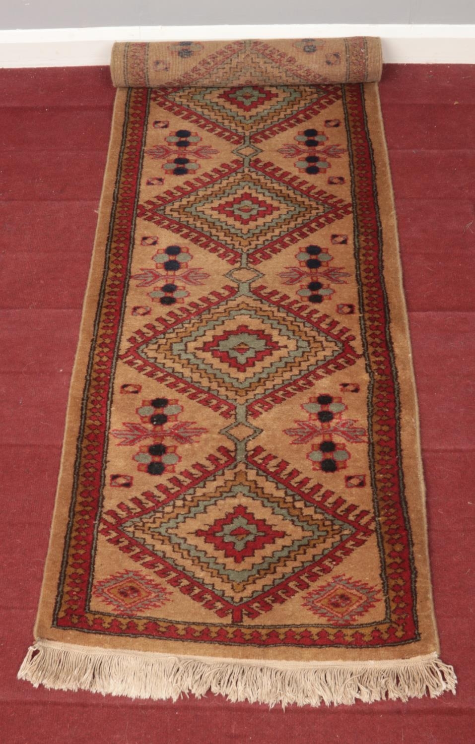 A light brown ground carpet runner with Aztec design. L: 182cm, W:60cm.