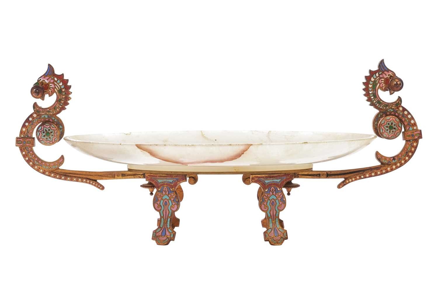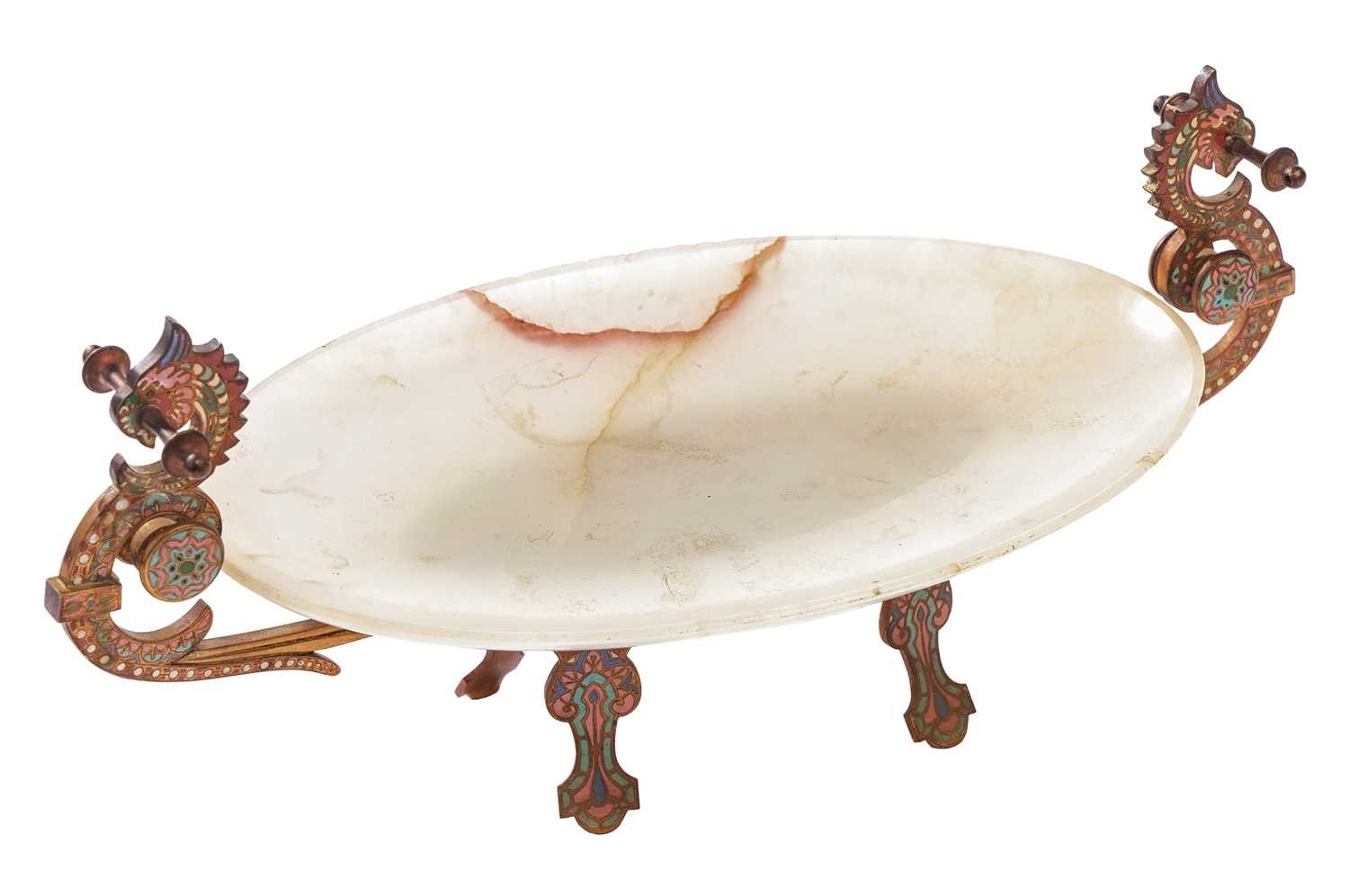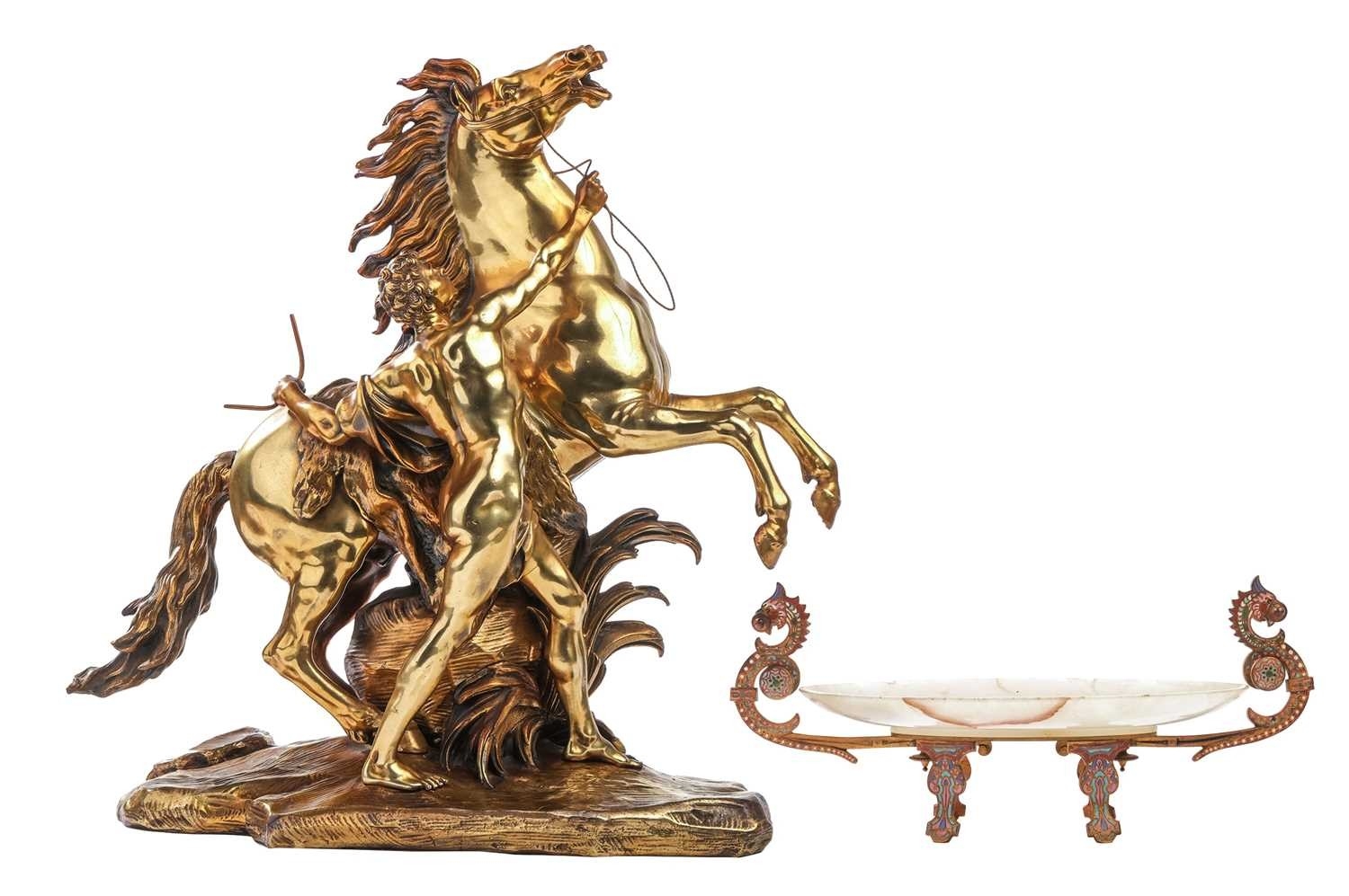 After Cousteau, a gilt bronze figure of the Marley horse and handler, late 19th/early 20th century, 59 cm high x 53 cm wide, together with an onyx, gilt metal and cloisonne decorated bowl, with two scroll handles and four panel feet, 38.5cm long. Qty: (2)