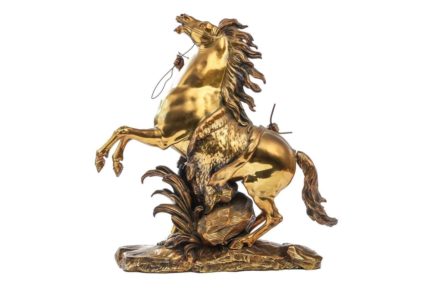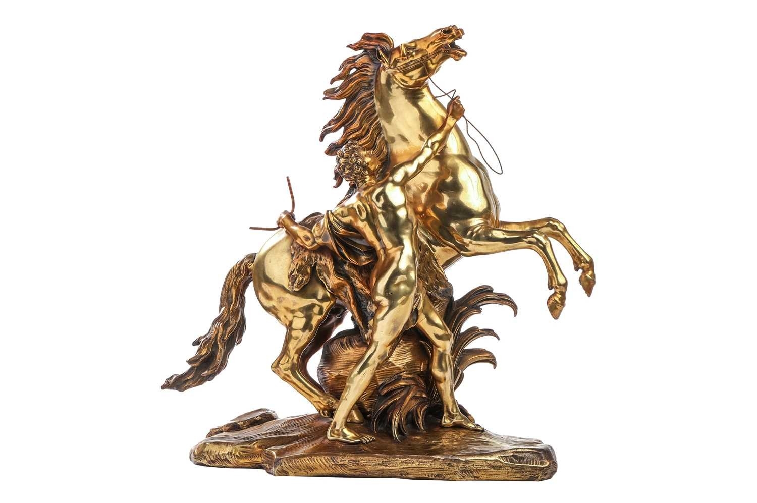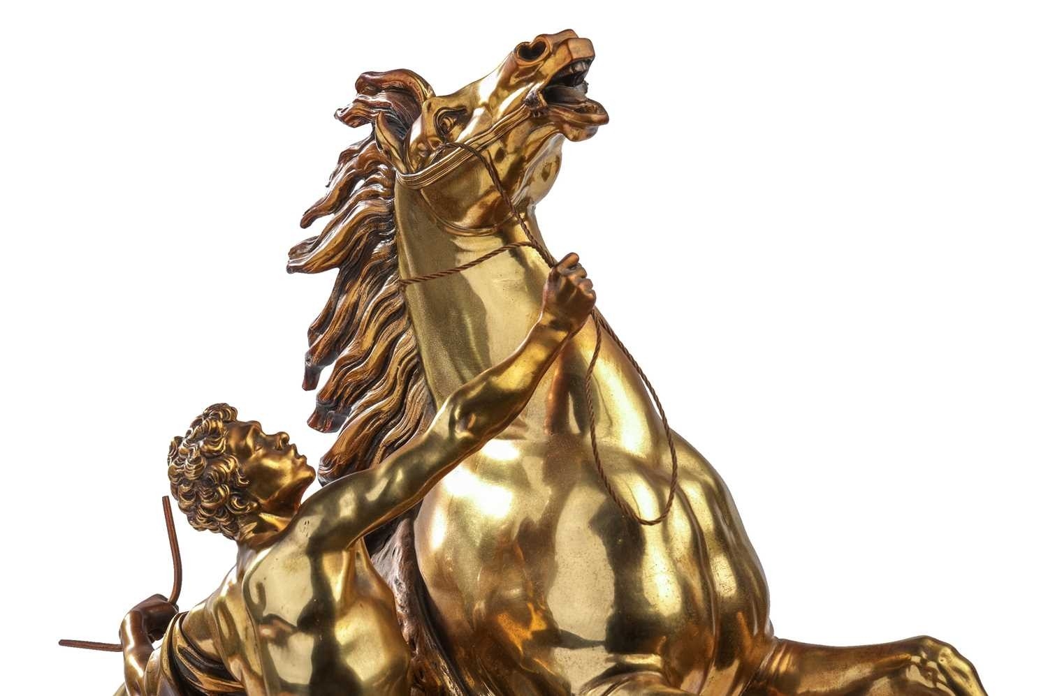 After Cousteau, a gilt bronze figure of the Marley horse and handler, late 19th/early 20th century, 59 cm high x 53 cm wide, together with an onyx, gilt metal and cloisonne decorated bowl, with two scroll handles and four panel feet, 38.5cm long. Qty: (2)