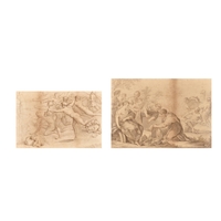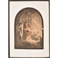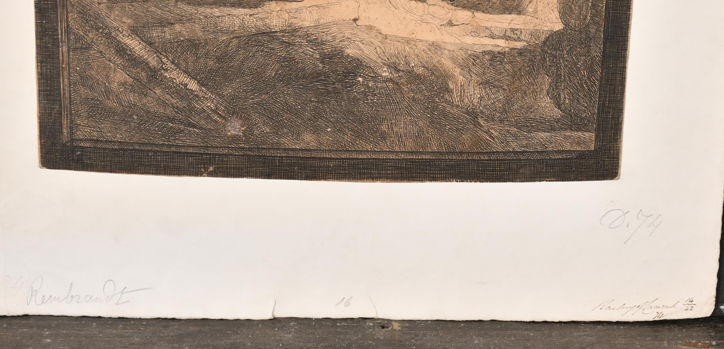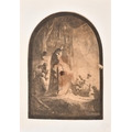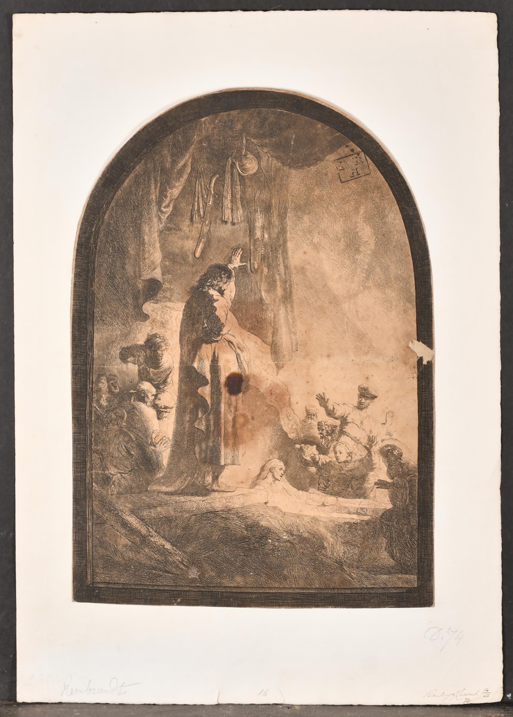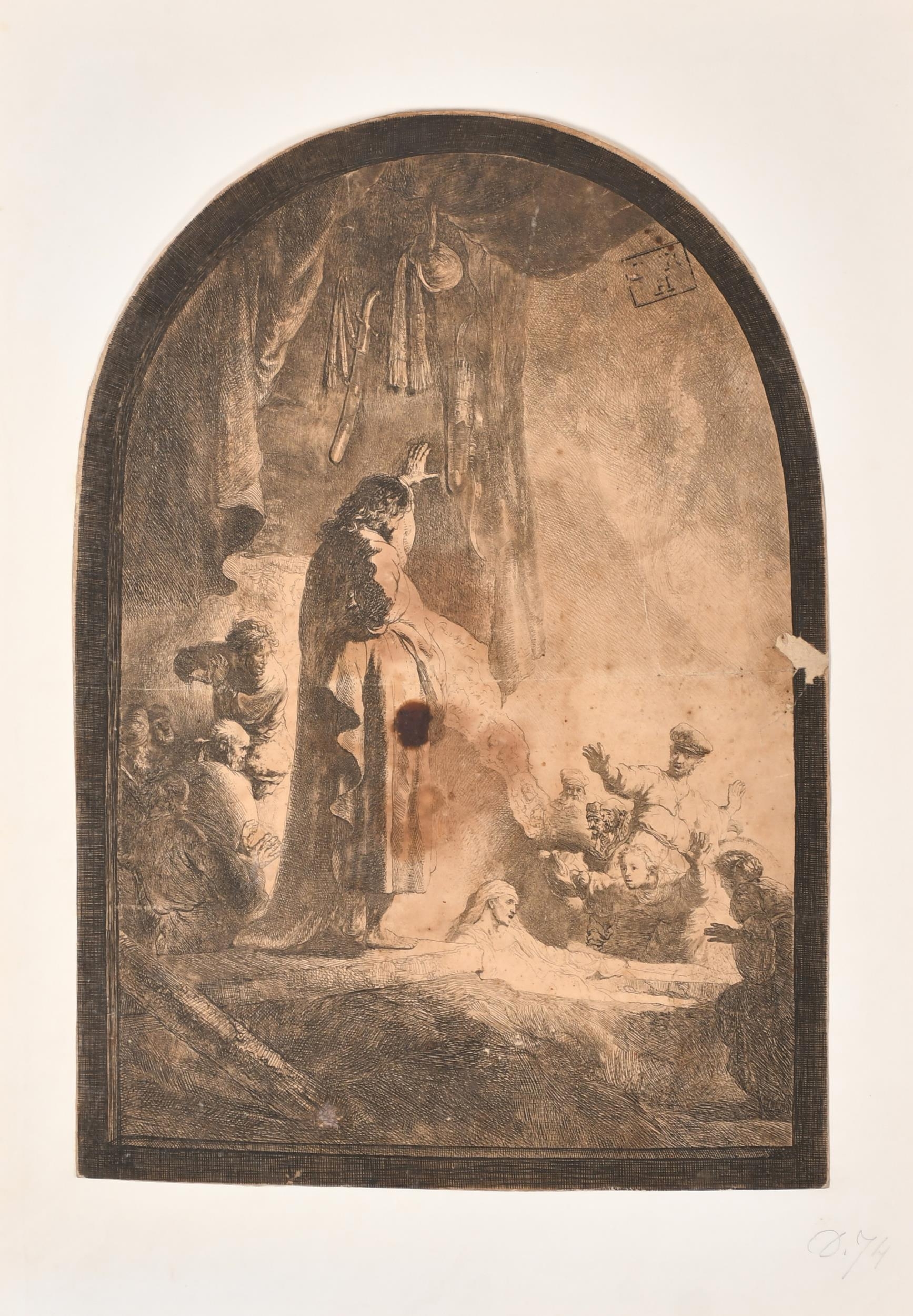 Rembrandt van Rijn (1606-1669) Dutch. "The Raising of Lazarus", Etching, With an indistinct collection stamp, Inscribed in pencil verso, Arched, unframed 14.5" x 10.15" (36.8 x 25.7cm). Provenance: Haydon Collection