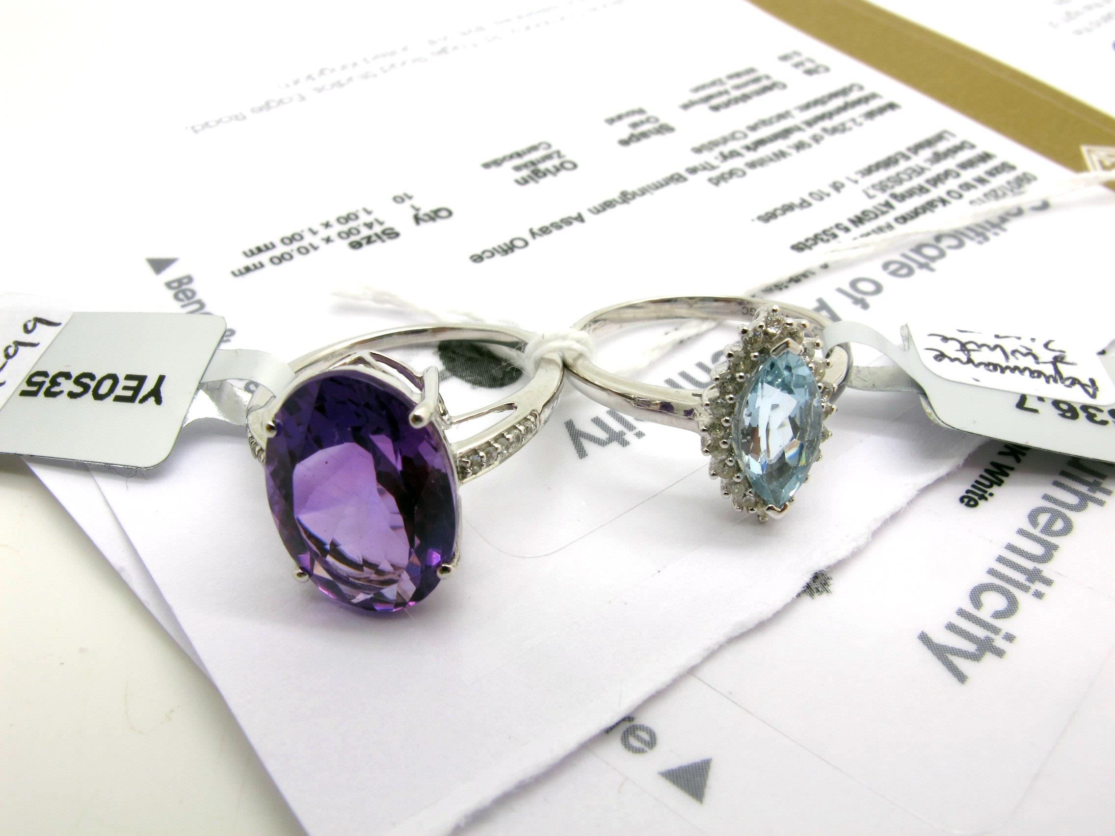 The Genuine Gemstone Company Ltd; A 9ct White Gold Aquamarine and White Zircon Cluster Style Ring, the marquise cut centre, within claw set border, between plain shoulders (finger size O), A 9ct White Gold Kalomo Amethyst and White Zircon dress ring, large oval claw set centre, within inset shoulders (finger size O) (total weight 5.5 grams) (2).