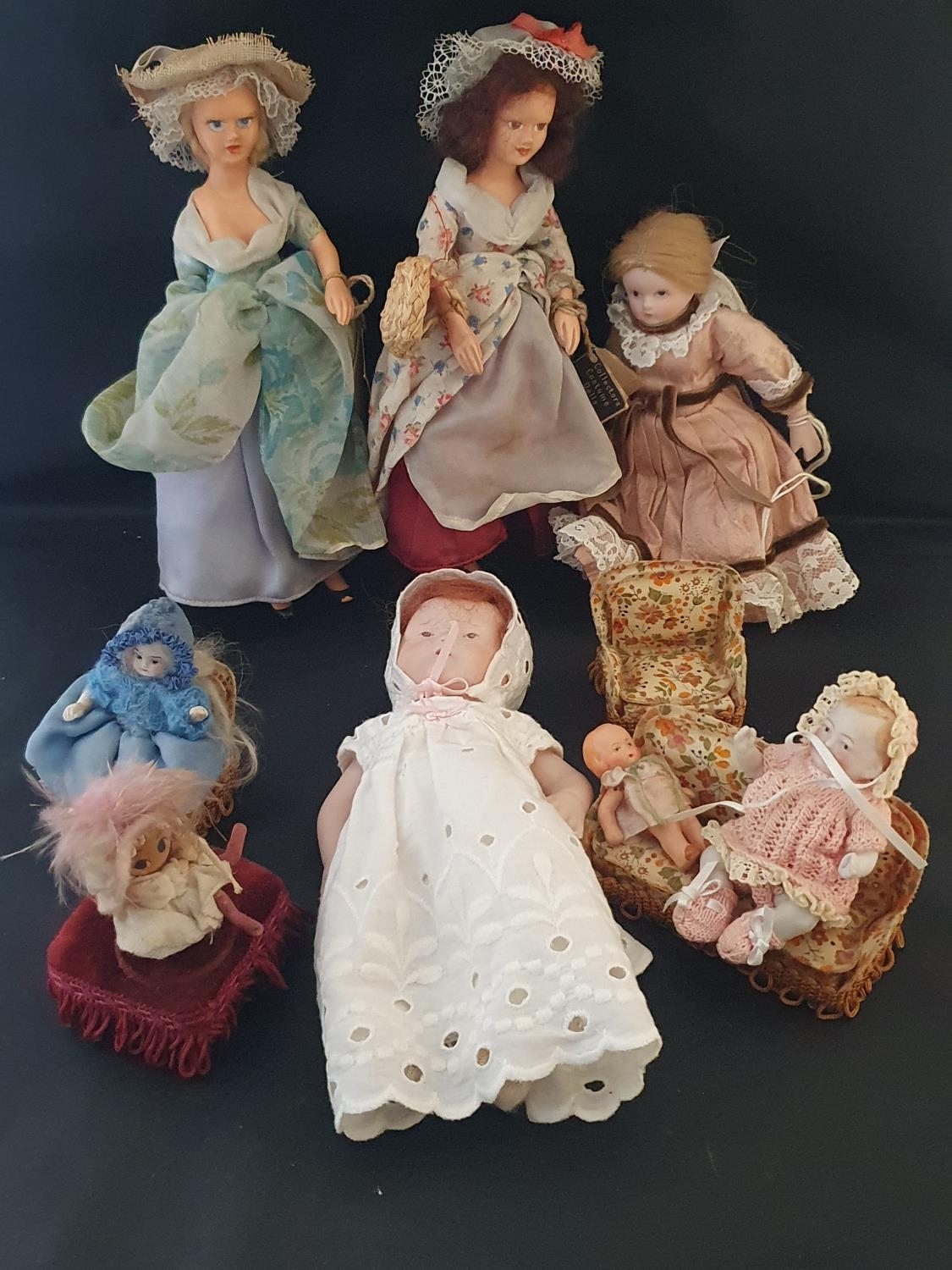 A selection of antique dolls including Peggy Nesbit and other bisque dolls.