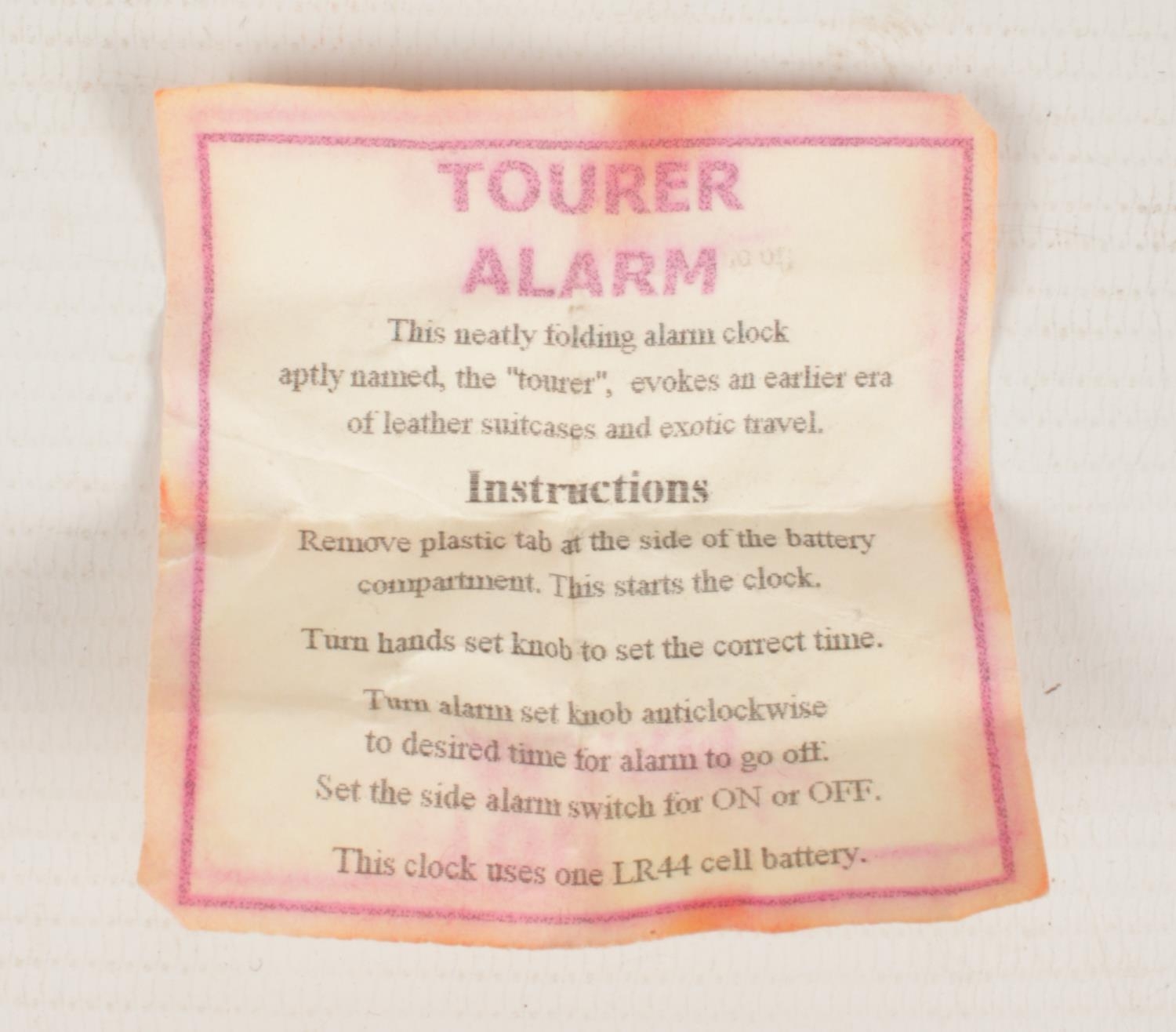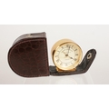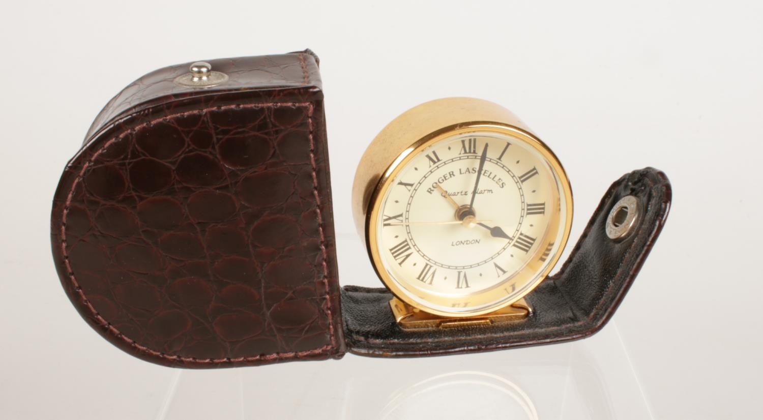 A cased travel "Roger Lascelles" quartz alarm clock in working order. H: 4.5cm, W: 4.5cm.