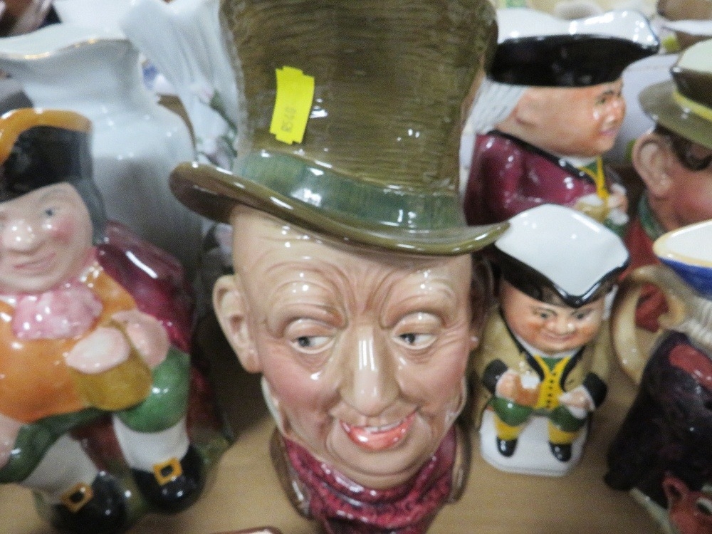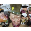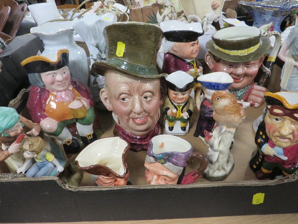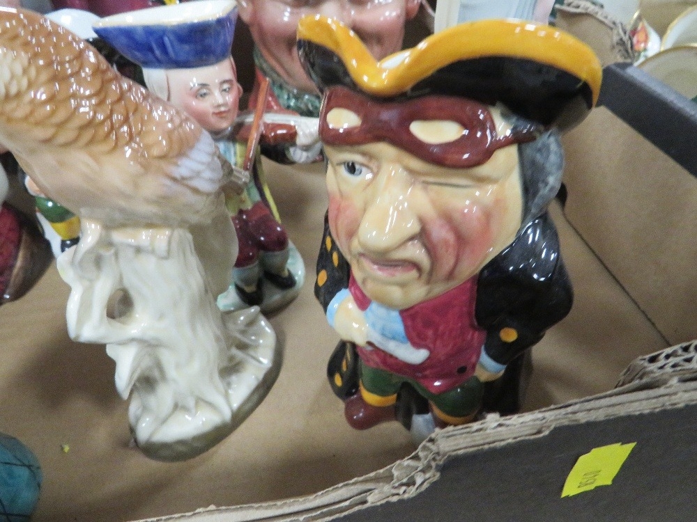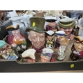 A tray of assorted ceramics to include character jugs and Toby jugs