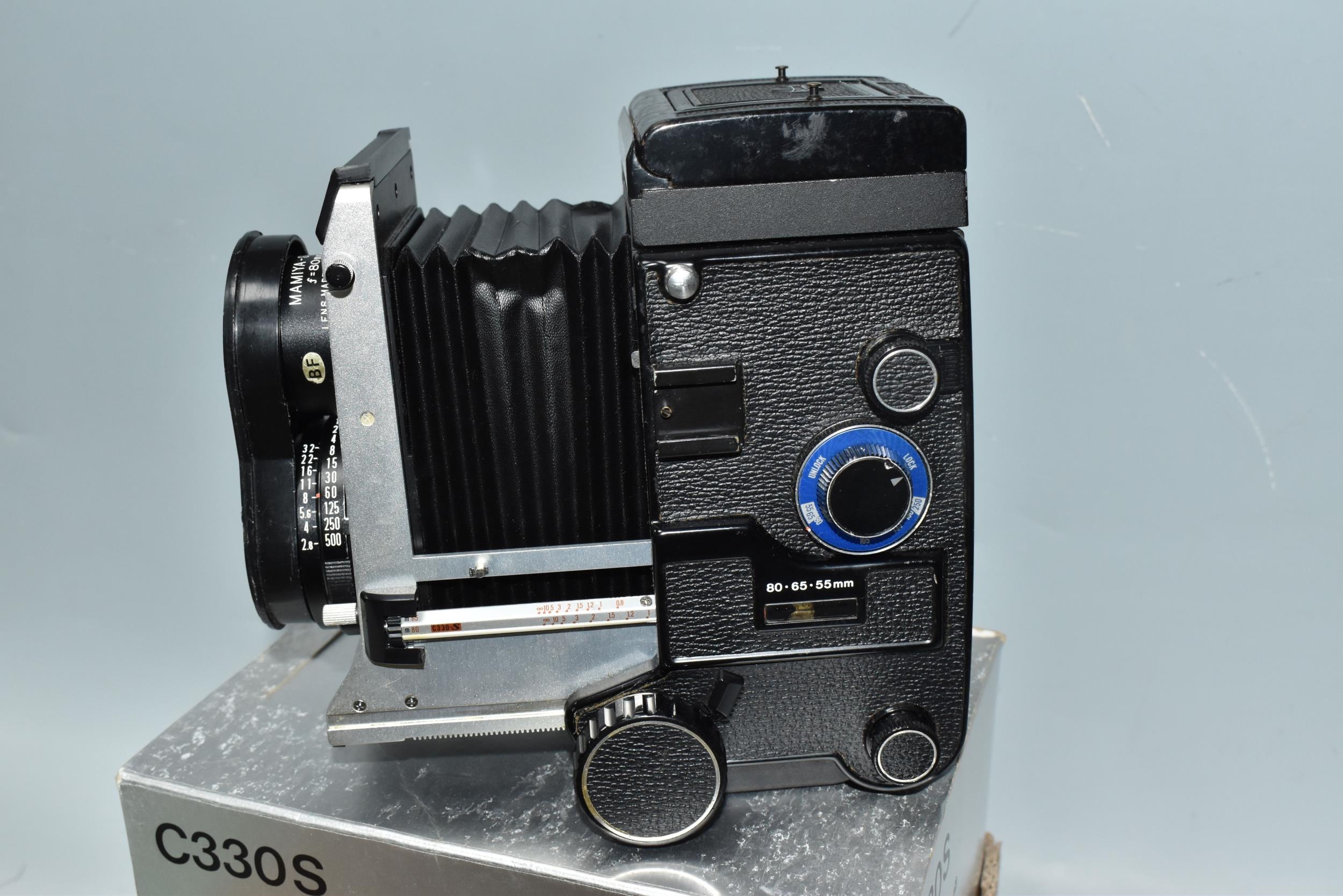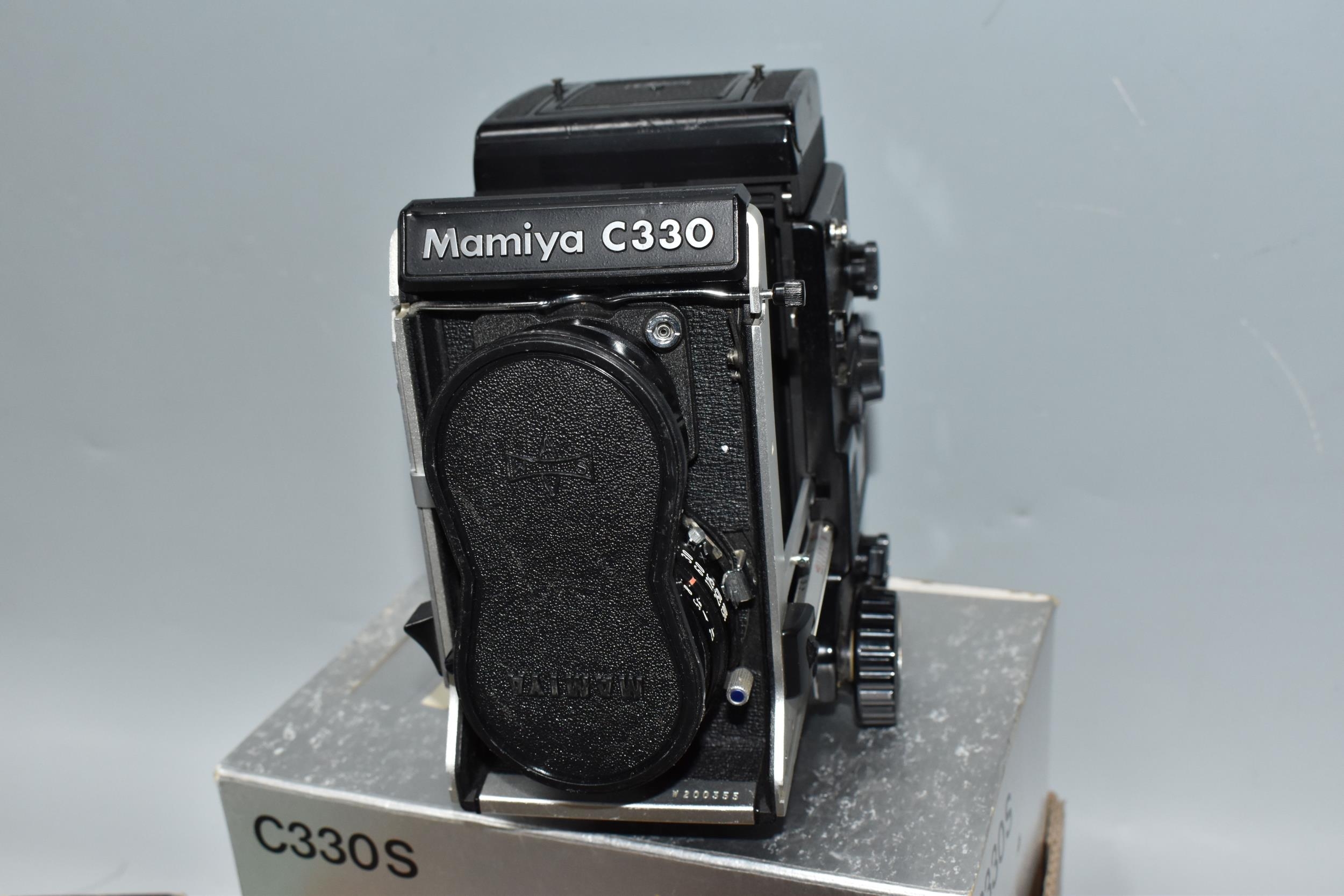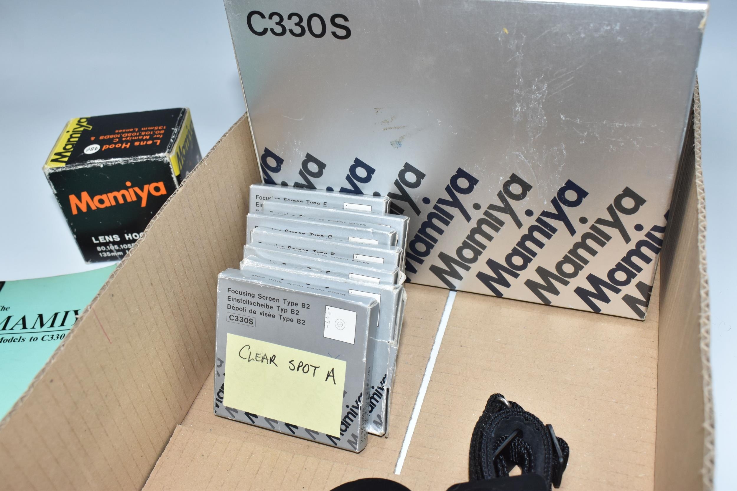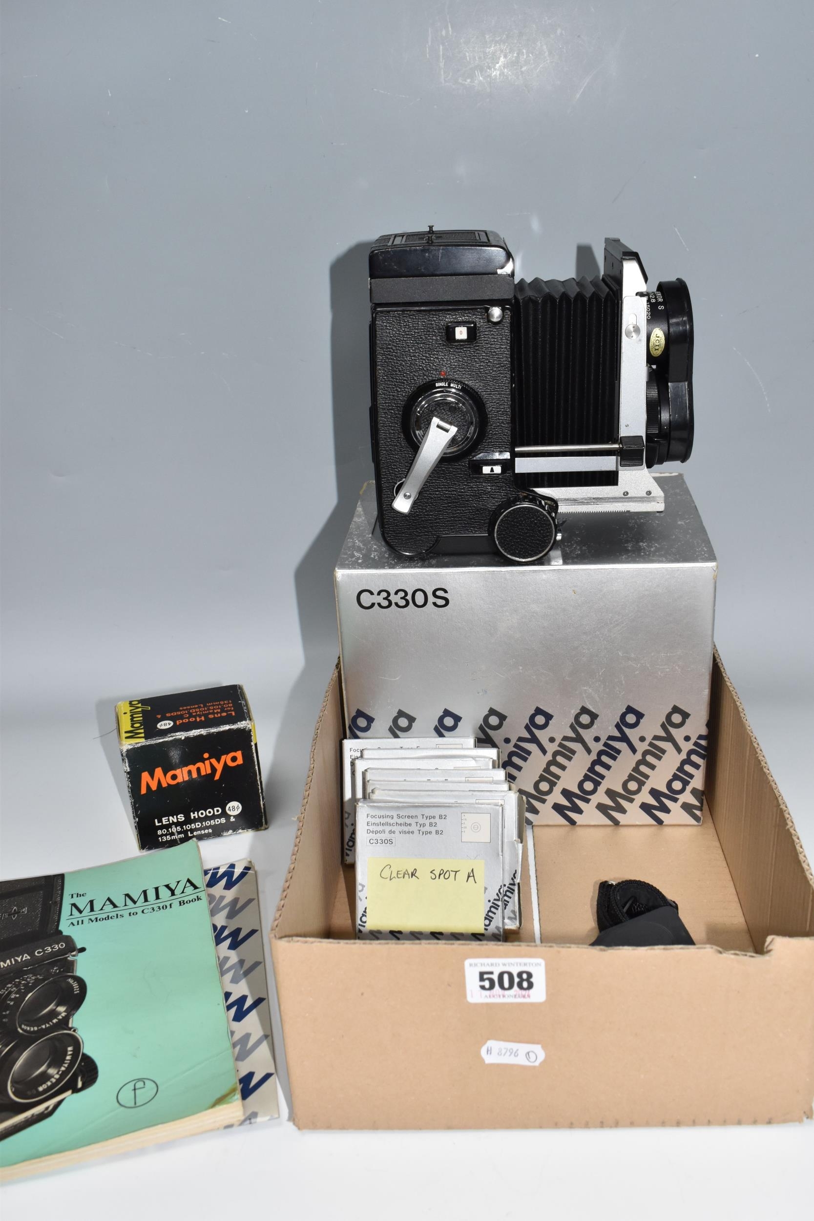 ONE BOX CONTAINING A MAMIYA PROFESSIONAL- S C330 CAMERA, serial number W200355, with a Mamiya - Sekor S f=80mm 1.28 lens serial number 15020, together with original box and two instruction books, a boxed Mamiya lens hood and seven boxed assorted Focusing Screens, camera appears in fair condition, untested (1 box)