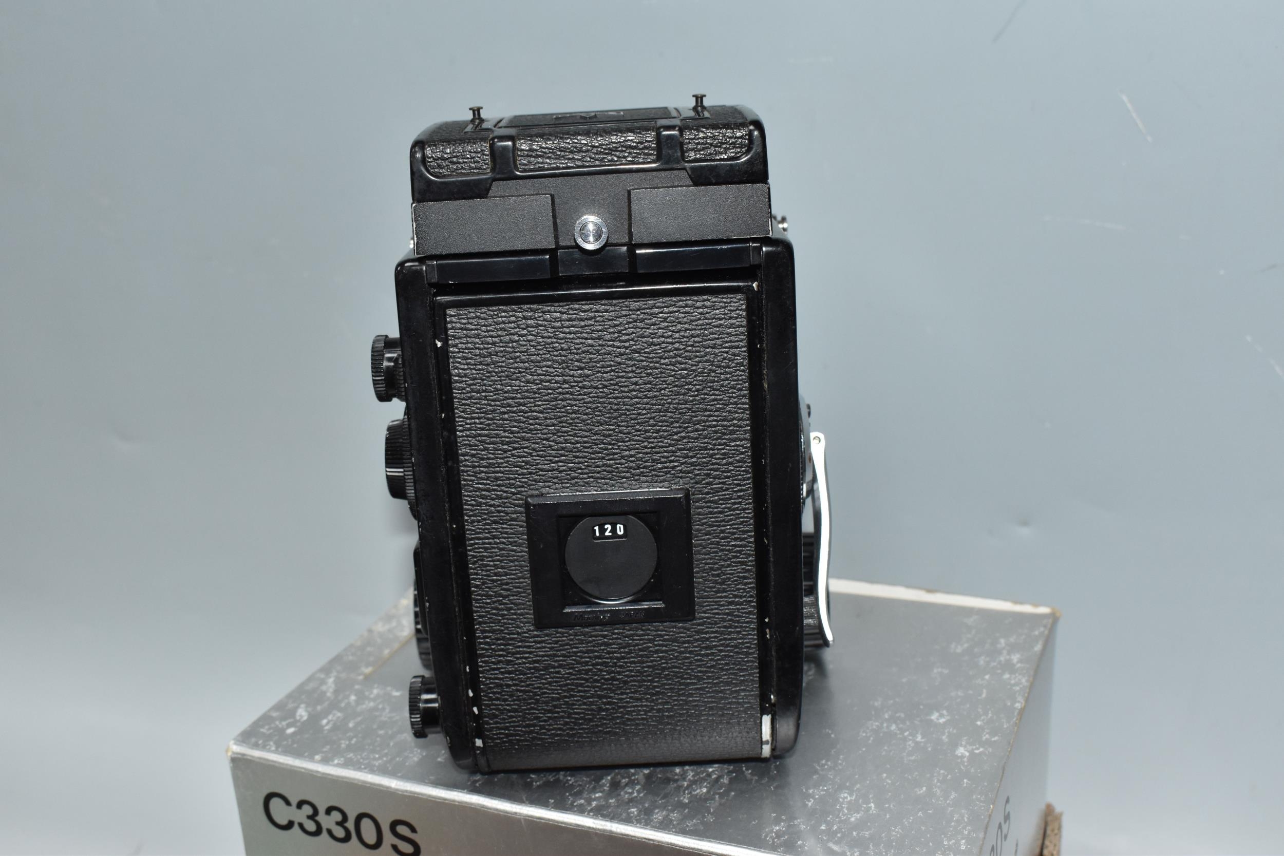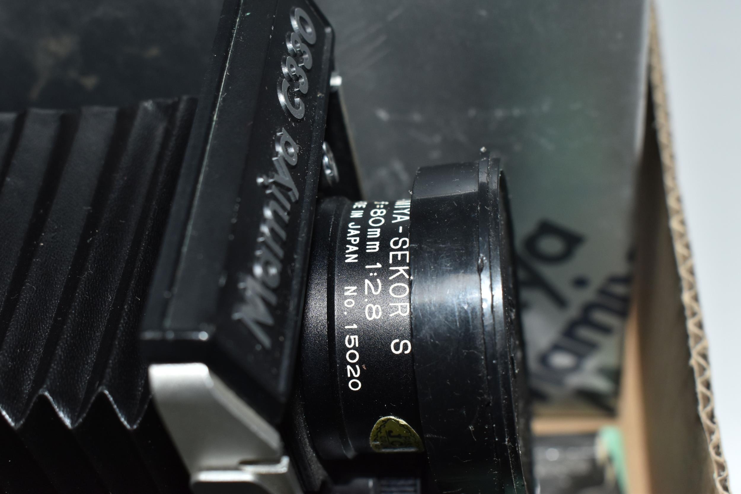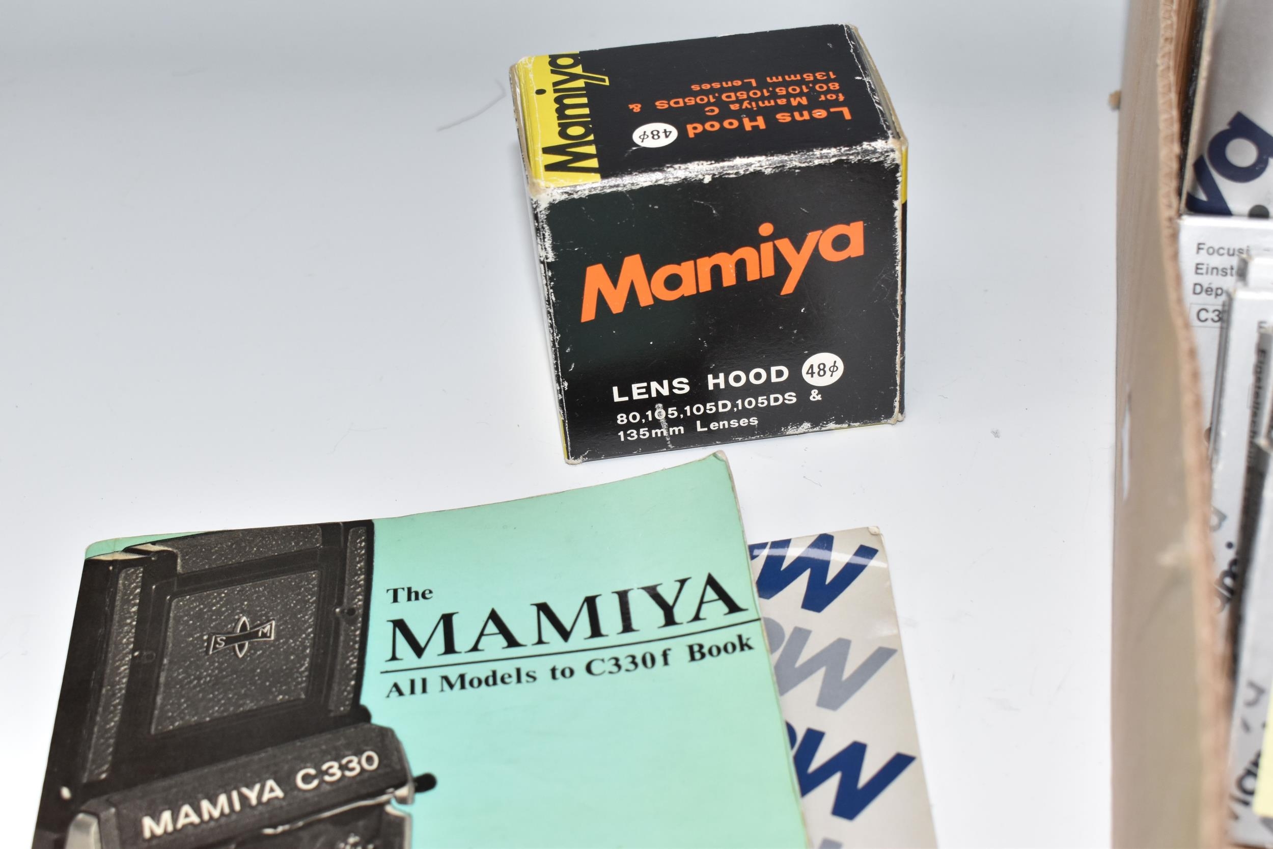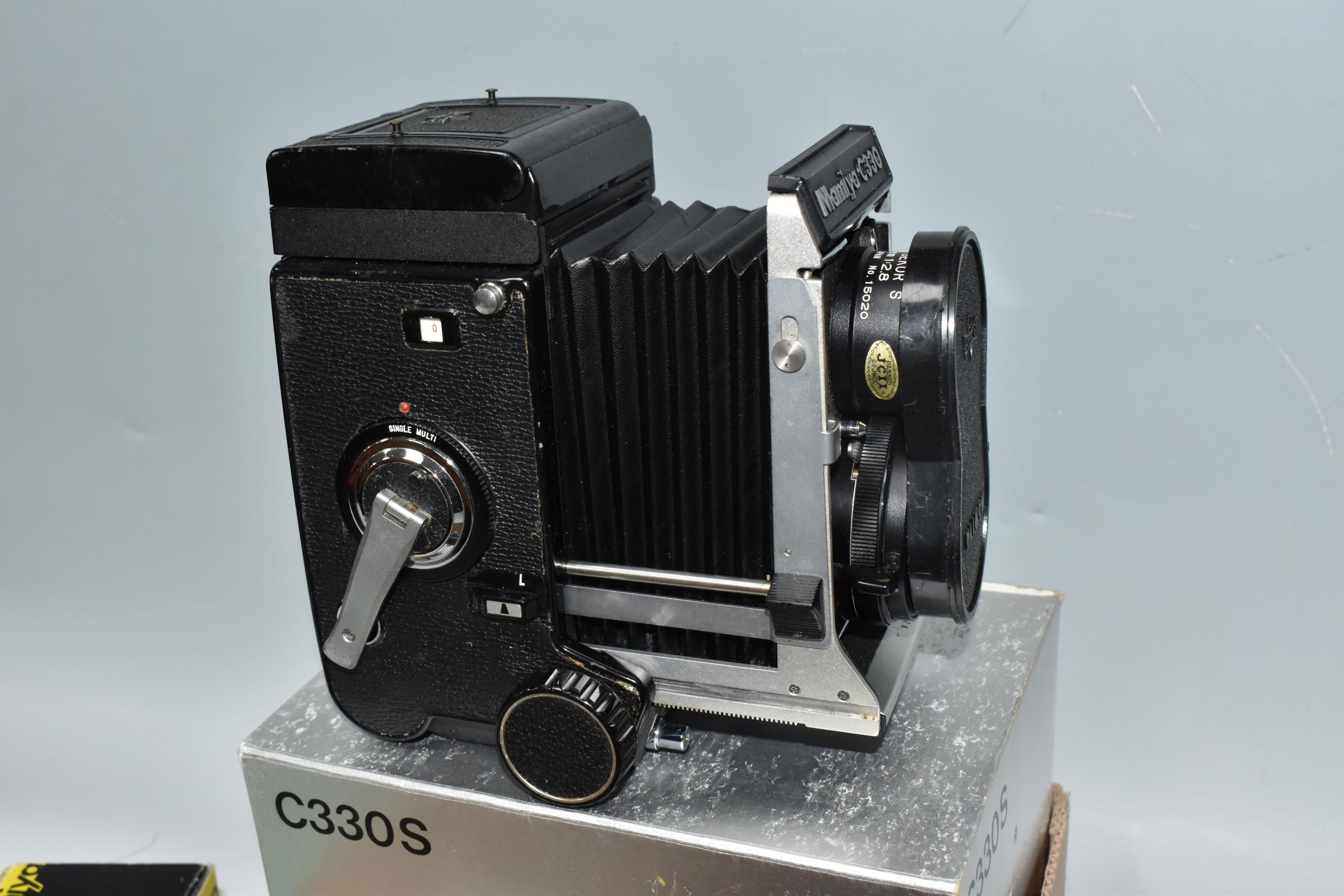 ONE BOX CONTAINING A MAMIYA PROFESSIONAL- S C330 CAMERA, serial number W200355, with a Mamiya - Sekor S f=80mm 1.28 lens serial number 15020, together with original box and two instruction books, a boxed Mamiya lens hood and seven boxed assorted Focusing Screens, camera appears in fair condition, untested (1 box)
