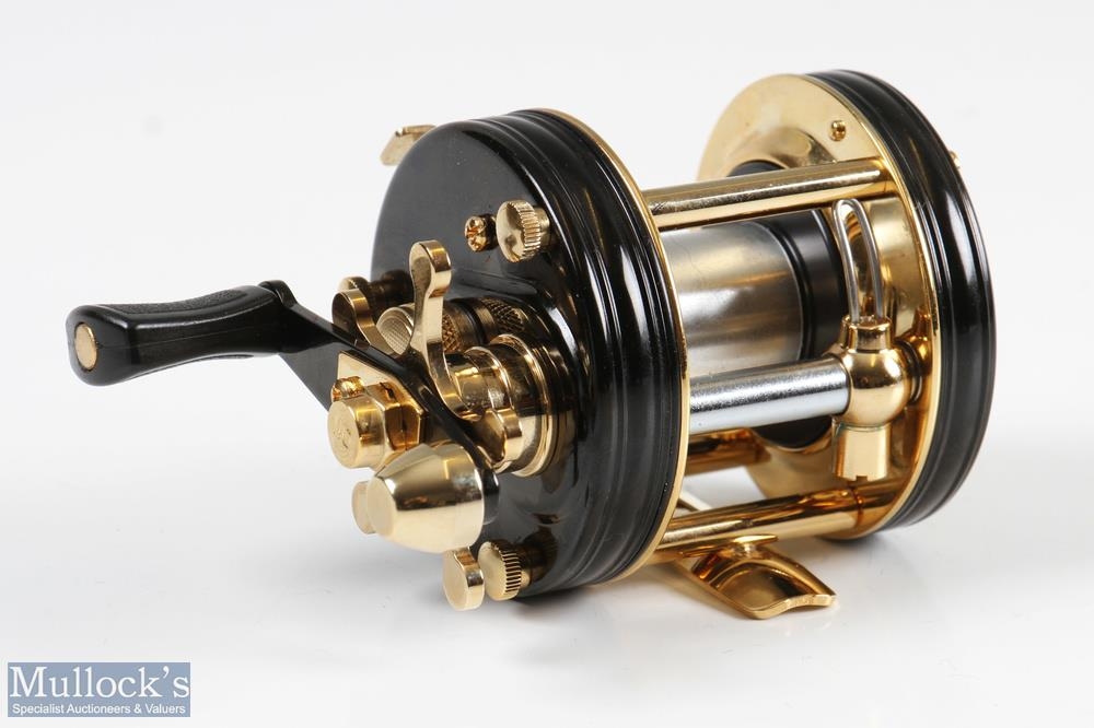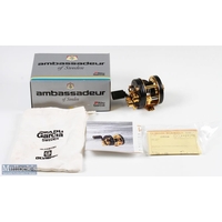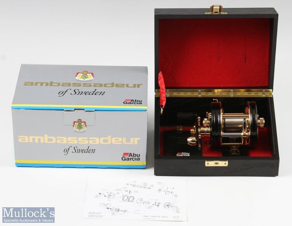 ABU Ambassadeur 5500CDL Tribute 1974-2014 reel in black and gold finish, limited edition 110-250 stamped to foot, counter balance handle, with wooden box with maker's plaque and maker's original card box - very clean overall condition