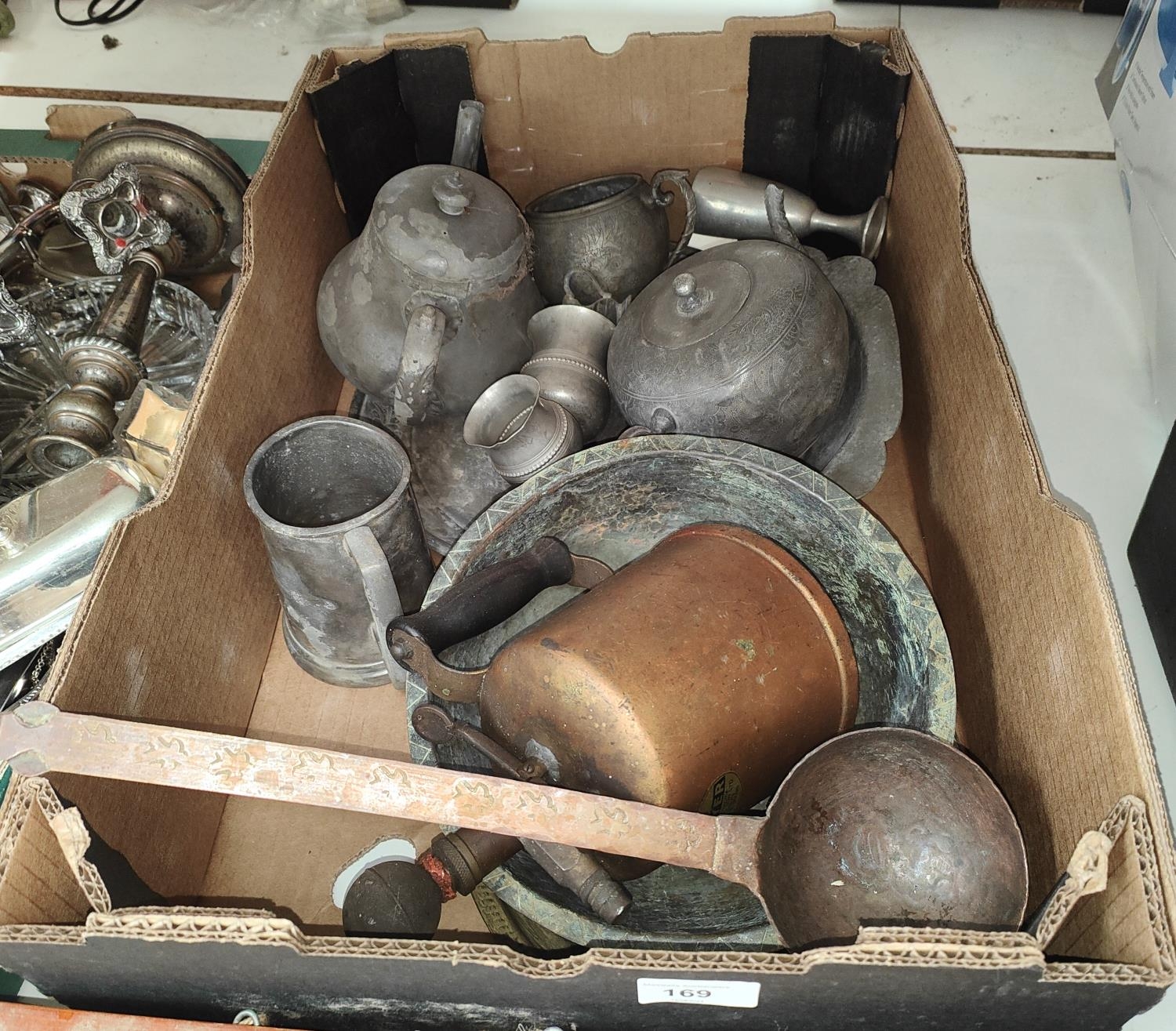A copper beaten ladle and a selection of pewter tea ware and other metalware etc.