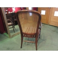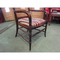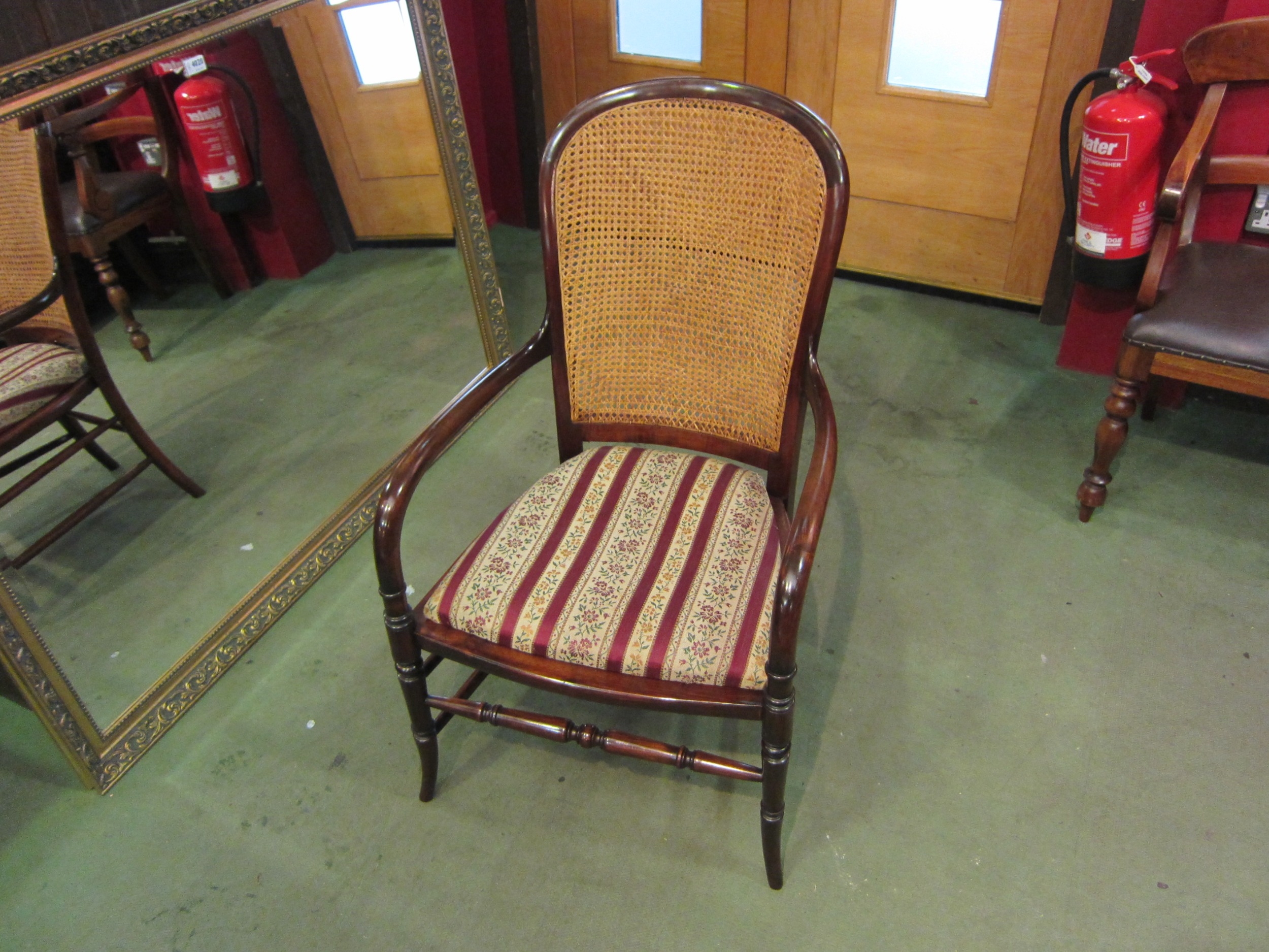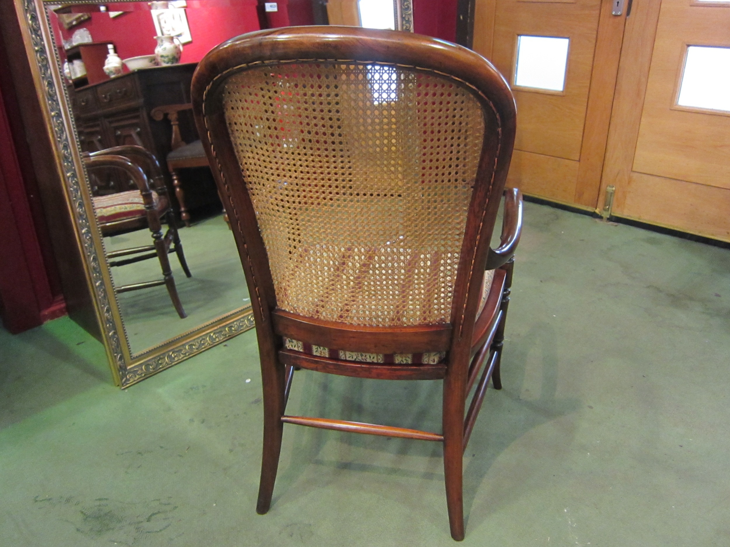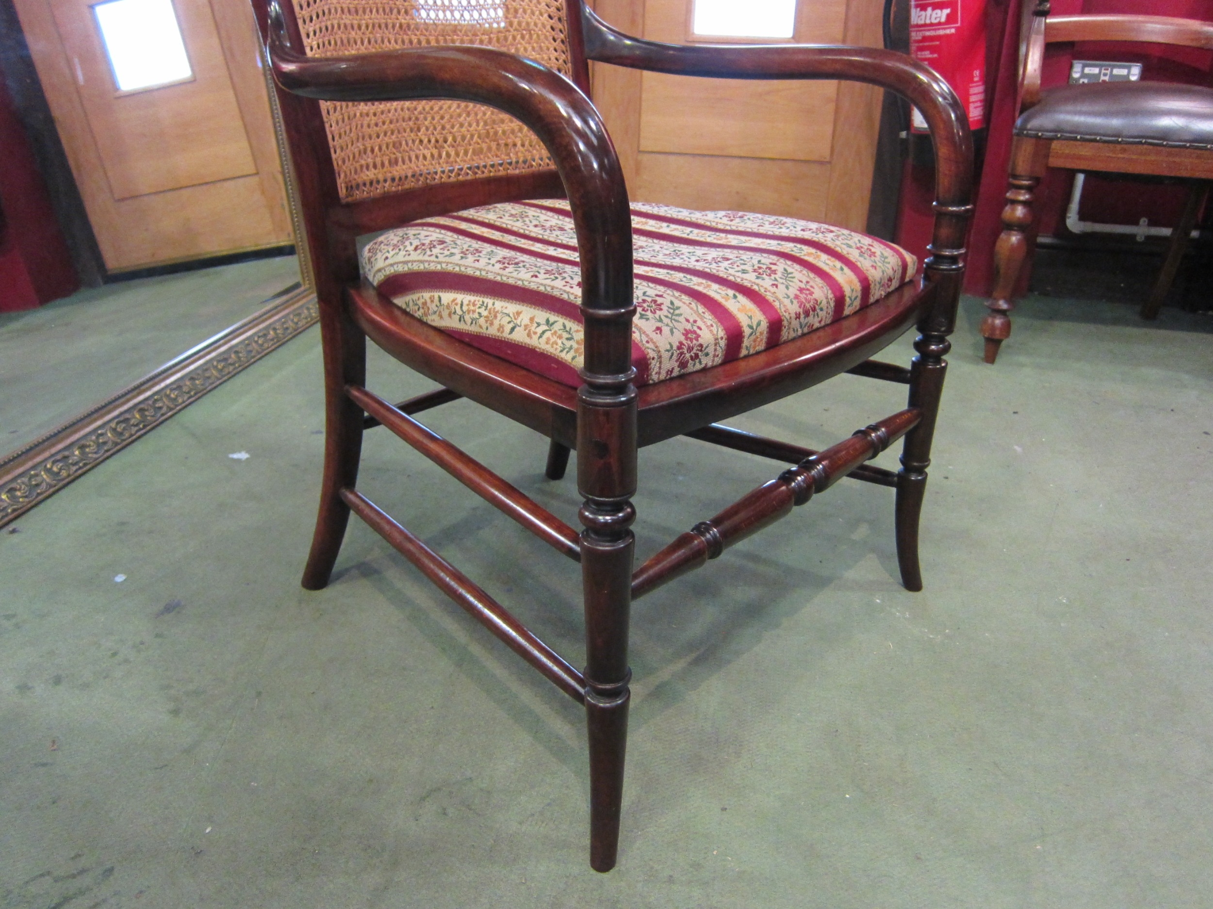 A late Victorian mahogany armchair, the caned back rest with bentwood armrests over ring turned outswept fore legs united by a turned stretcher (R) £60