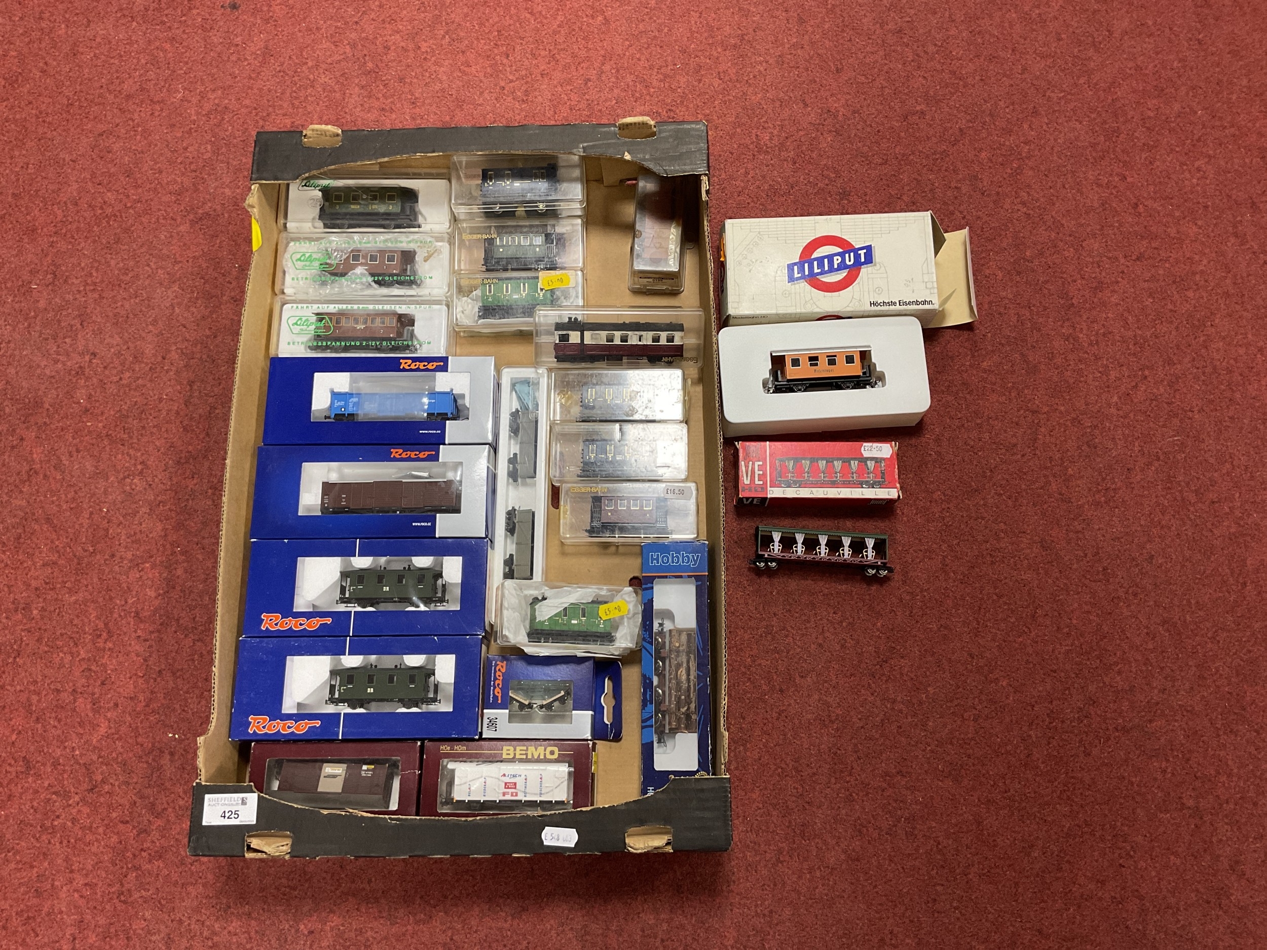 Approximately twenty-five boxed items of European outline HOe/009 rolling stock by Lilliput, Roco, BEMO, Egger-Bahn and others.