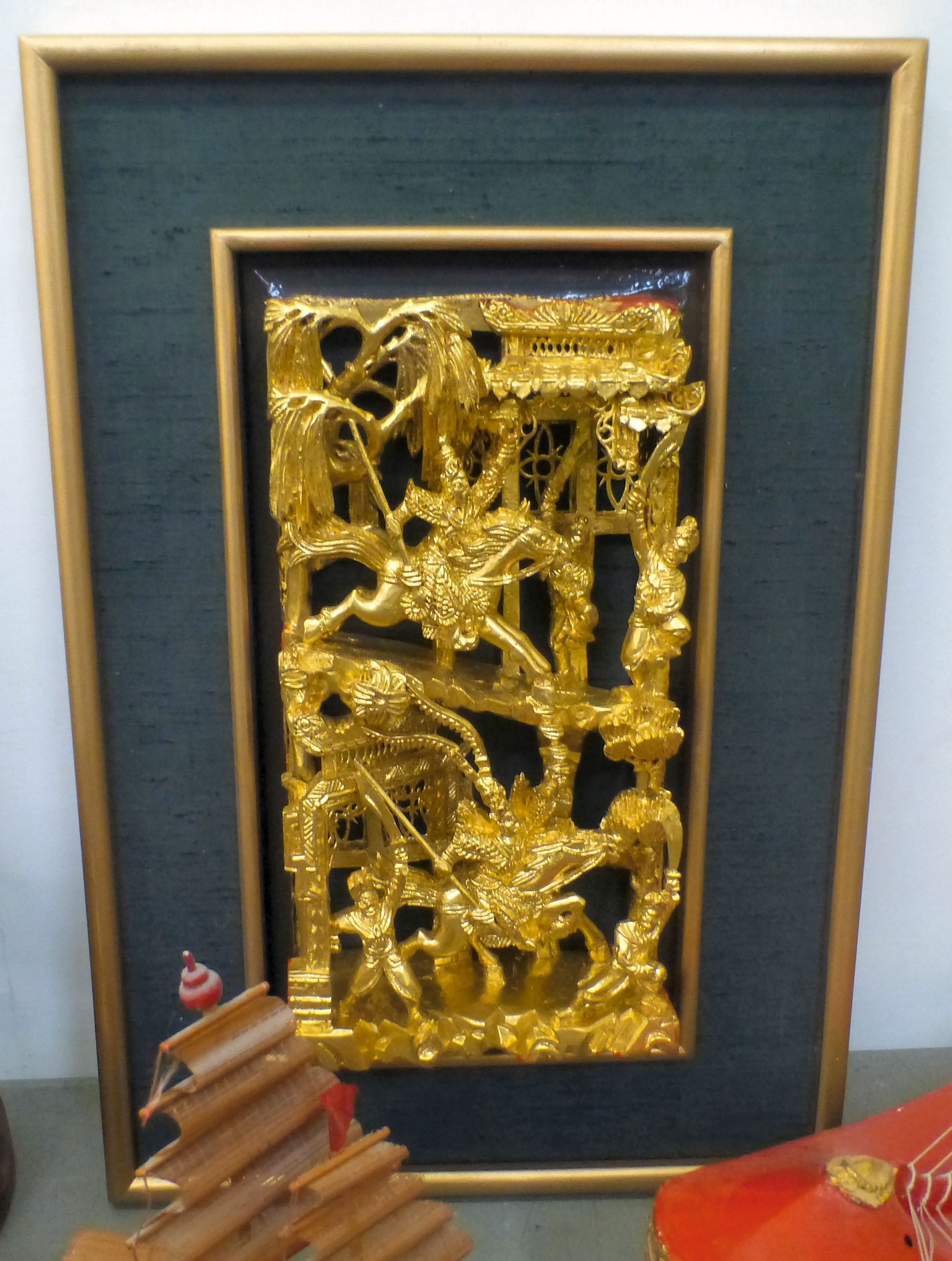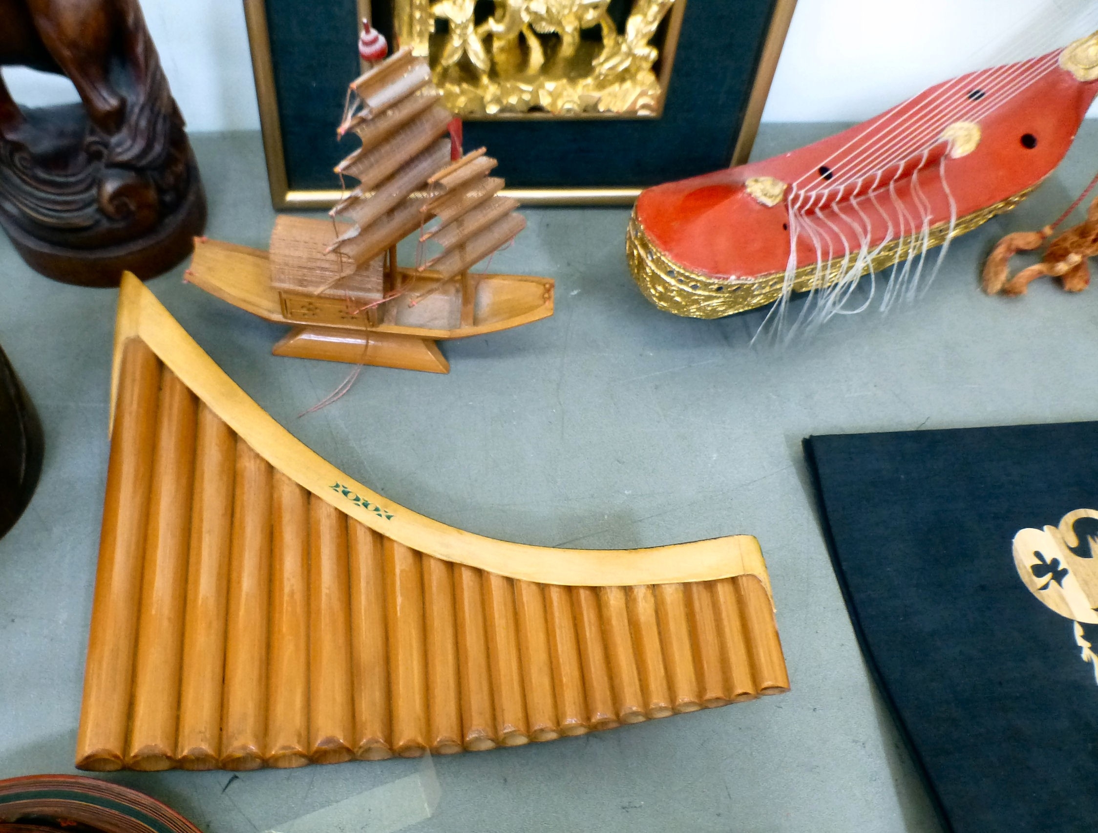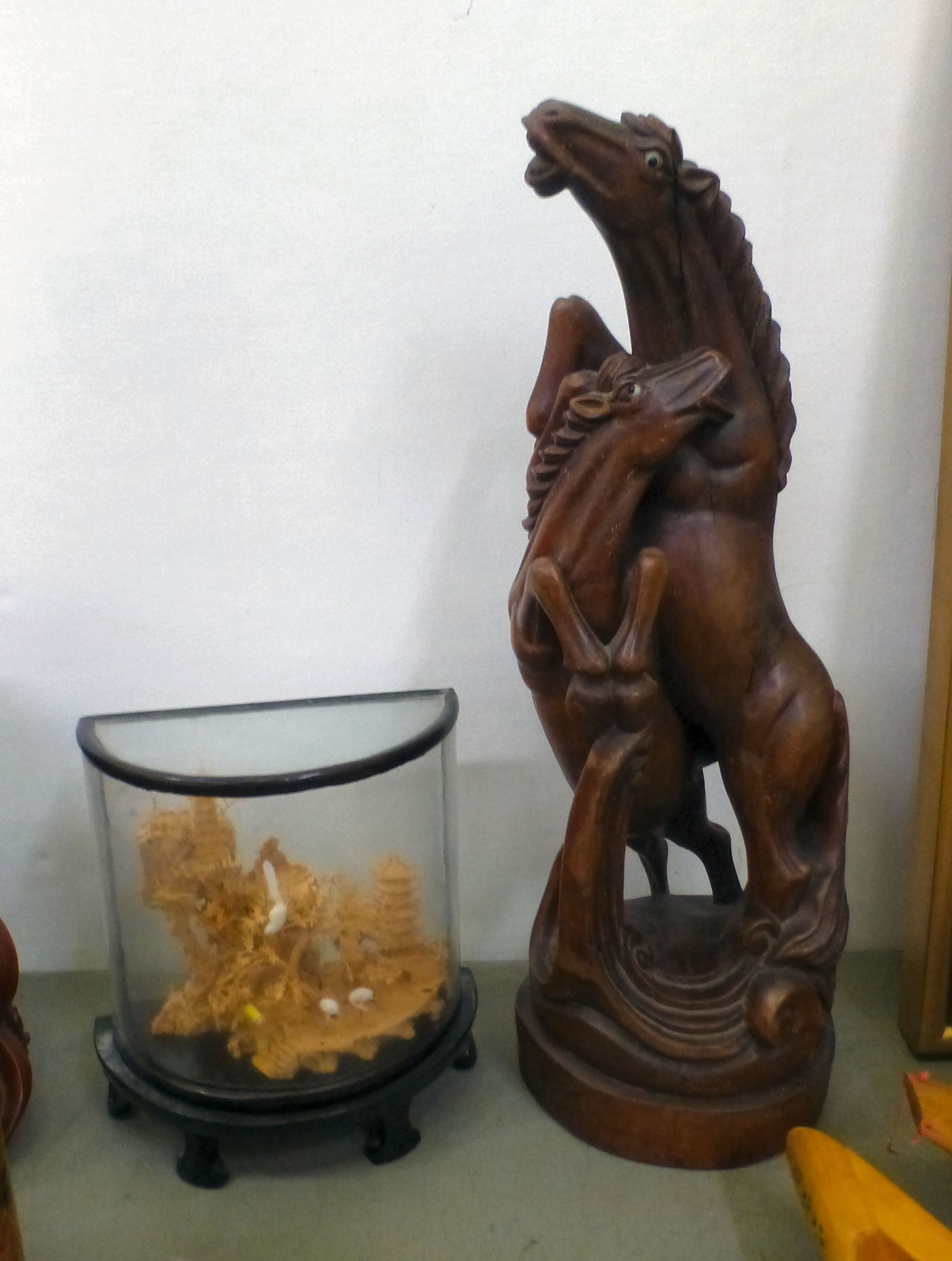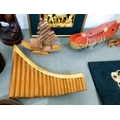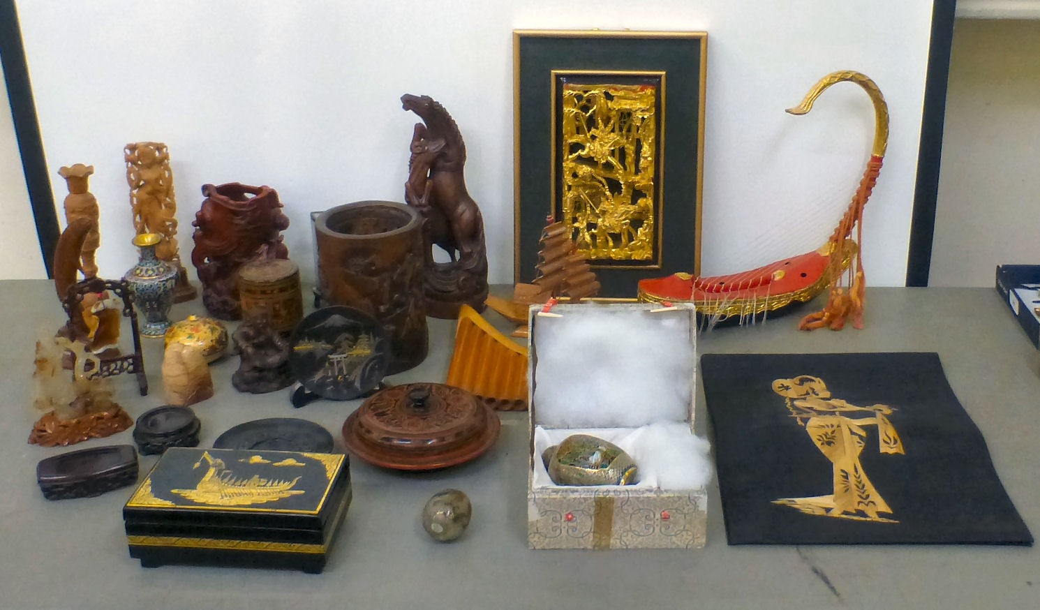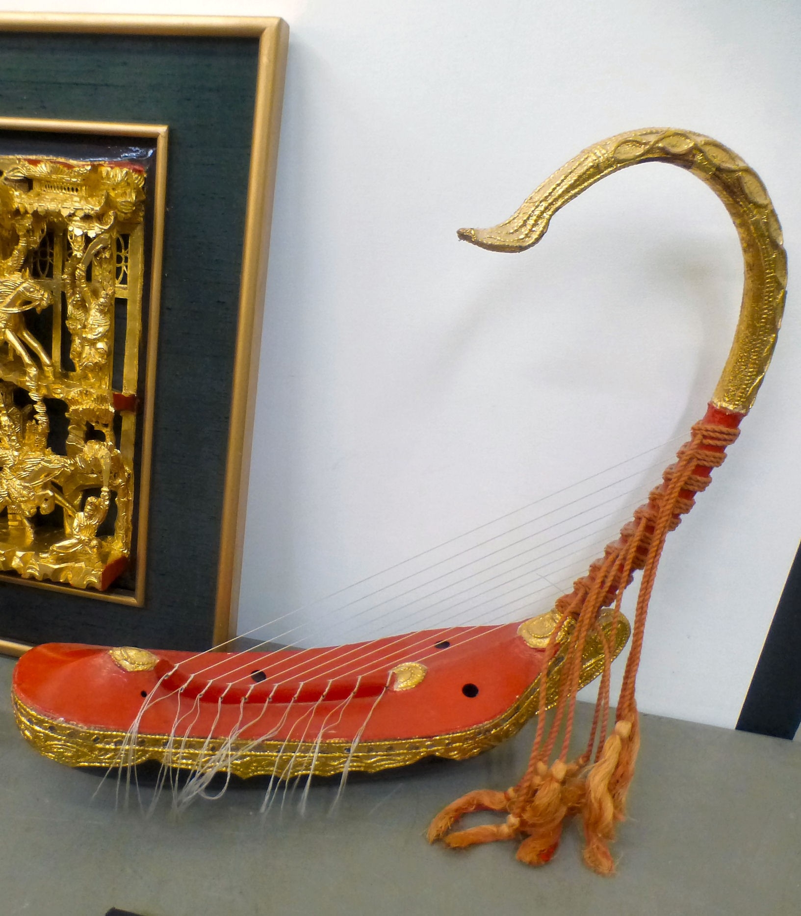 A mixed lot: to include a Saung-Guak harp, decorated with gilding 13"h; and a carved wooden model, two horses fighting 12"h