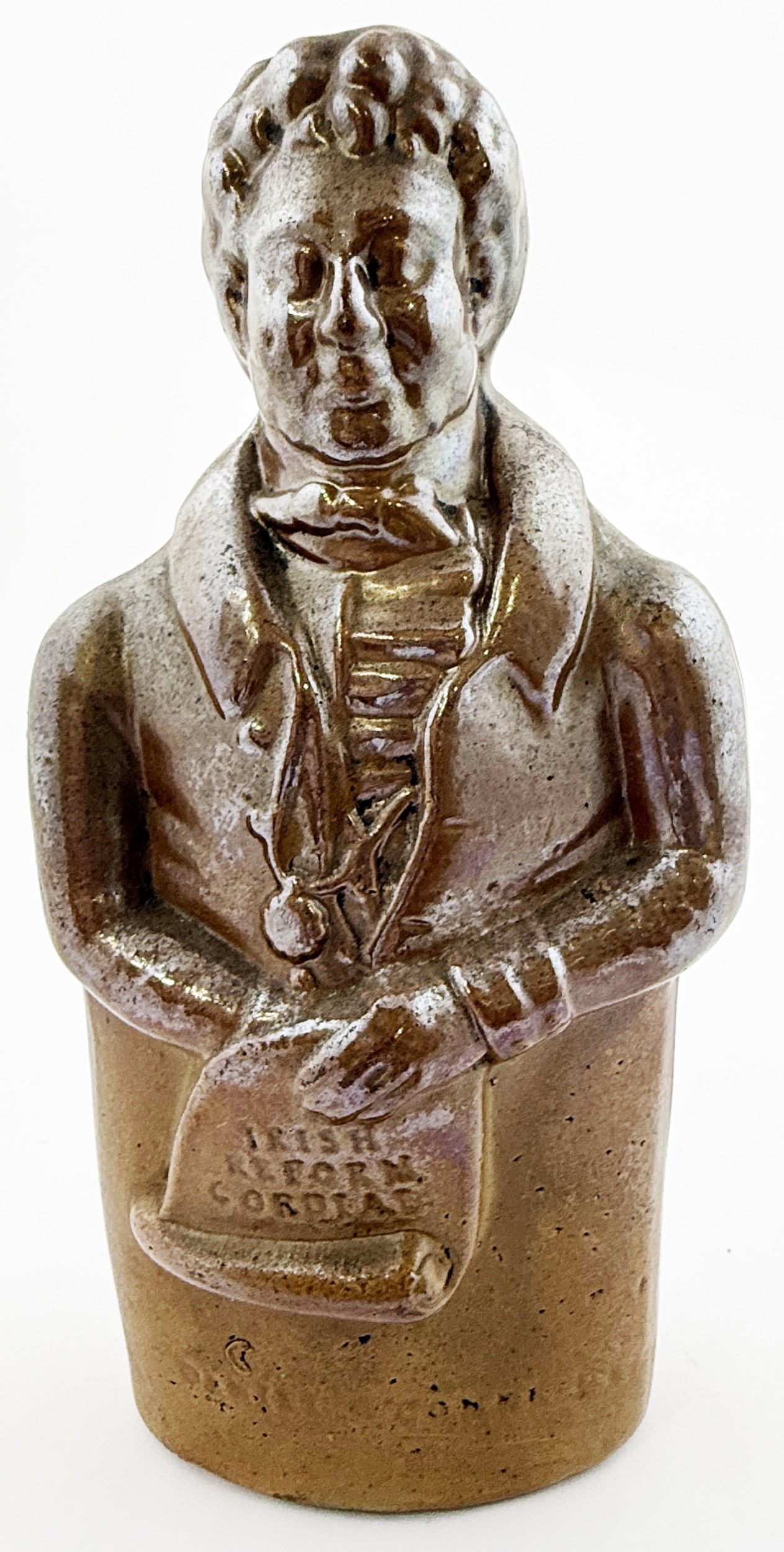 IRISH REFORM CORDIAL FLASK. RF p32. 7.25ins tall. Reform flask modelled as Daniel O Connell, unusual in that there is no pottery mark, these are usually Bourne Potteries pieces. Dudley Davidson collection. Excellent condition.