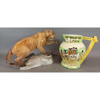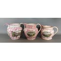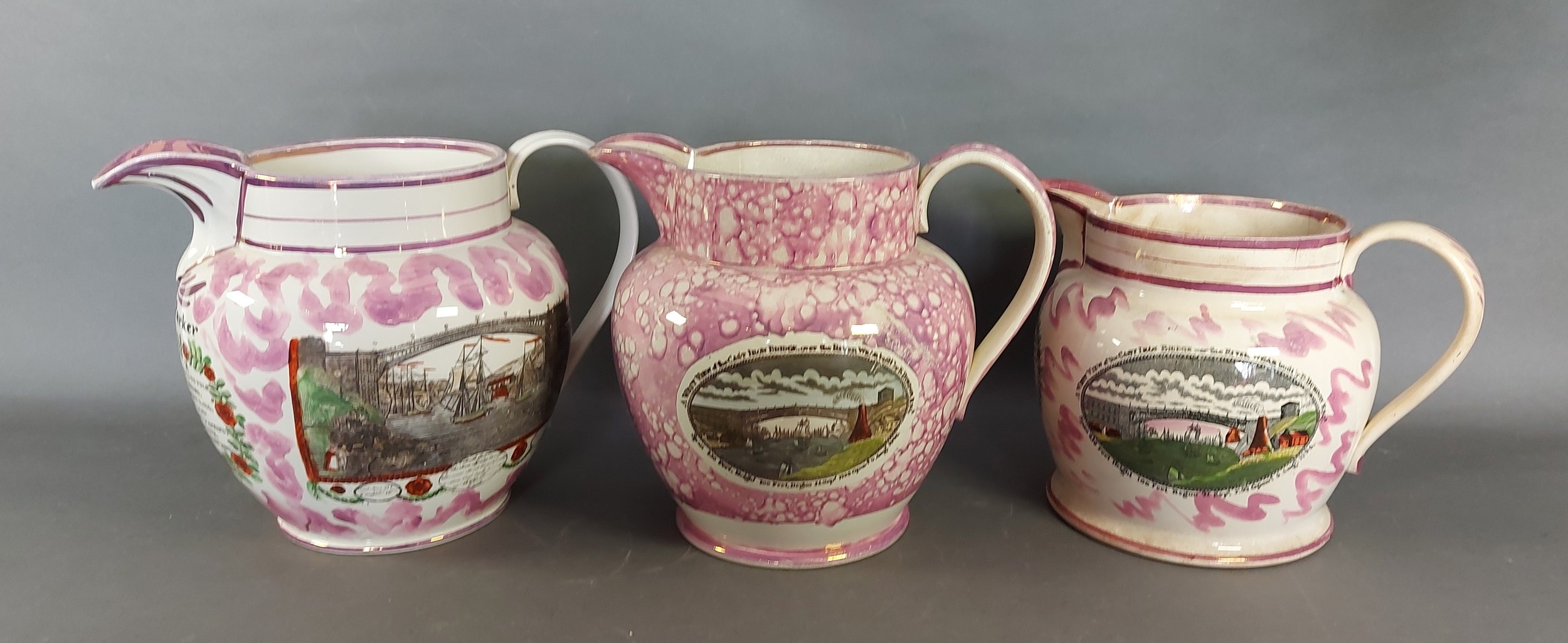 A large Sunderland lustre jug, a West View of the cast iron bridge over the river Wear, 17.5cms tall together with two similar large Sunderland lustre jugs