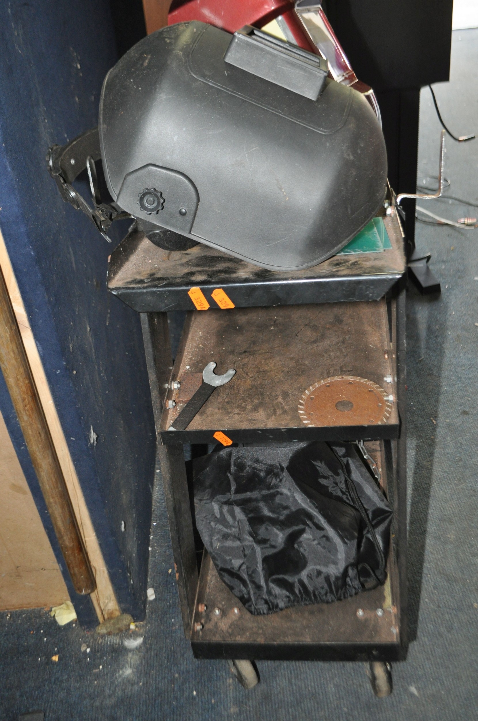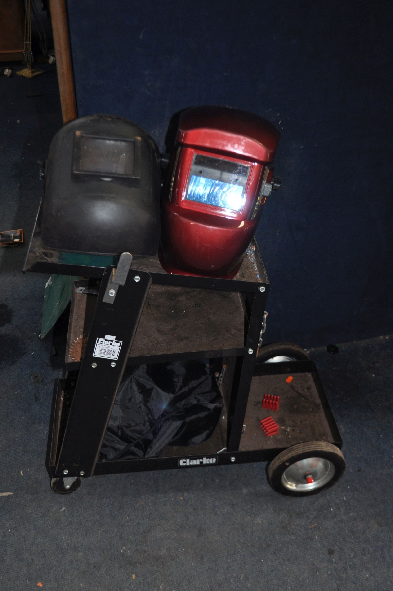 A CLARKE GWC1 WHEELED WELDER STAND with two masks (3)