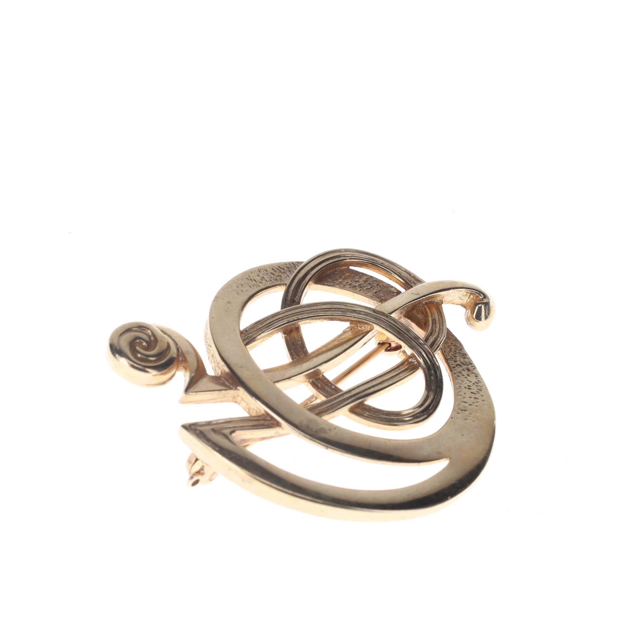 Ola Gorie Kells 9ct Gold Brooch. This piece is hallmarked 375 along with the makers mark OMG on its reverse. The brooch measures approximately 3.5cm by 3cm, weighs in total 7.4g.