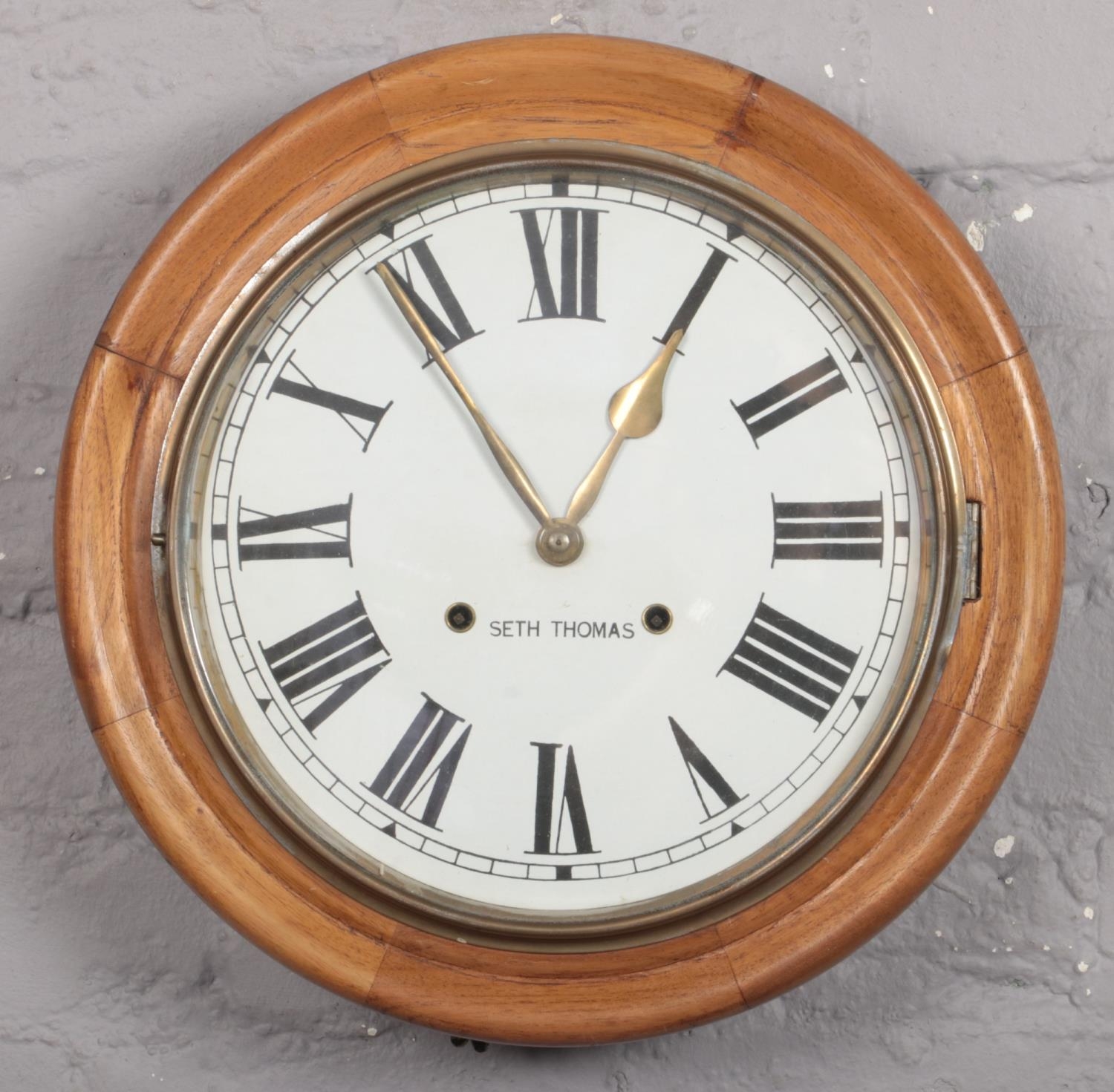 A walnut cased 8 day school clock. With painted dial having Roman numeral markers and signed Seth Thomas. Dial 30.5cm diameter.