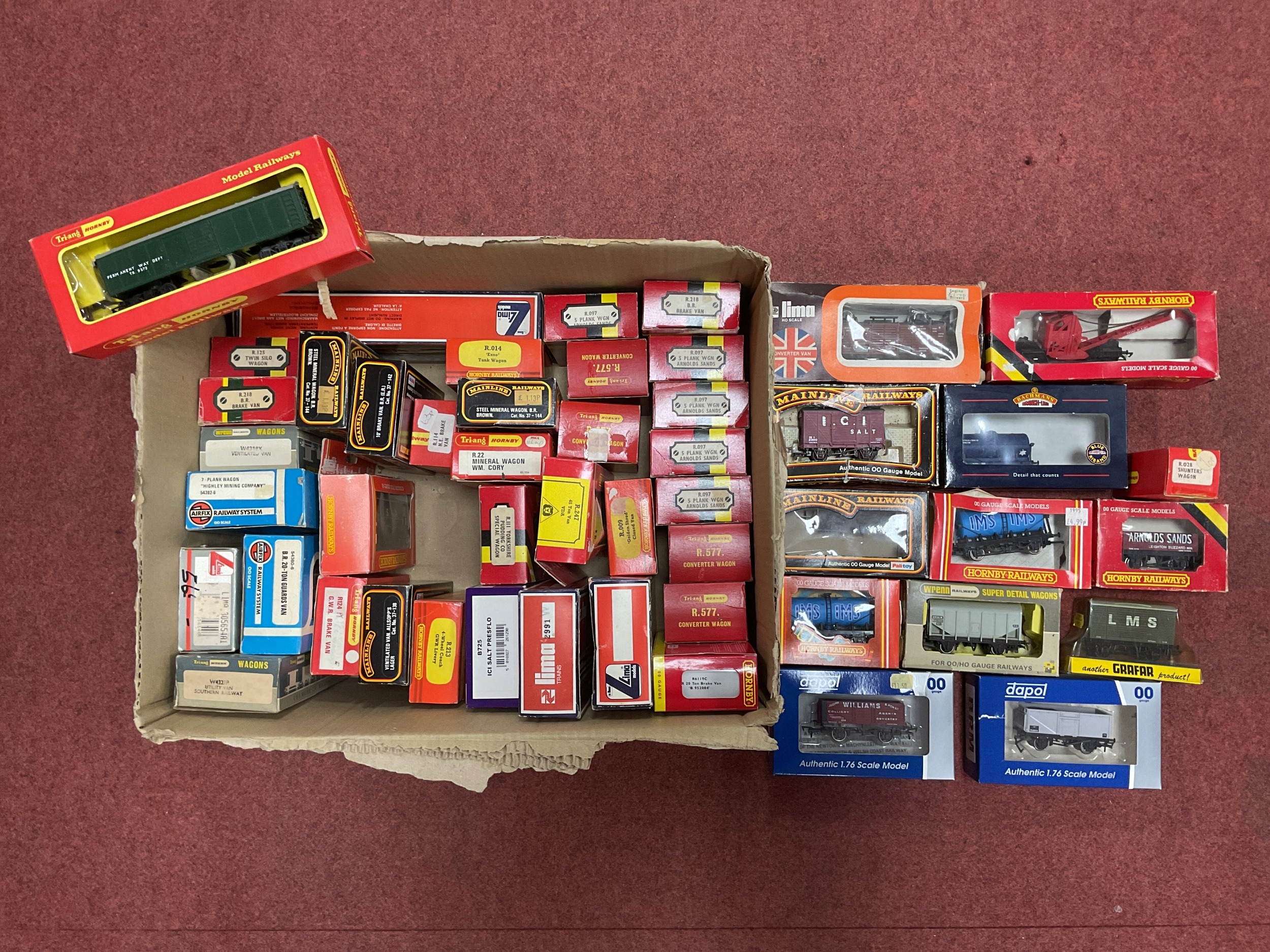 Thirty Five boxed OO gauge wagons by Bachmann, Mainline, Hornby, Lima, Dapol and others. Faults to most boxes noted.