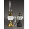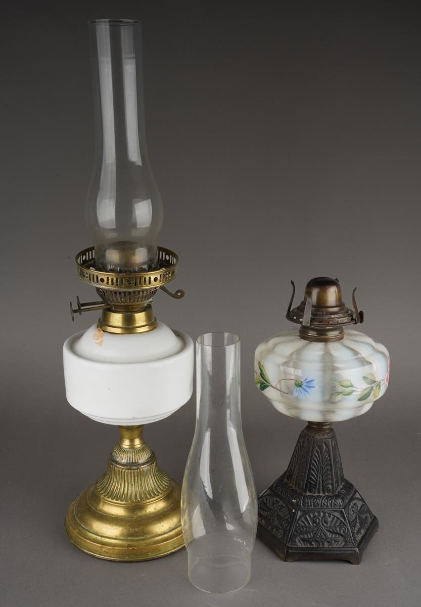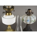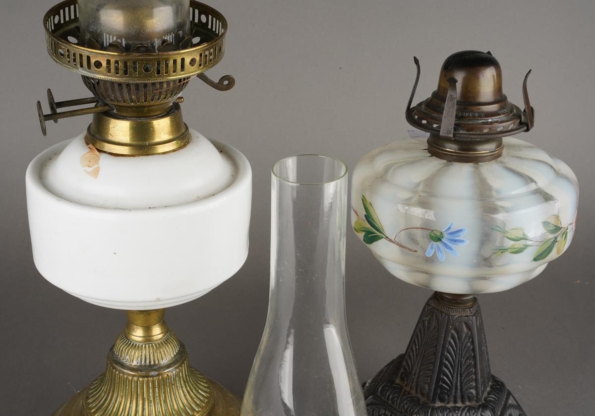 A "Queen Anne" cast metal based oil lamp, the opaline glass reservoir painted with flowers, approx 30cm high together with a 19th Century brass oil lamp with white ceramic reserve and "British Make" mechanism and a miscellaneous oil lamp glass chimney [1 box]