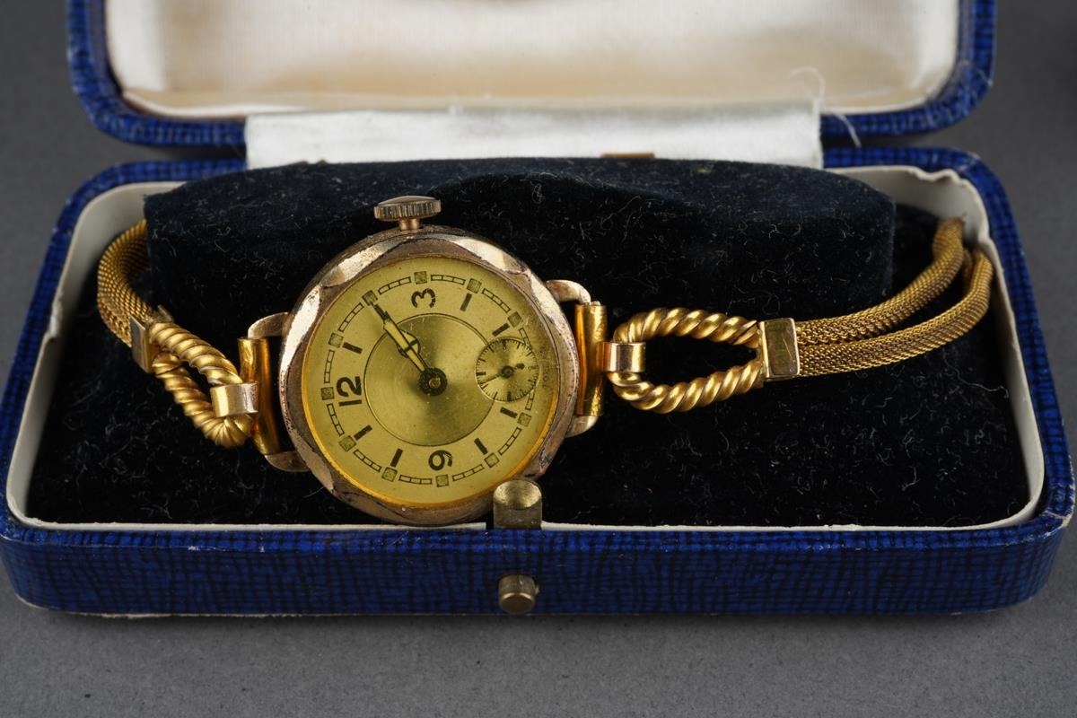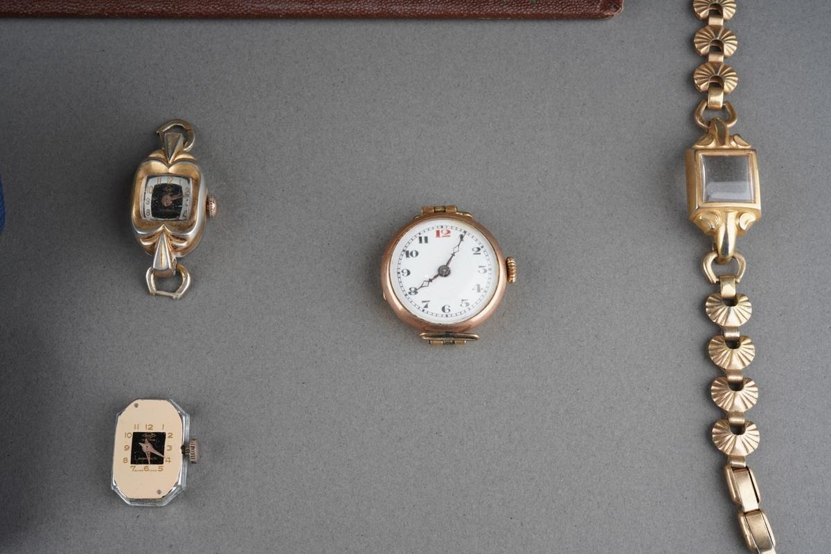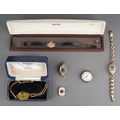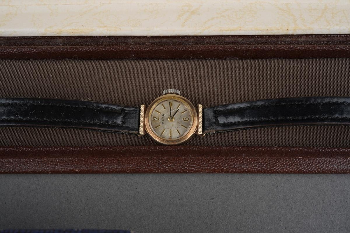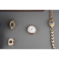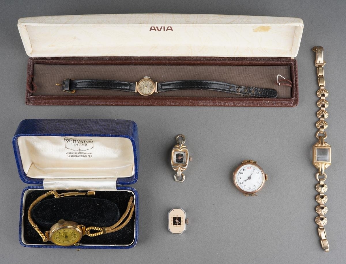 A collection of ladies watches to include 9 ct ladies watch ( approx. 15g), 9 ct gold Avia watch ( approx. 6.4g) and a further gold plated one ( q)