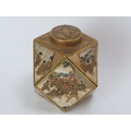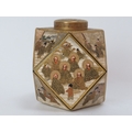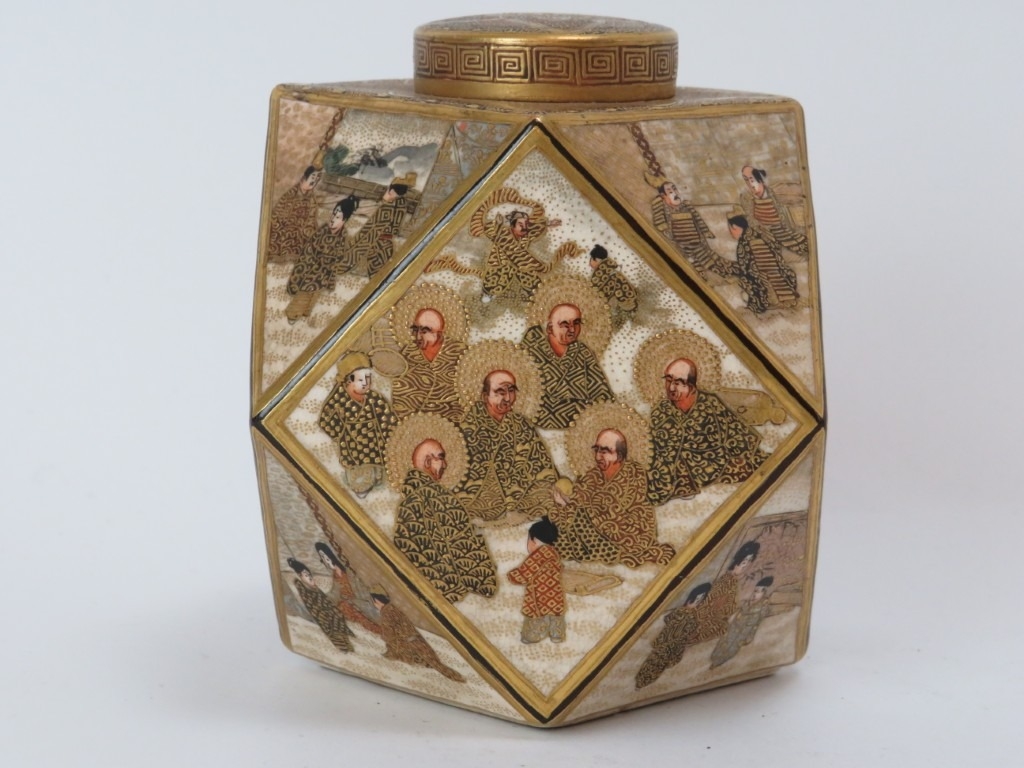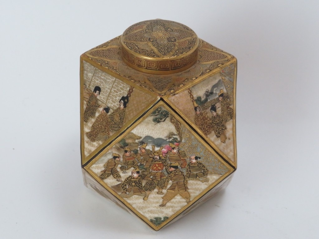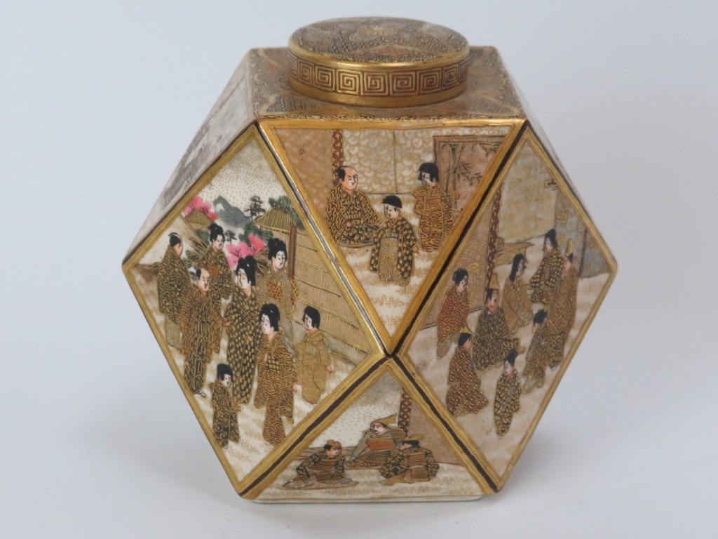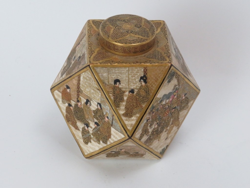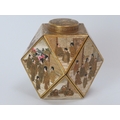 A rare Japanese satsuma polyhedral tea caddy with cover, Meiji period (1868-1912). Of octahedral form with each facet finely decorated with a variety of figural scenes. Signed 大日本雲? with Shimazu mark. 10.5 cm height.