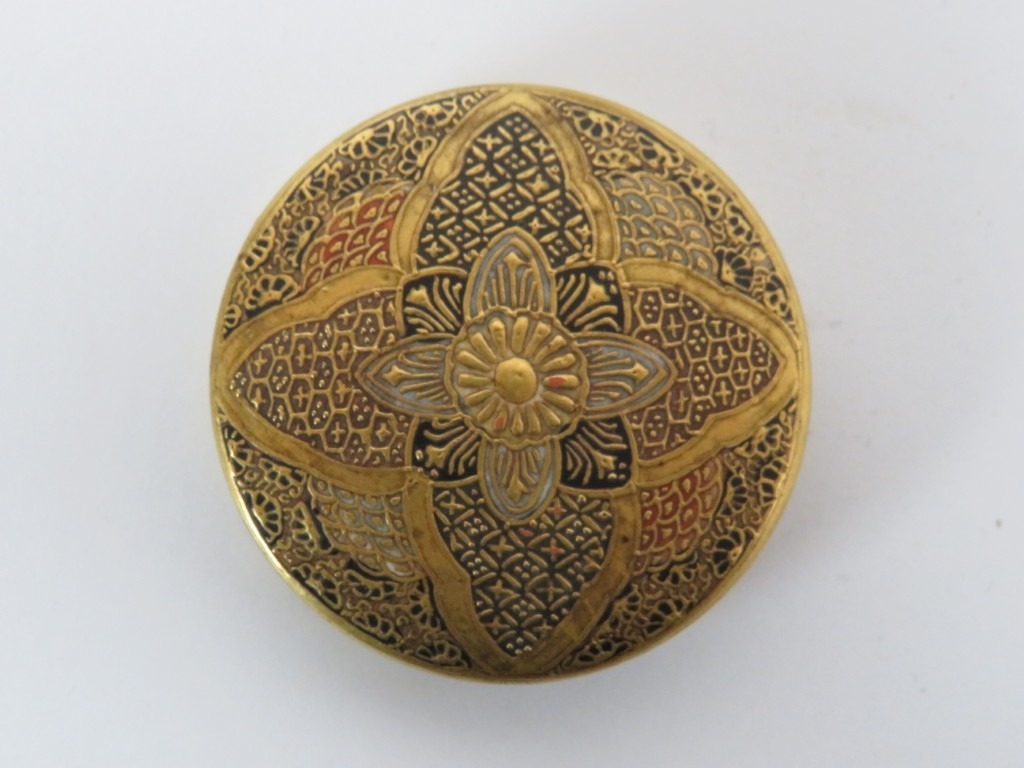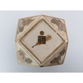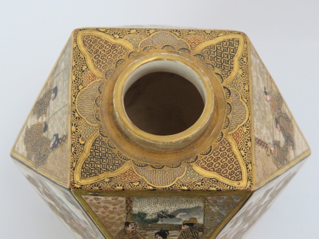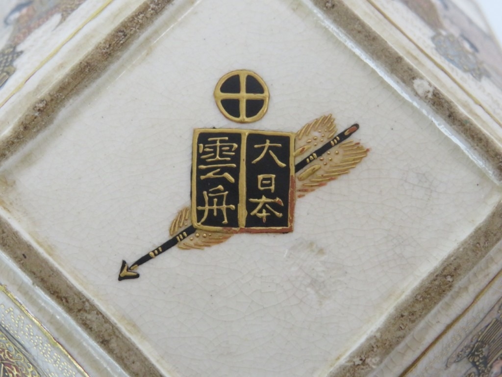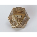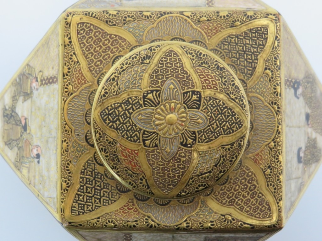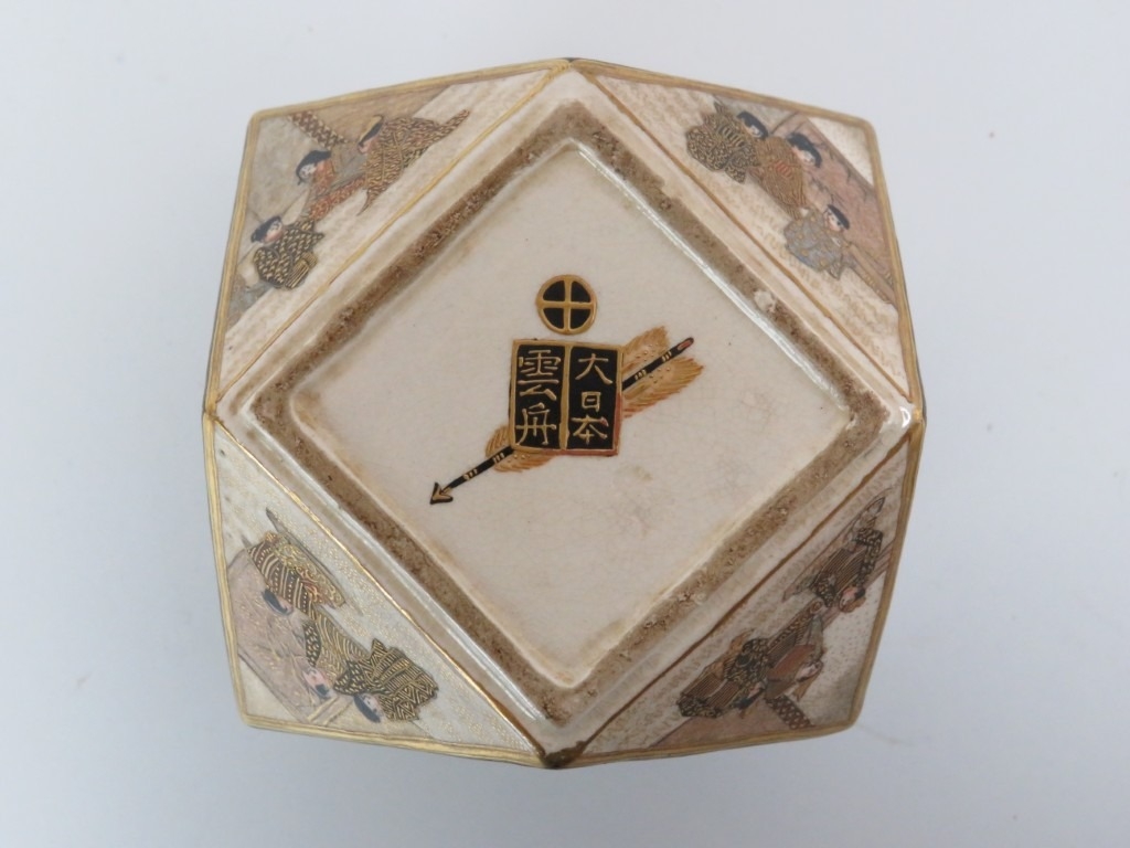 A rare Japanese satsuma polyhedral tea caddy with cover, Meiji period (1868-1912). Of octahedral form with each facet finely decorated with a variety of figural scenes. Signed 大日本雲? with Shimazu mark. 10.5 cm height.
