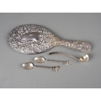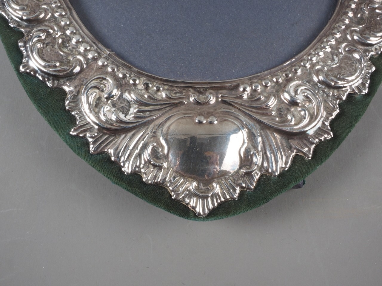 An embossed oval silver easel photograph frame, 12" high
