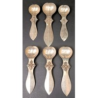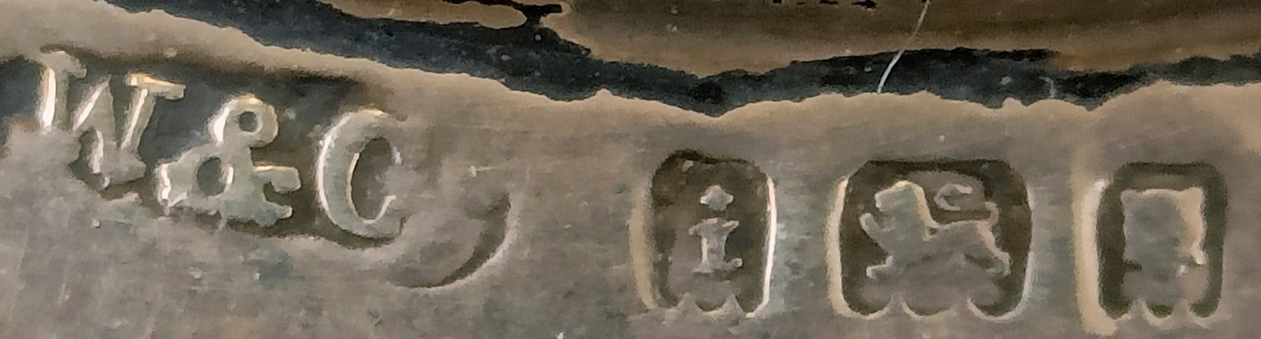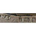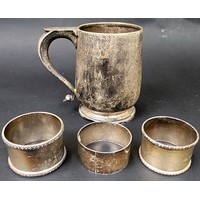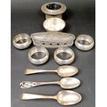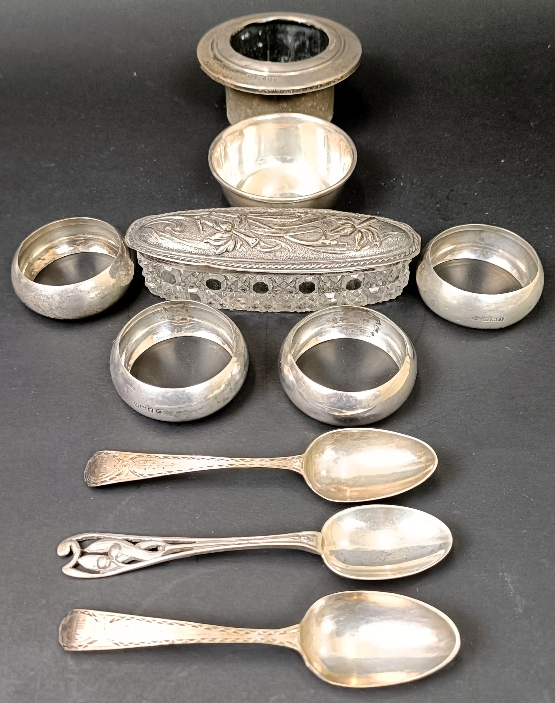 A set of four silver napkin rings, a small silver bowl, three teaspoons, 3.3 ozt, a silver mount, and a cut glass box with a silver top