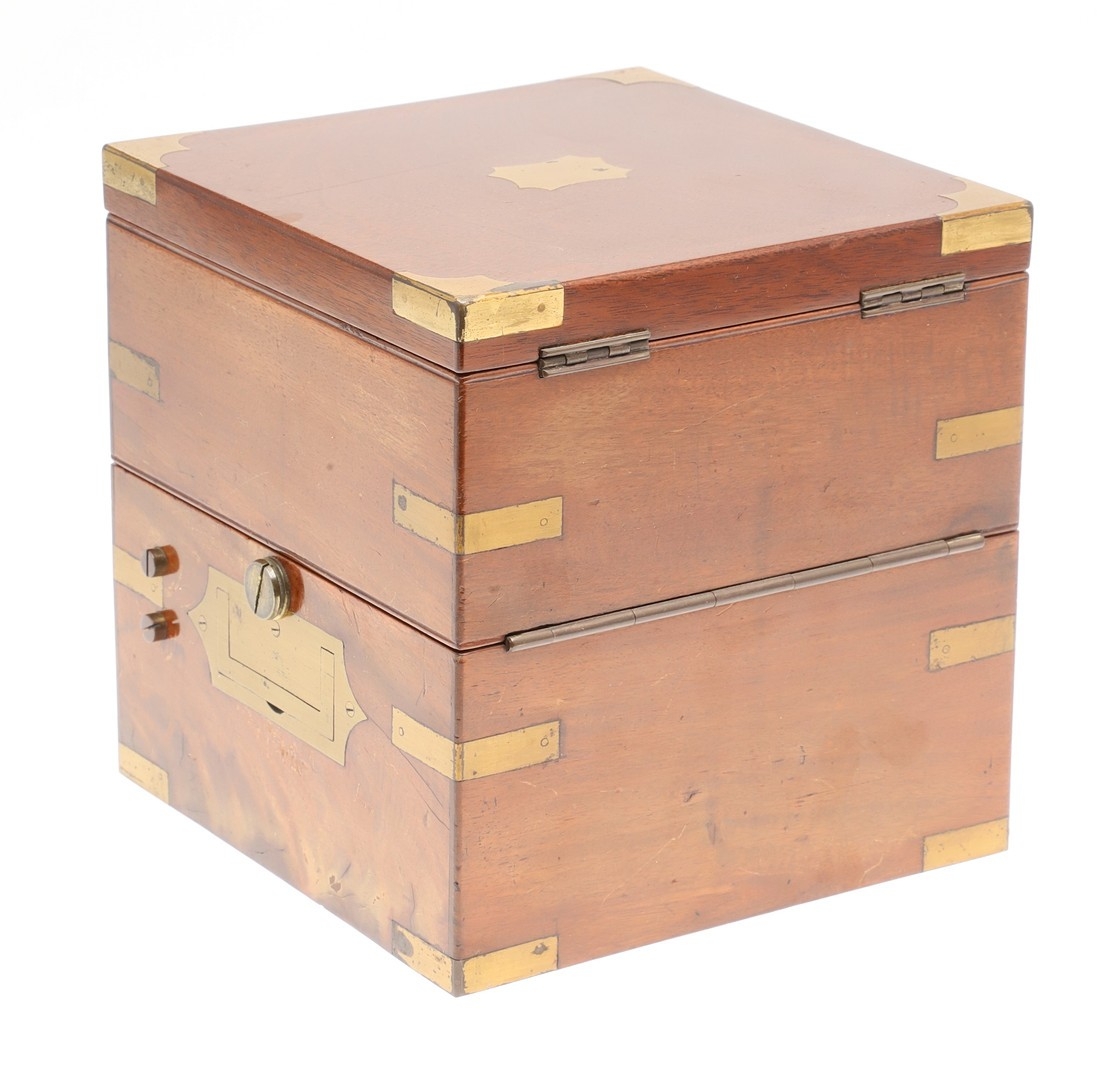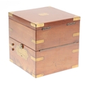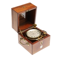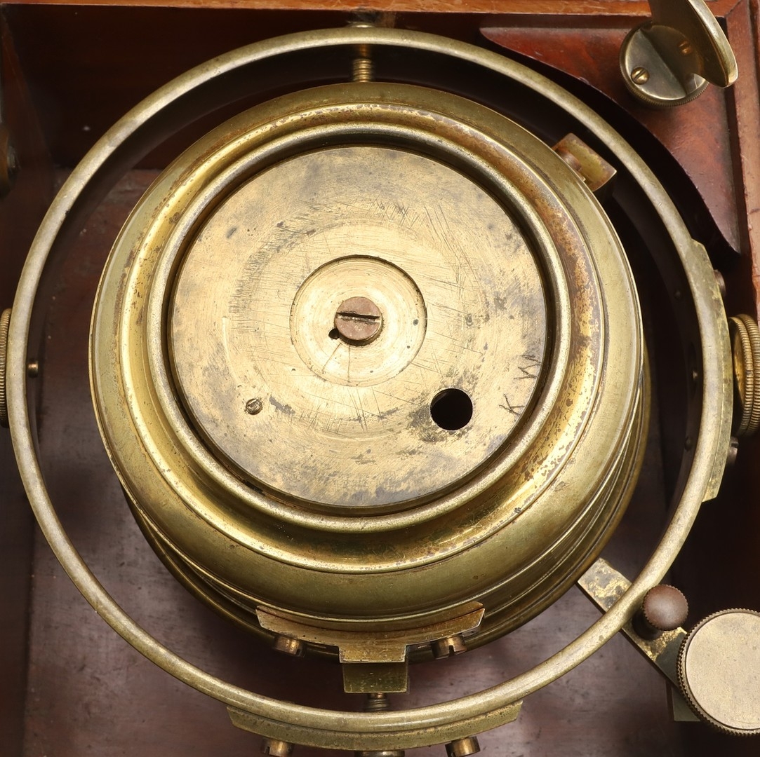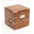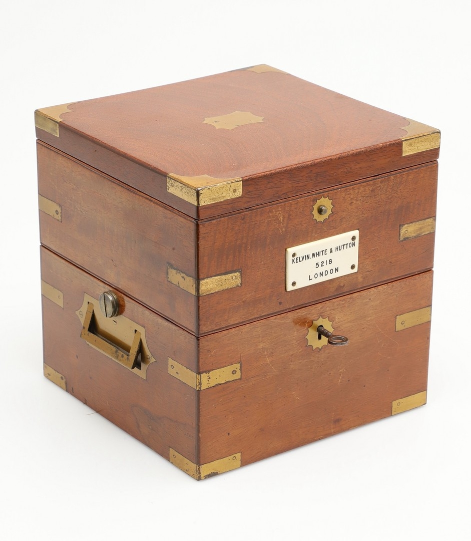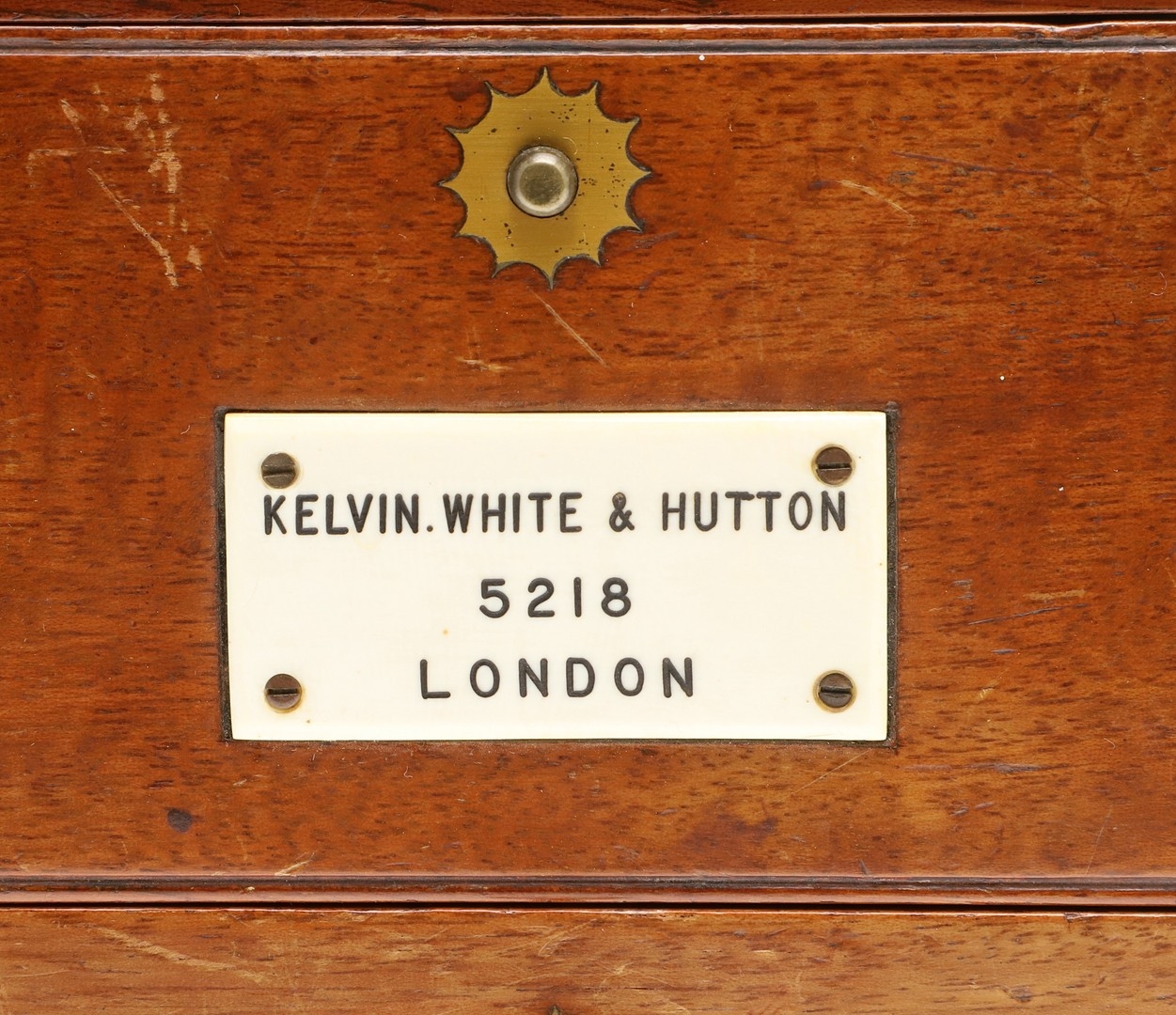 A TWO DAY MARINE CHRONOMETER BY KELVIN WHITE & HUTTON, NO. 5218. 19th century, the signed 4" silvered dial the with power reserve and seconds subsidiaries, typical chain-fusee movement, gimbal mounted in a brass bound mahogany case with recessed handles, bearing ivory maker's plaque, with winder and case key, 19cm square