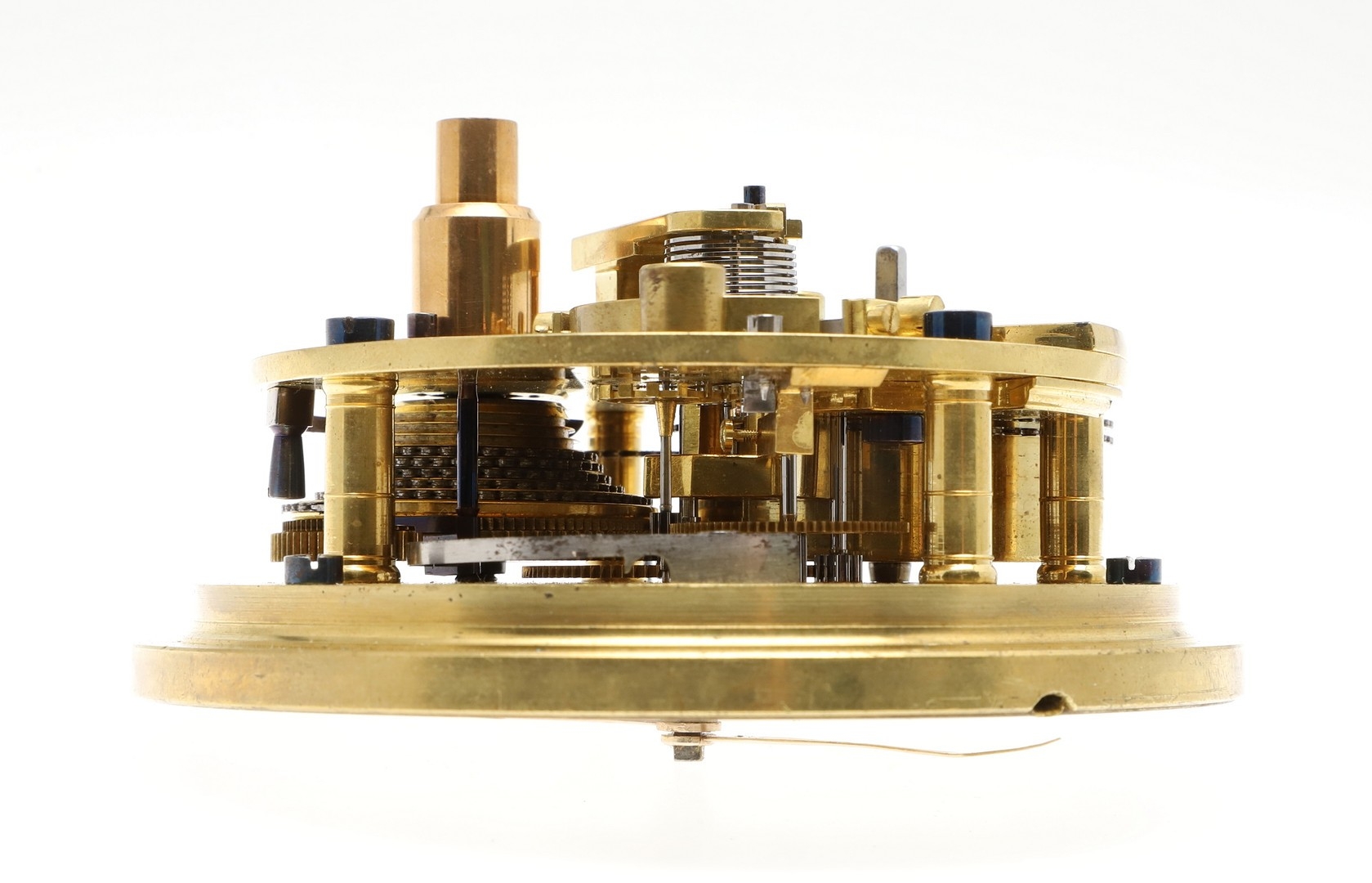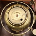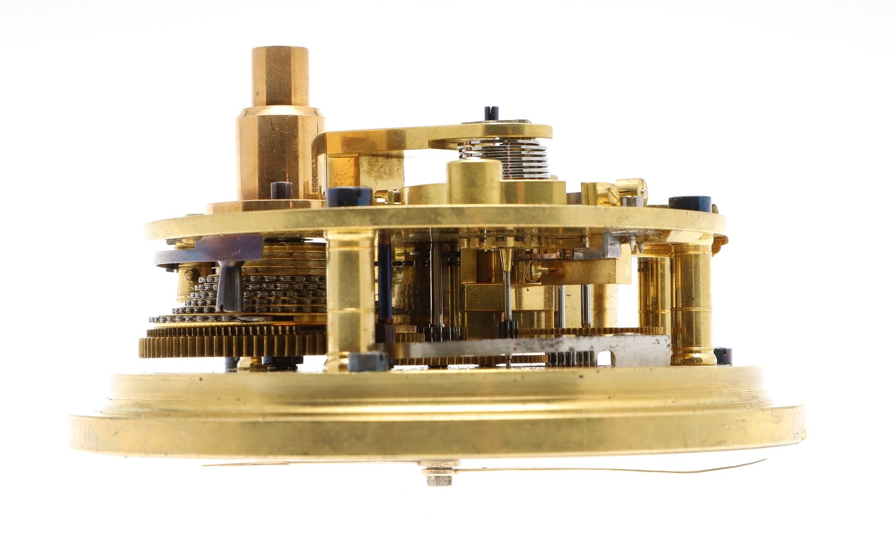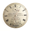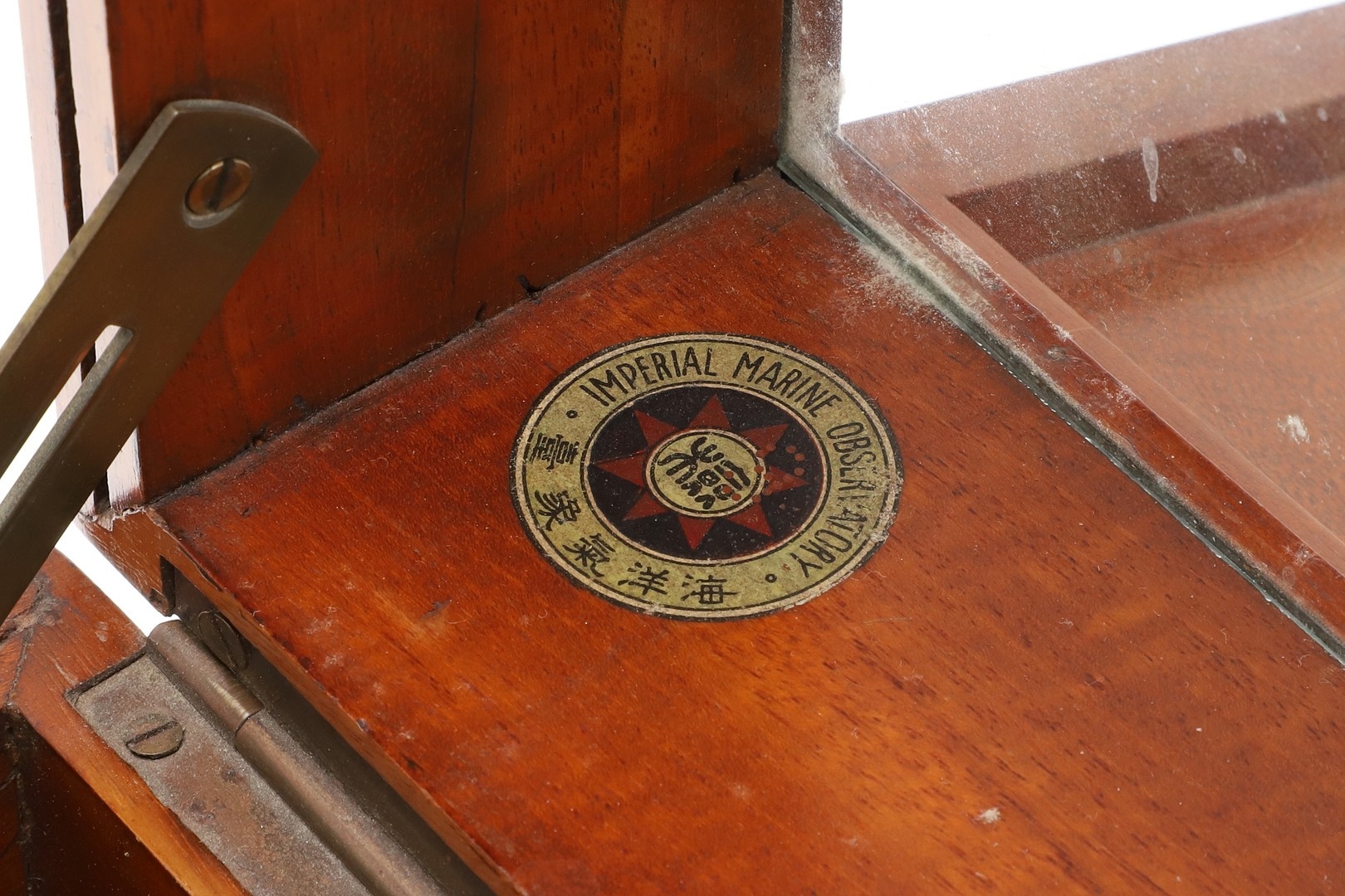 A TWO DAY MARINE CHRONOMETER BY KELVIN WHITE & HUTTON, NO. 5218. 19th century, the signed 4" silvered dial the with power reserve and seconds subsidiaries, typical chain-fusee movement, gimbal mounted in a brass bound mahogany case with recessed handles, bearing ivory maker's plaque, with winder and case key, 19cm square