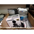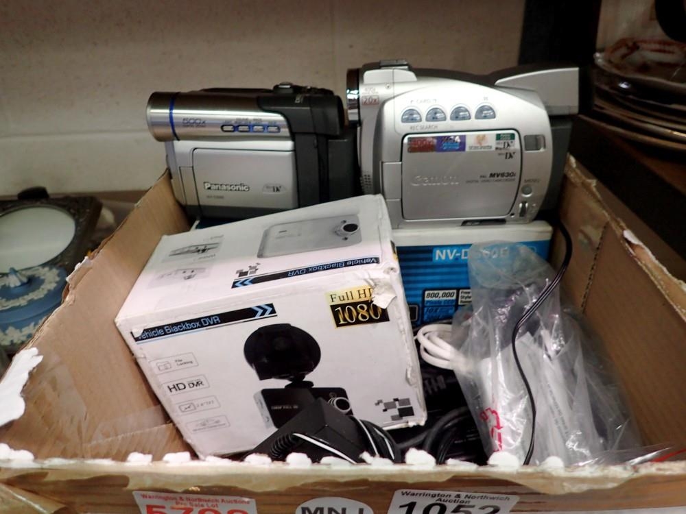 Two digital camcorders, Panasonic and Canon, with accessories