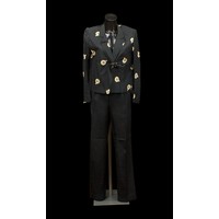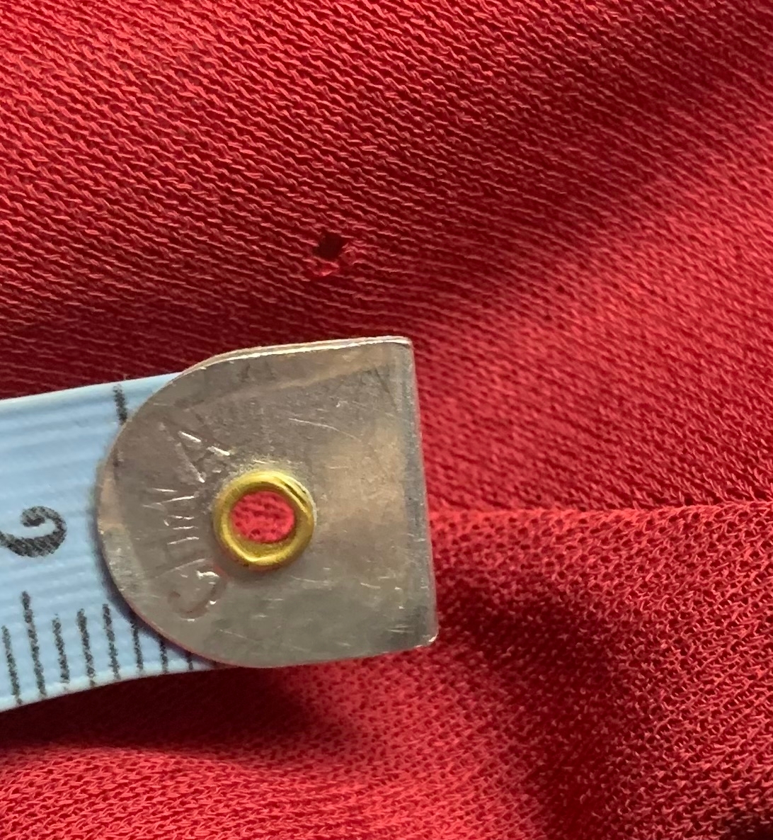 Bruce Oldfield: Belt loops present but lacking belt, small moth type hole to right shoulder.