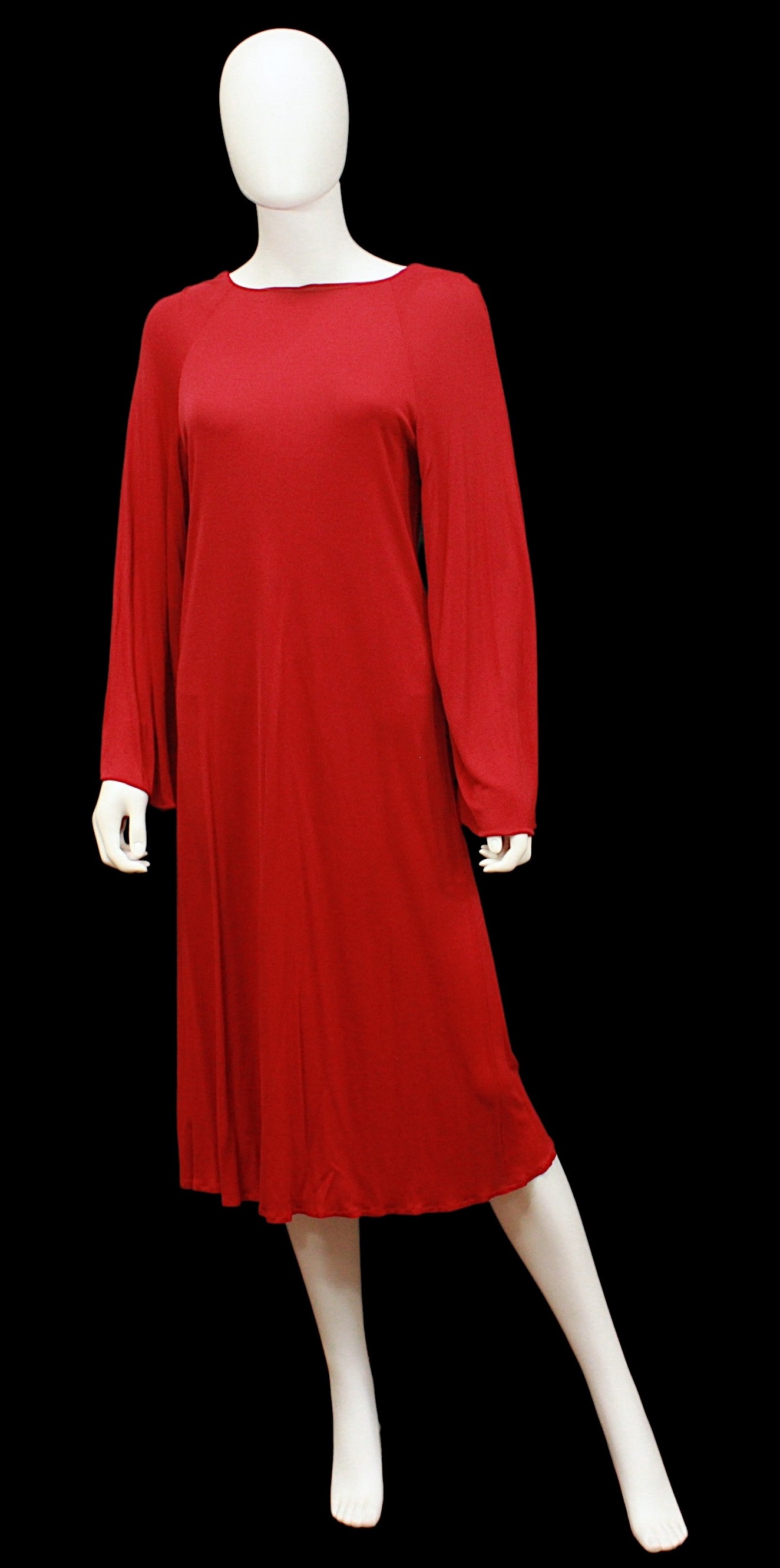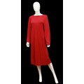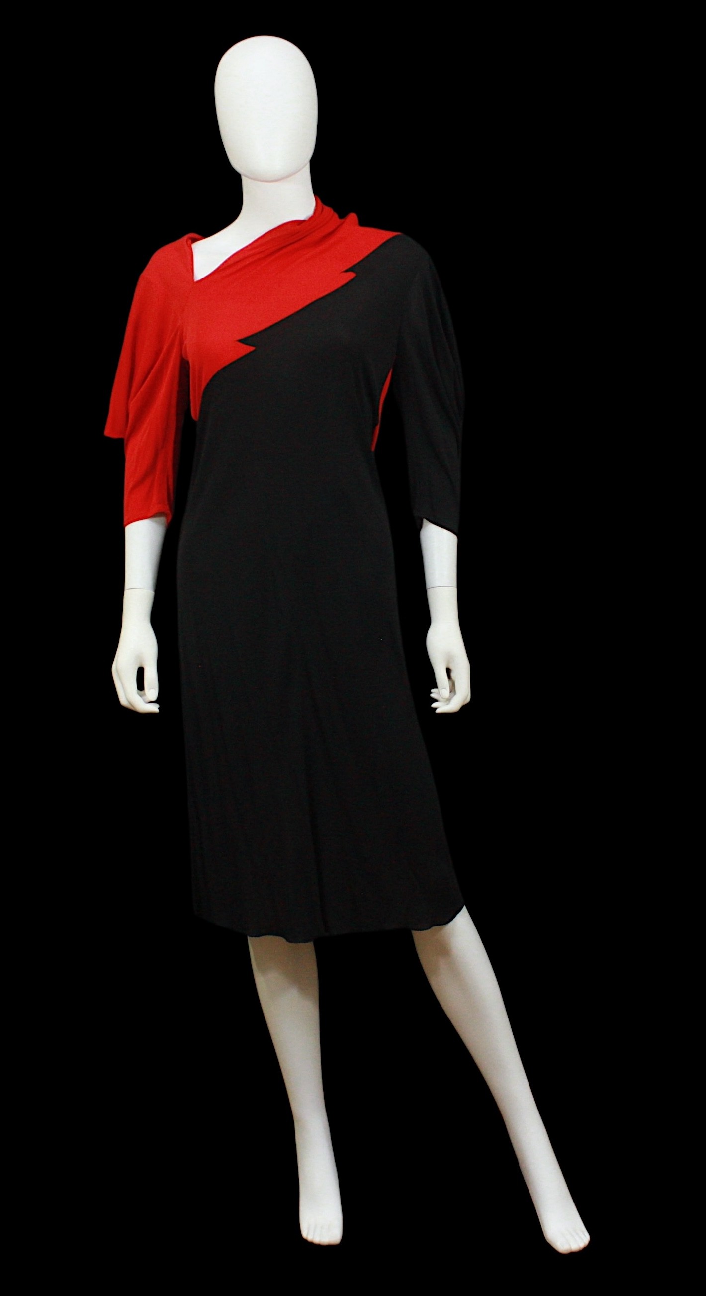 c. 1970s, of rayon, twist tie fastening to front, metal zip fastening to back, bearing label and size '10' underarm flat approximately 52cm, length approximately 120cm, together with a Bruce Oldfield burgundy midi dress, c. 1980s, in synthetic fabric, long sleeves, labelled and size '10', length 114cm approximately, and a Janice Wainwright red and black midi dress, zig zag design, c. 1980s, in viscose, labelled and size '12', length approximately 120cm (3)