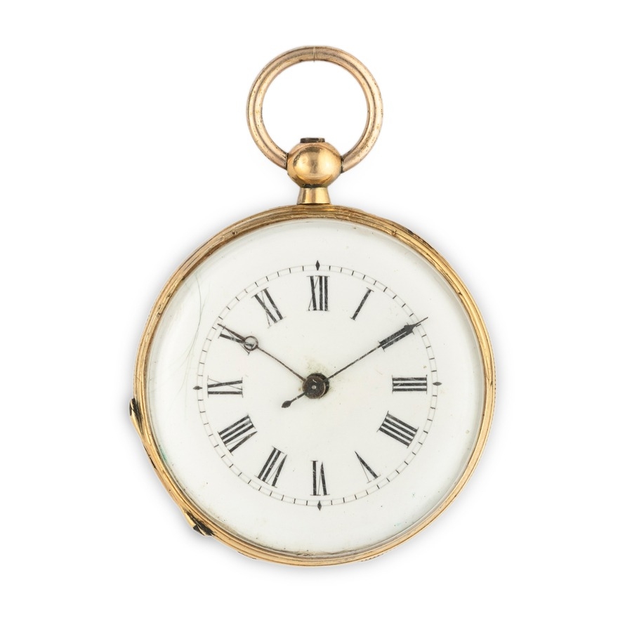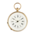 ALEX CONRE ET CIE GENEVE, AN 18K GOLD, OPEN FACE POCKET WATCH WITH ENAMELS SWITZERLAND 1870 CIRCA