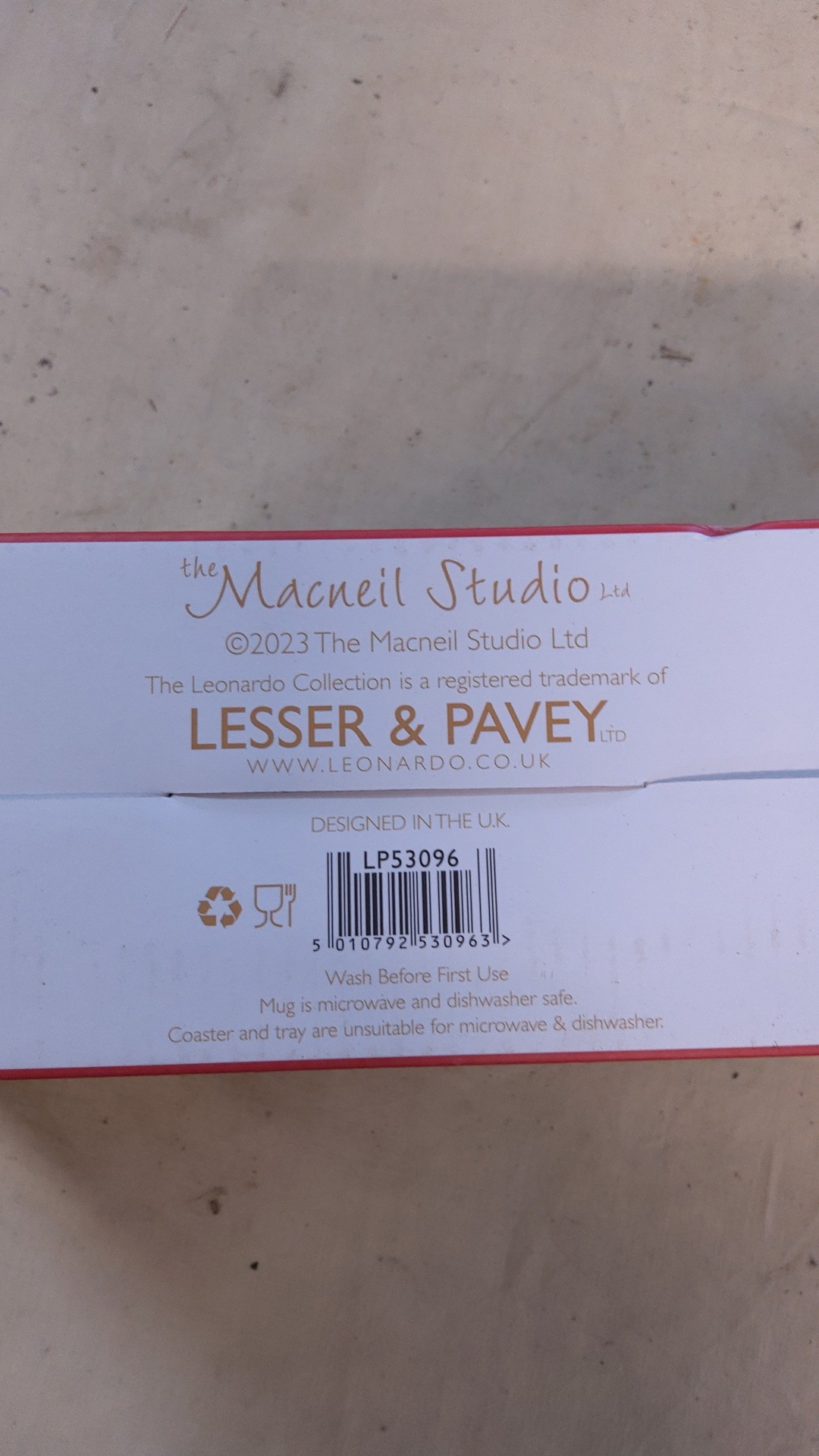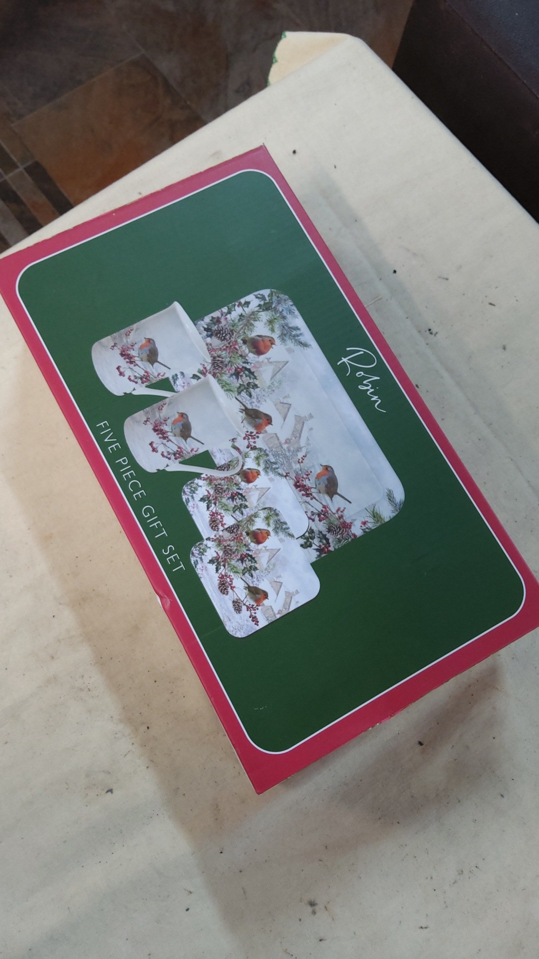 Five-piece gift set comprising two ceramic mugs, two coasters and a rectangular tray, decorated with robins and winter foliage; boxed. The Macneil Studio for Lesser & Pavey Ltd, Leonardo Collection, designed in the U.K., LP53096.