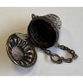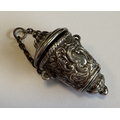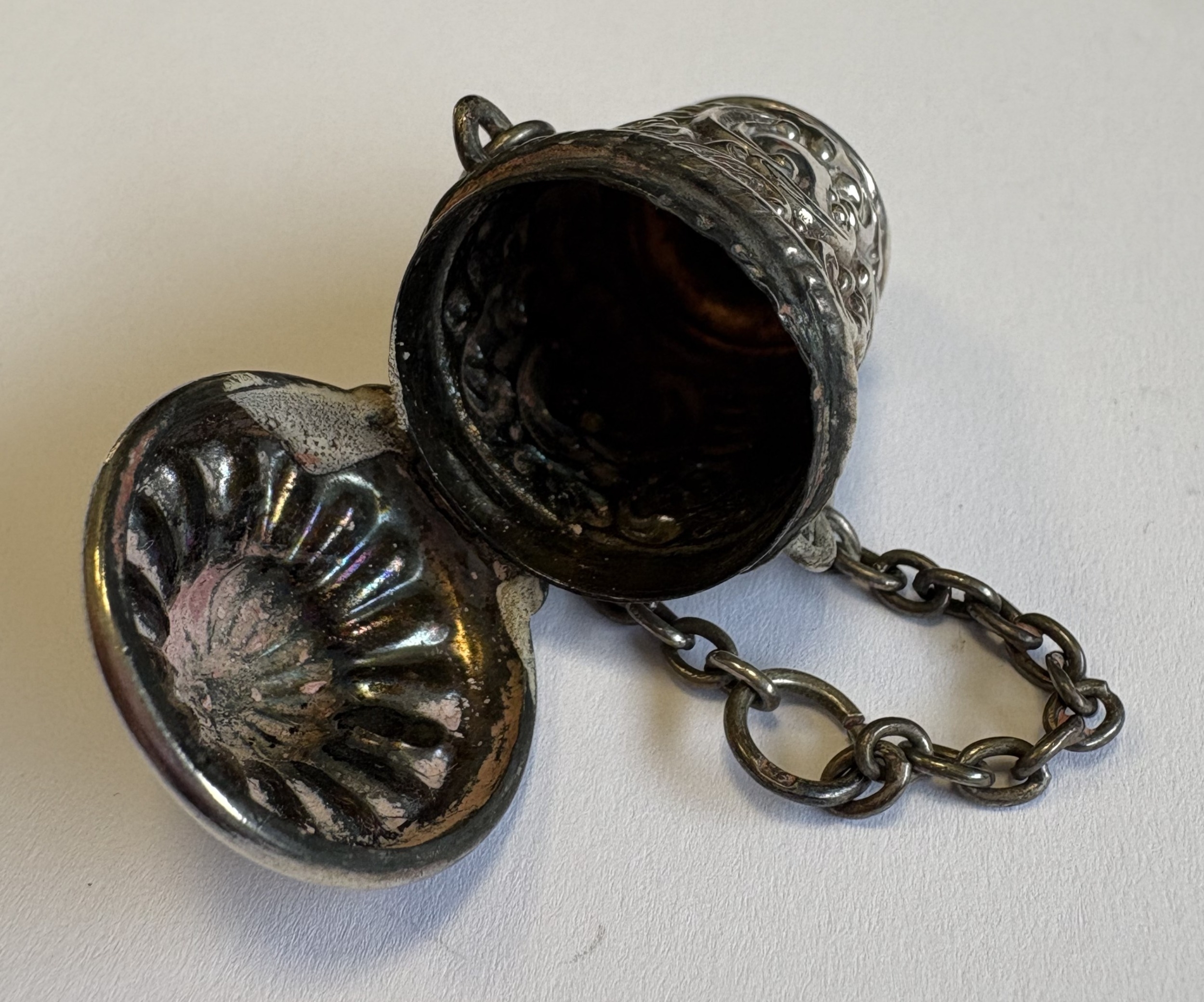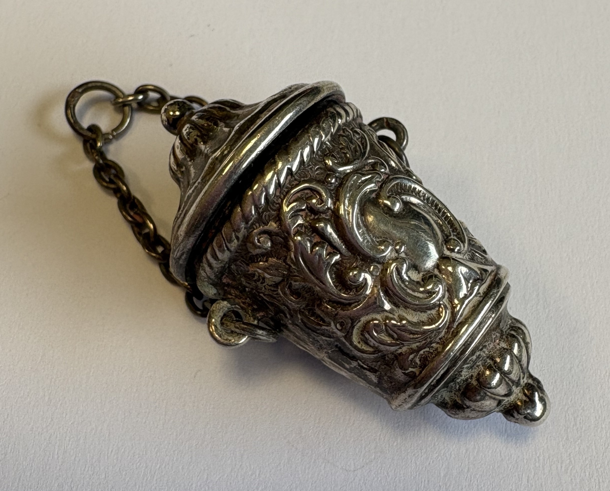 A Victorian silver chatelaine thimble case with chased decoration. Approx. 11 grams. Est. £20 - £30.